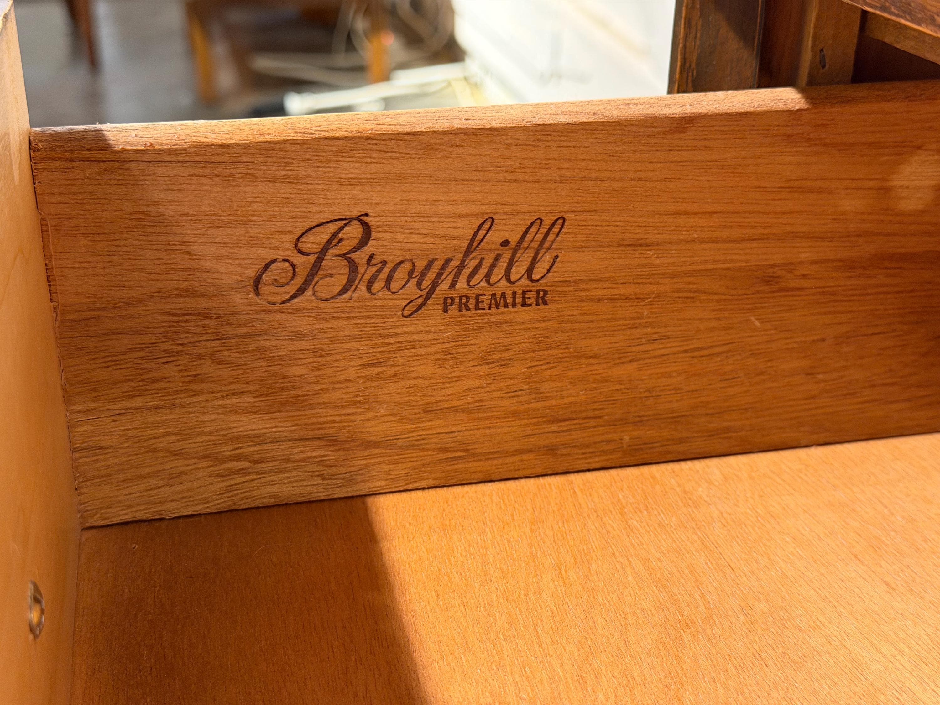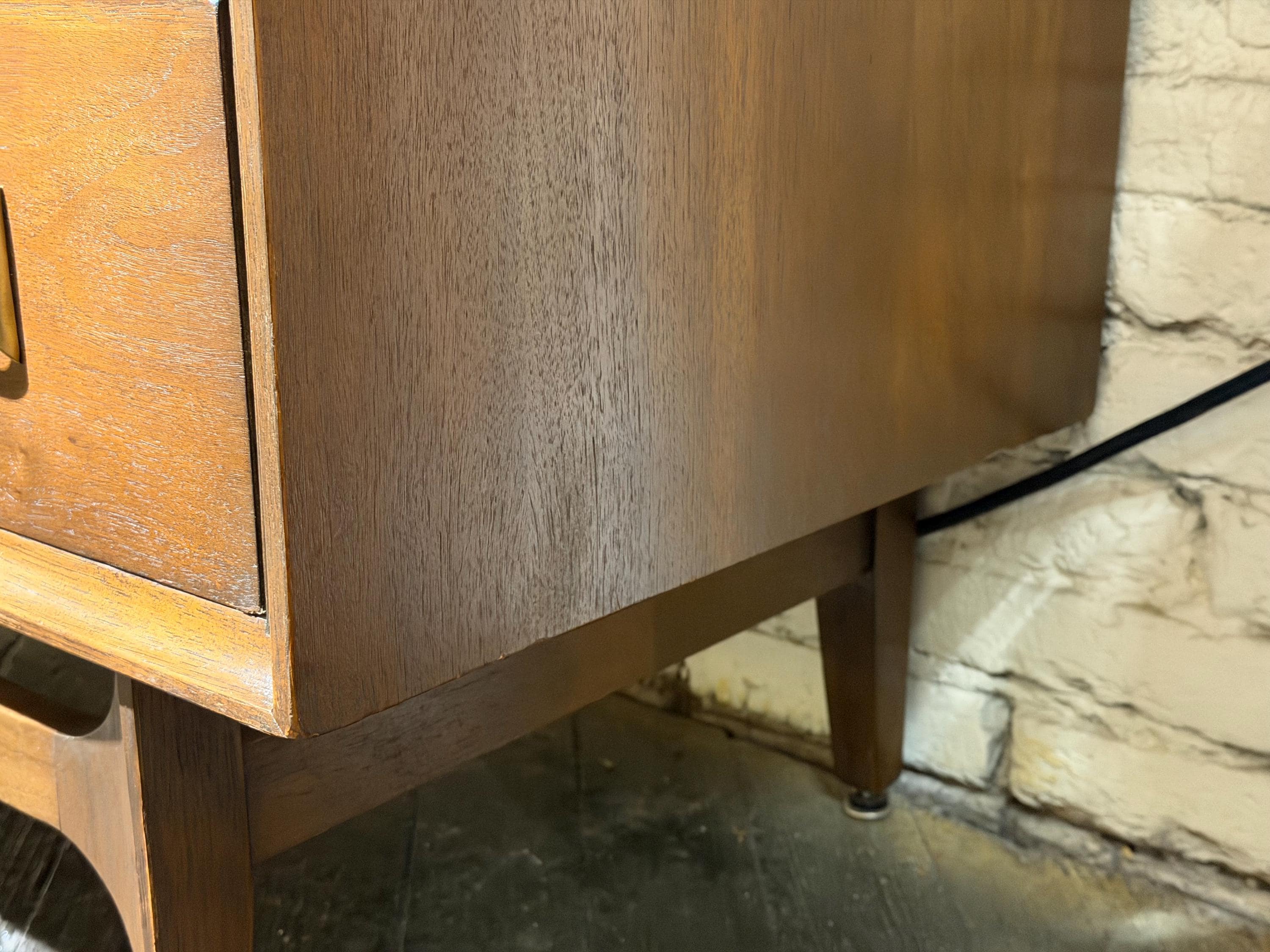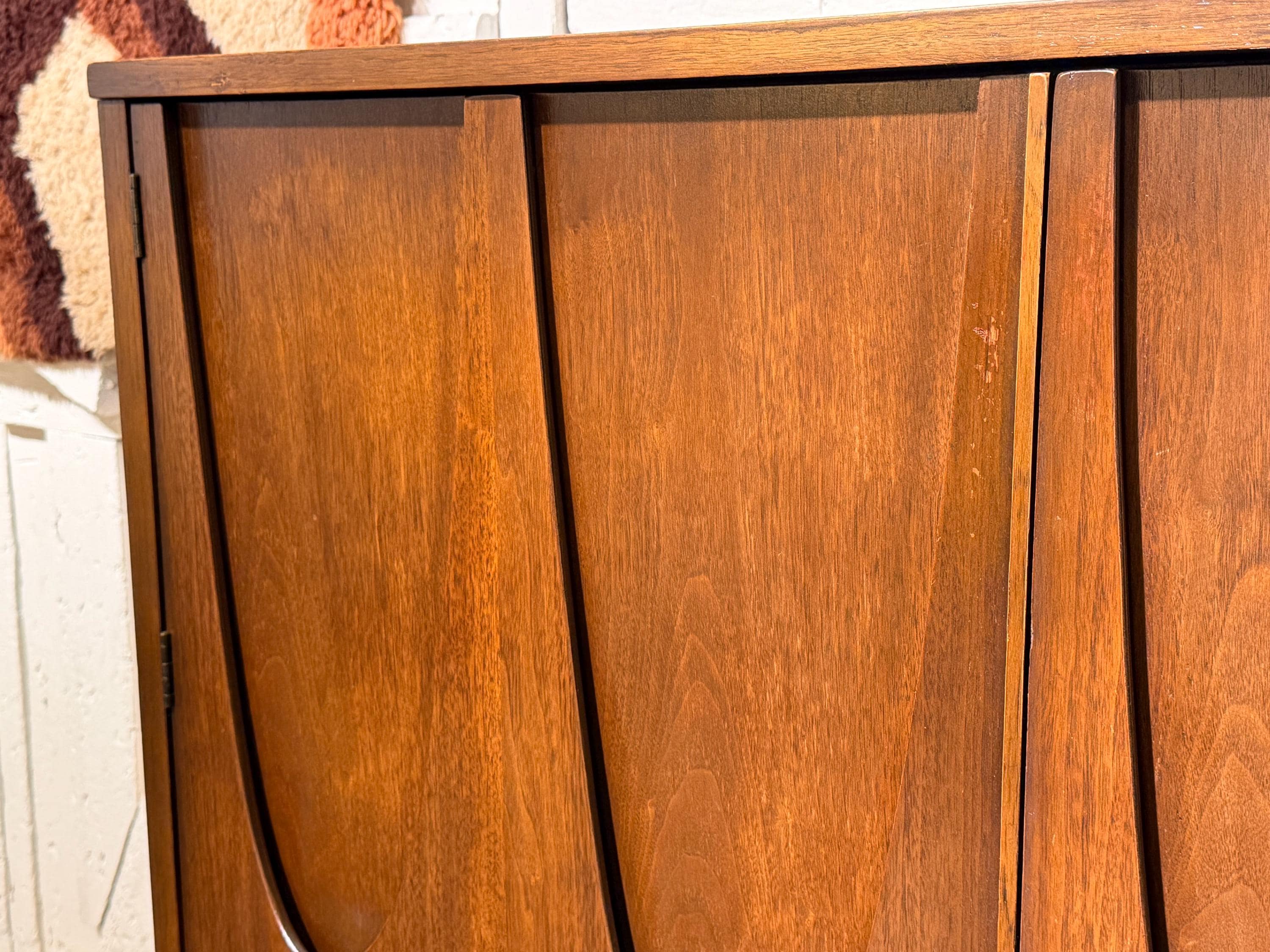 Here is a beautiful walnut gentleman’s chest by Broyhill for their Brasilia line, circa 1960s. If you are looking for a stylish piece with numerous storage options, then this is the perfect choice for you. All drawers glide smoothly, and this piece underwent a thorough review in our workshop. This piece looks great and has very minimal signs of wear, mostly to the original finish. Two small blemishes on the top can be seen with a close inspection, a small amount of discoloration to the doors from age/use, and all of these minor issues can be seen in our last few images. We have considered this wear when pricing this piece. Please reach out if you have any questions.