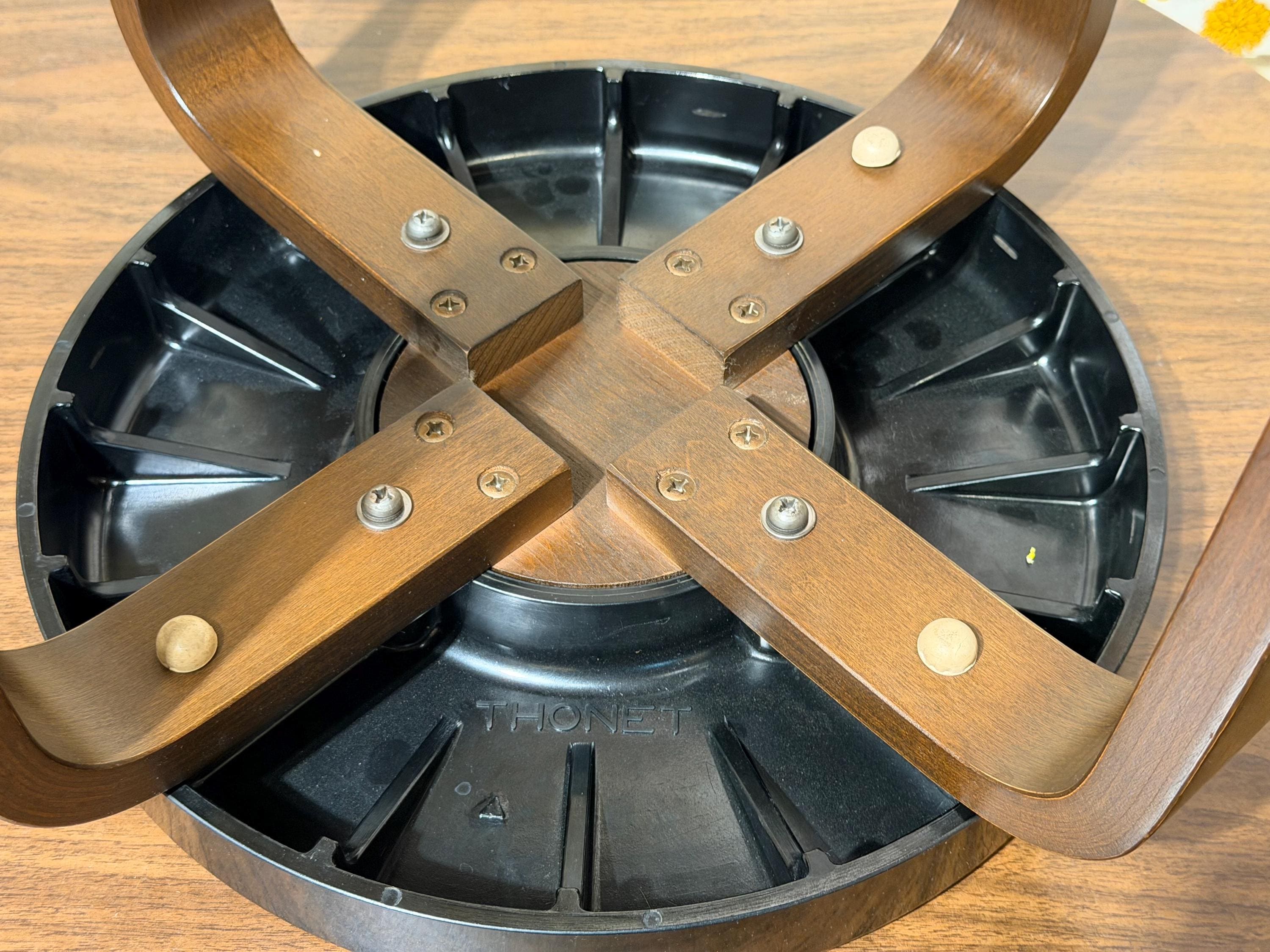 The seat is molded plastic (often referred to as Bakelite), finished in a dark brown tone, with the Thonet name embossed on the underside. The legs have been carefully cleaned and show light, age-appropriate wear consistent with use. The stool sits solidly and sturdily.