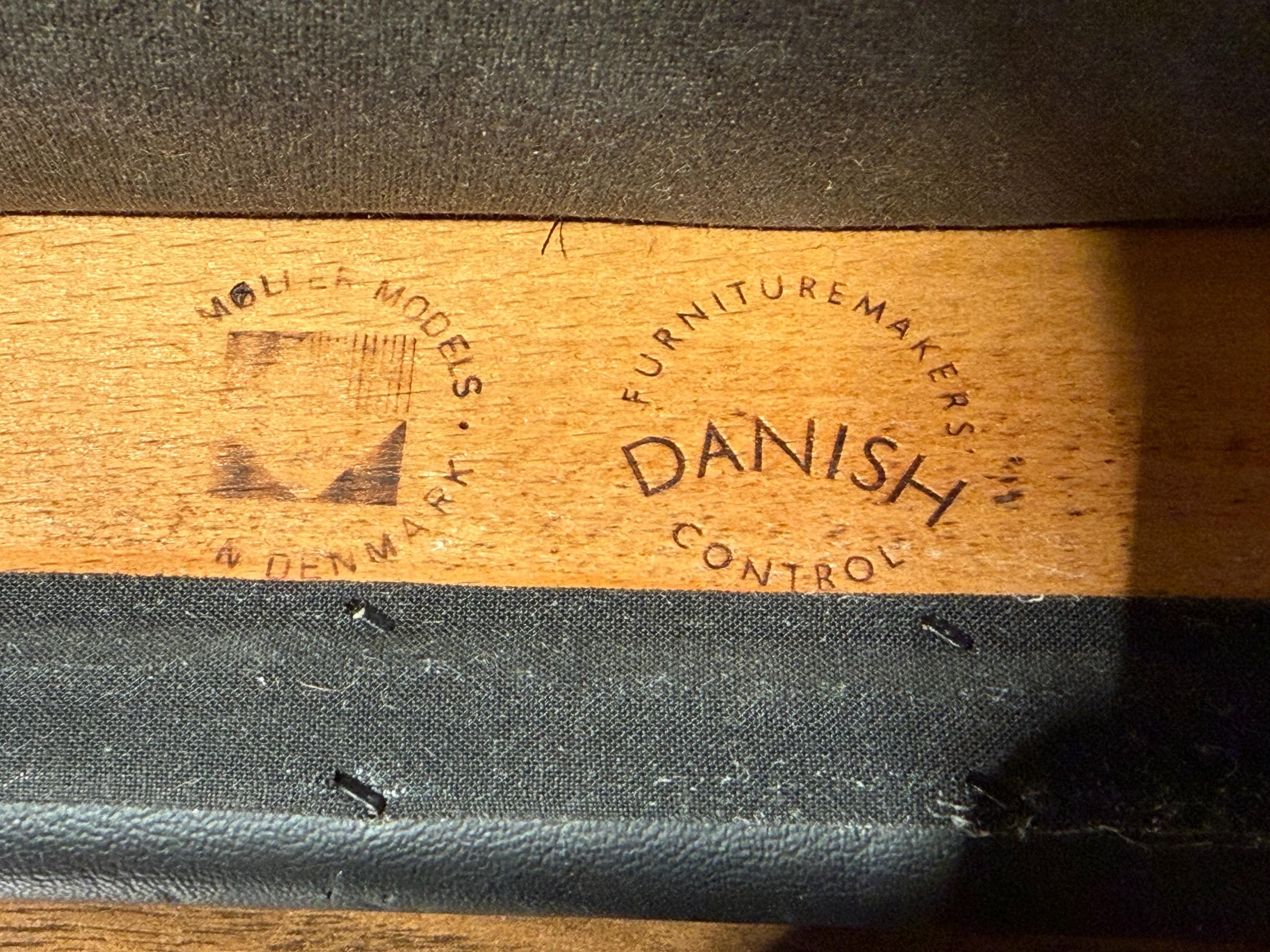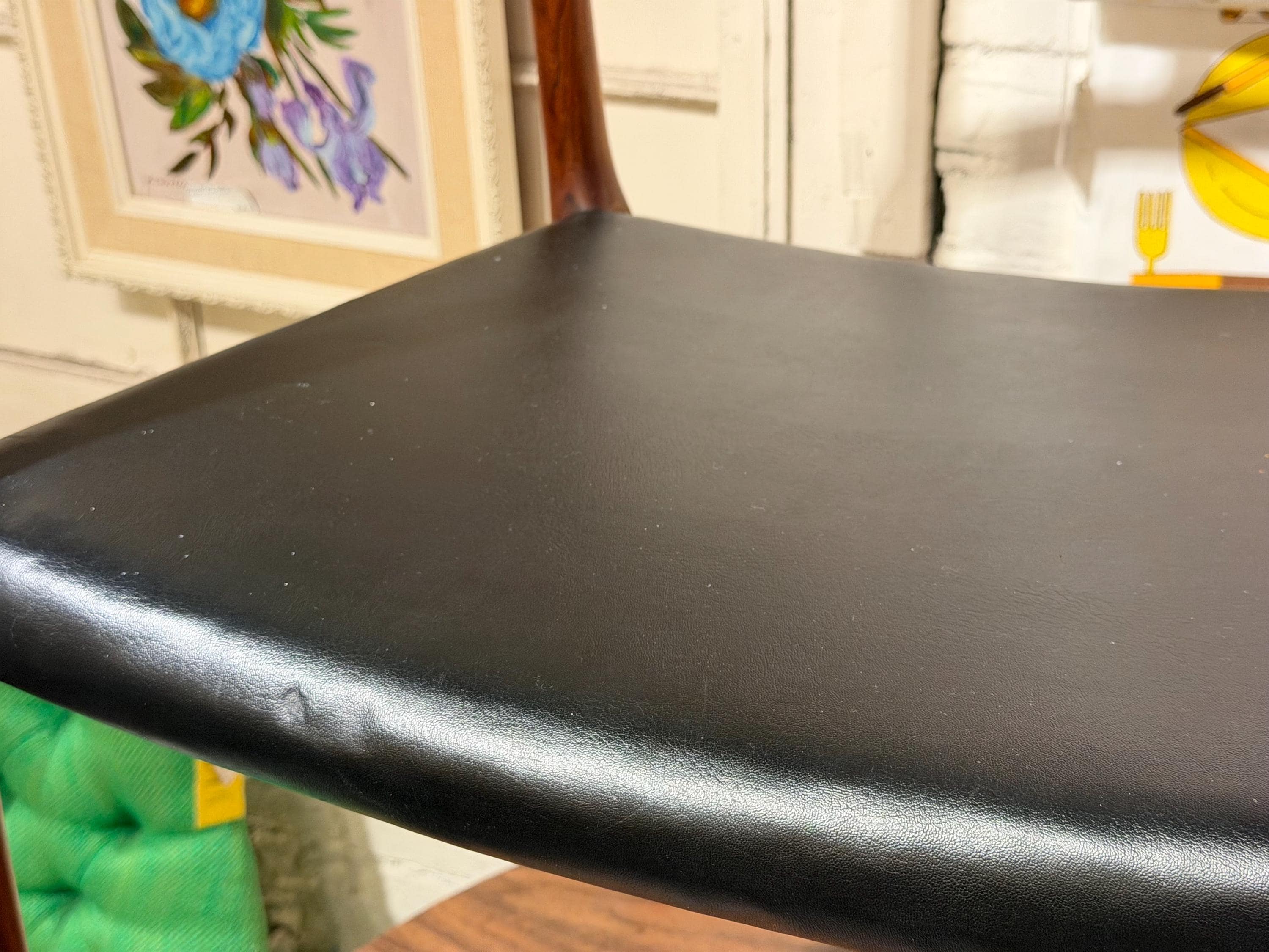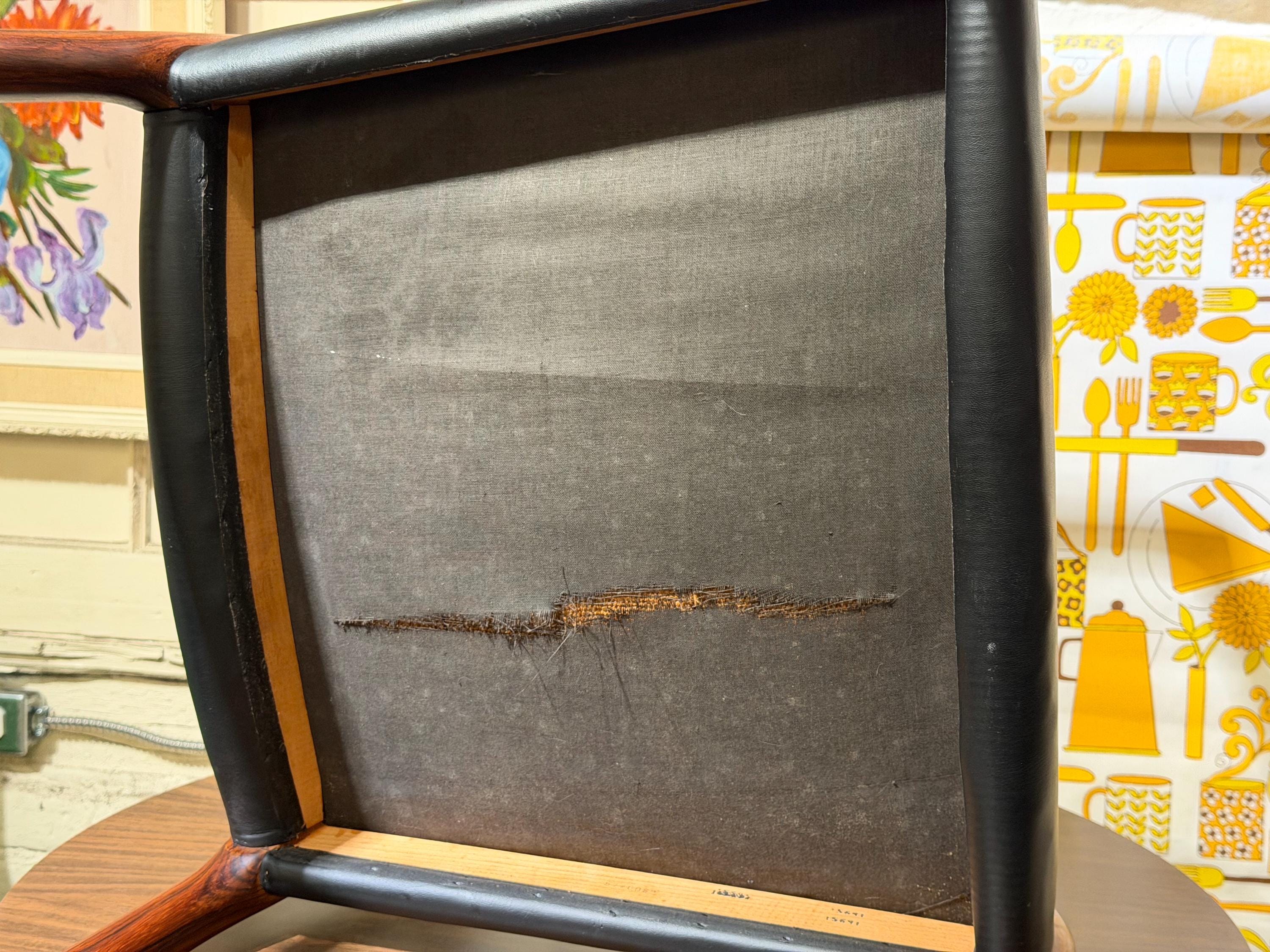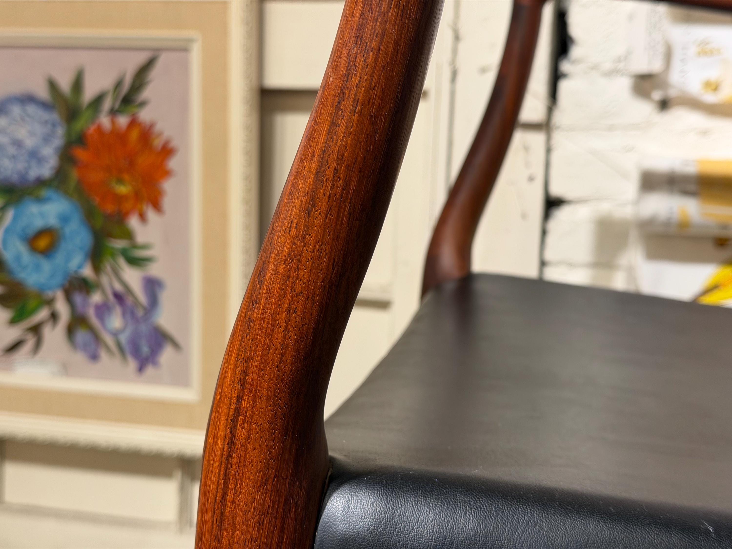 This Niels Otto Møller Model No. 64 armchair is crafted in rosewood with an original black leather seat. The chair is stamped by the maker and retains its Danish Control label, a distinction reserved for the highest-quality pieces exported from Denmark during the mid-century era.