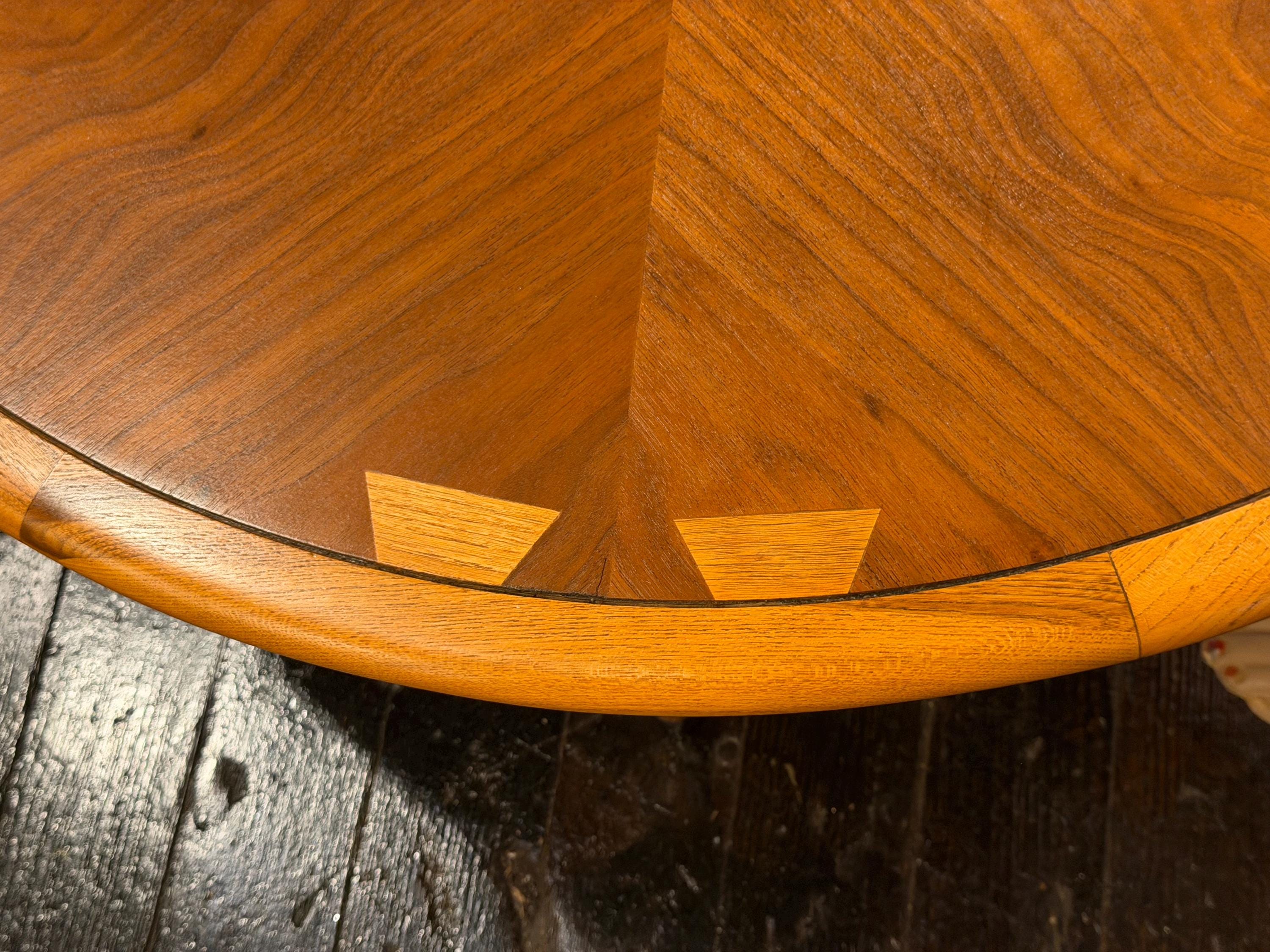This 1960s Lane Acclaim round coffee table features a rich walnut grain tabletop and showcases the Acclaim line’s signature dovetail detailing along the edges, paired with black-tipped feet. The table is solid, sturdy, and signed by the maker.