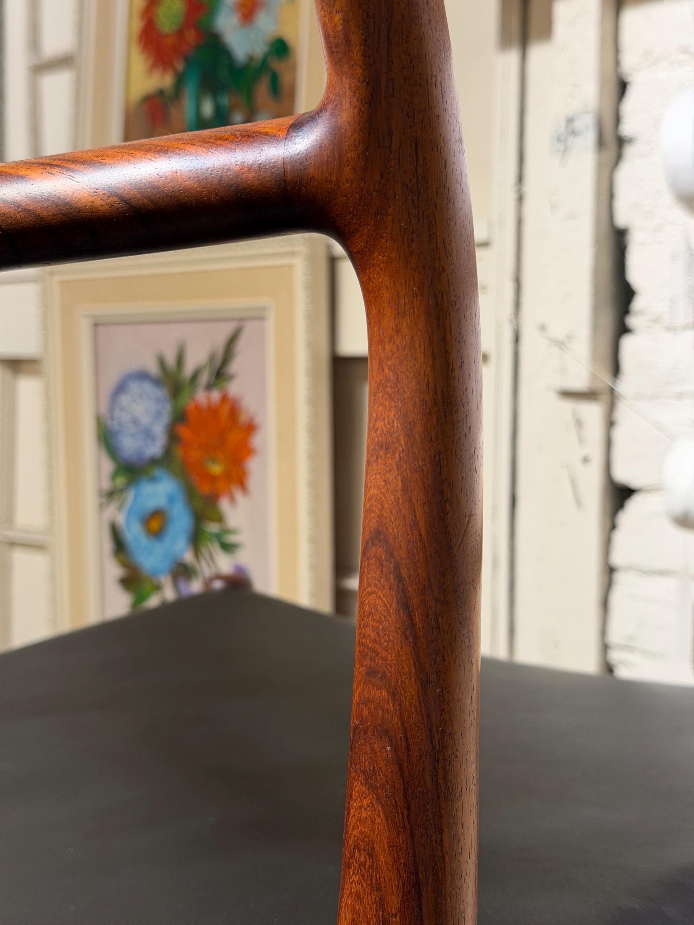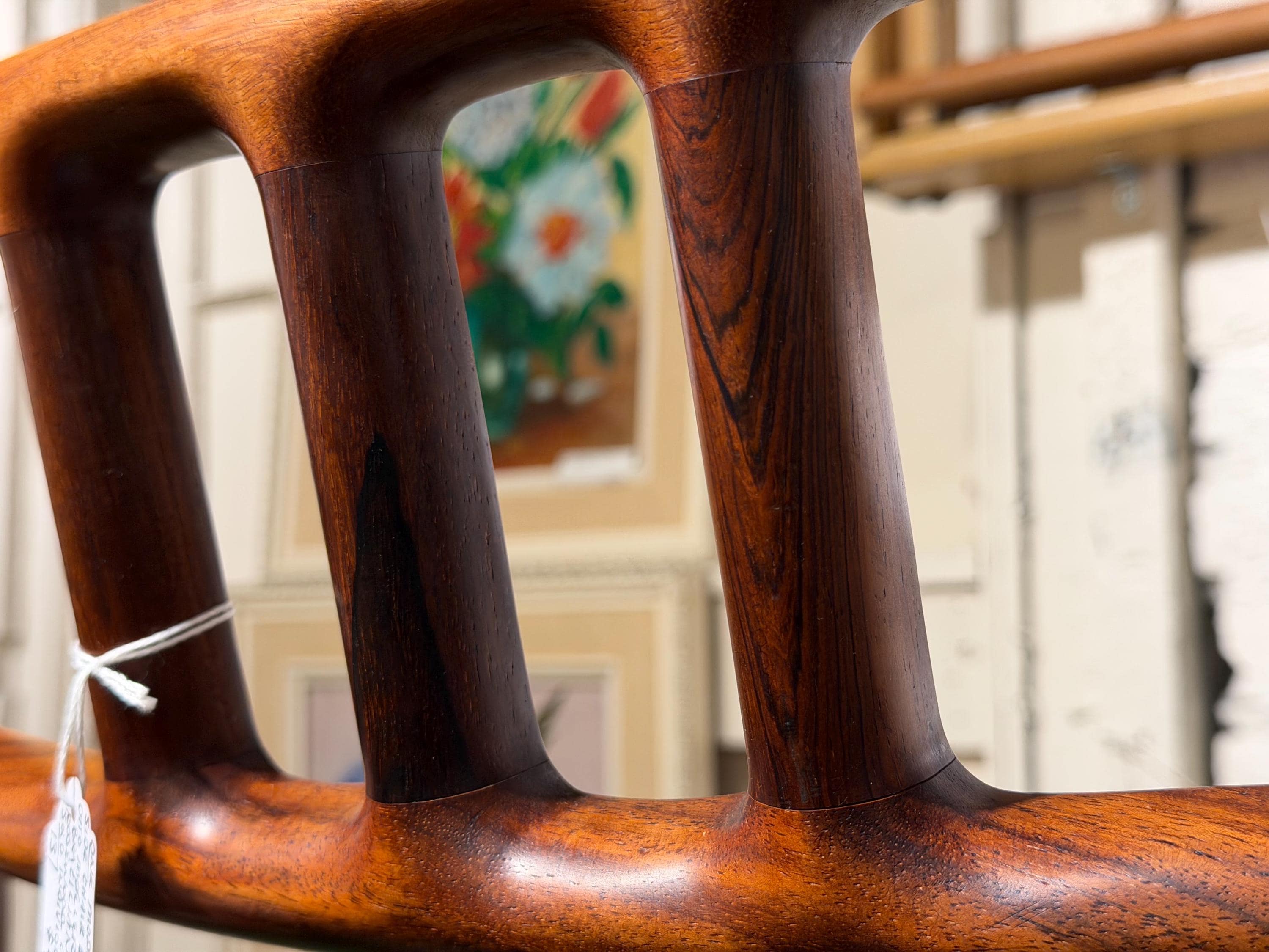 Dating to the 1960s, this chair showcases exceptional rosewood grain throughout the frame. The wood has been carefully polished to highlight its natural beauty and shows only minimal, age-appropriate wear from use. The chair sits solidly and sturdily, and the sculptural design offers exceptional comfort, gently embracing the sitter.