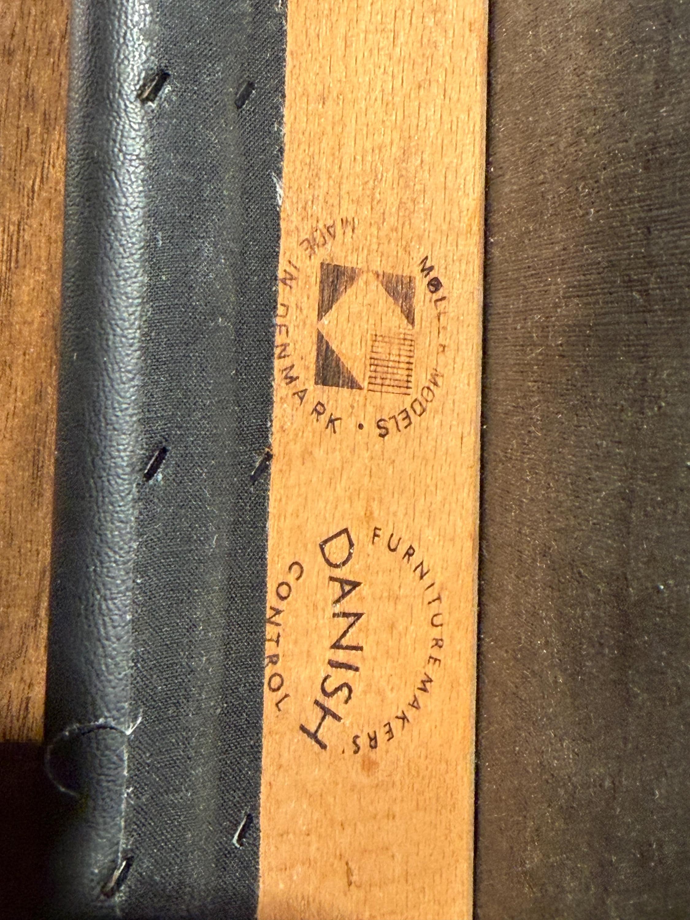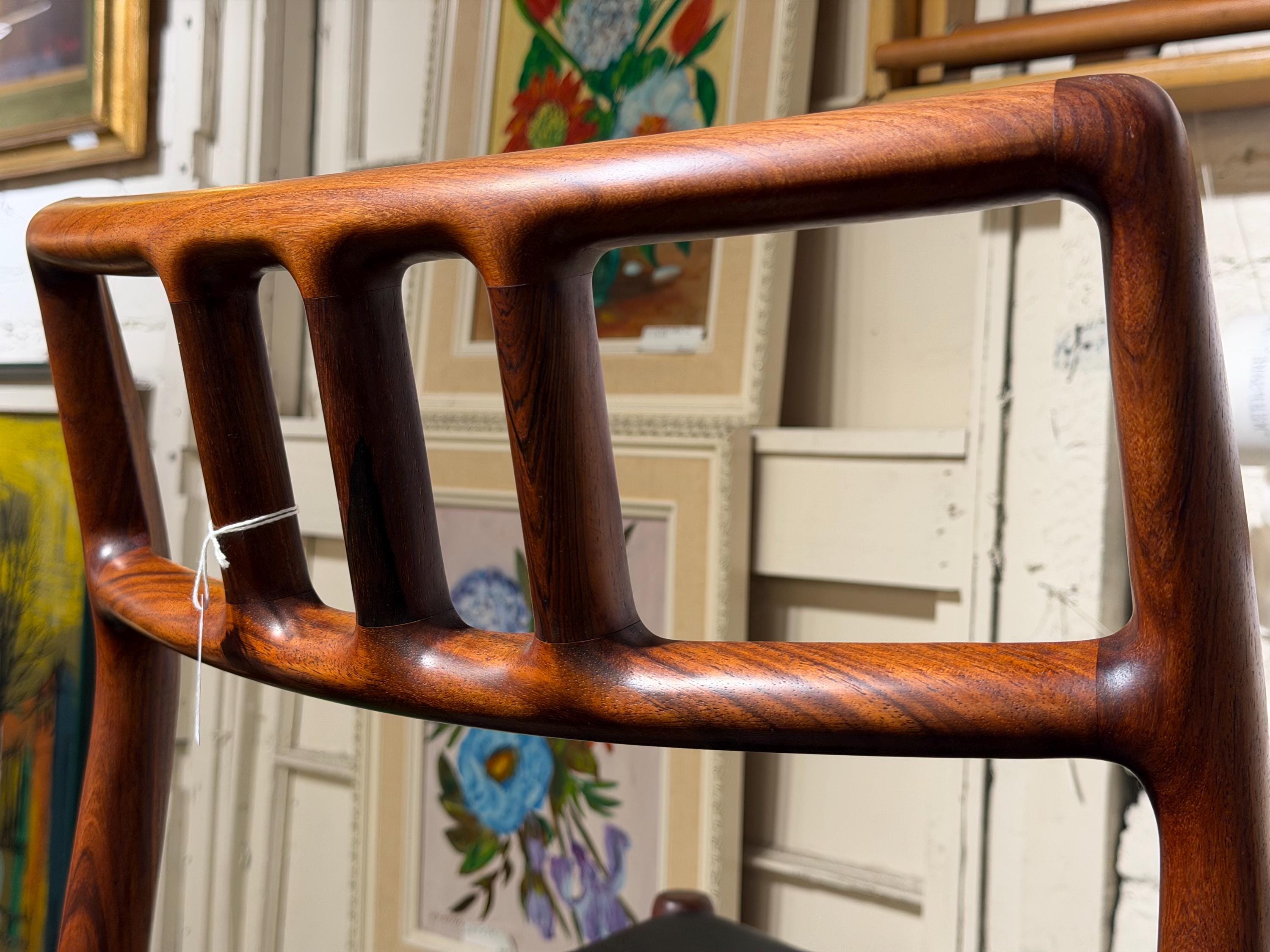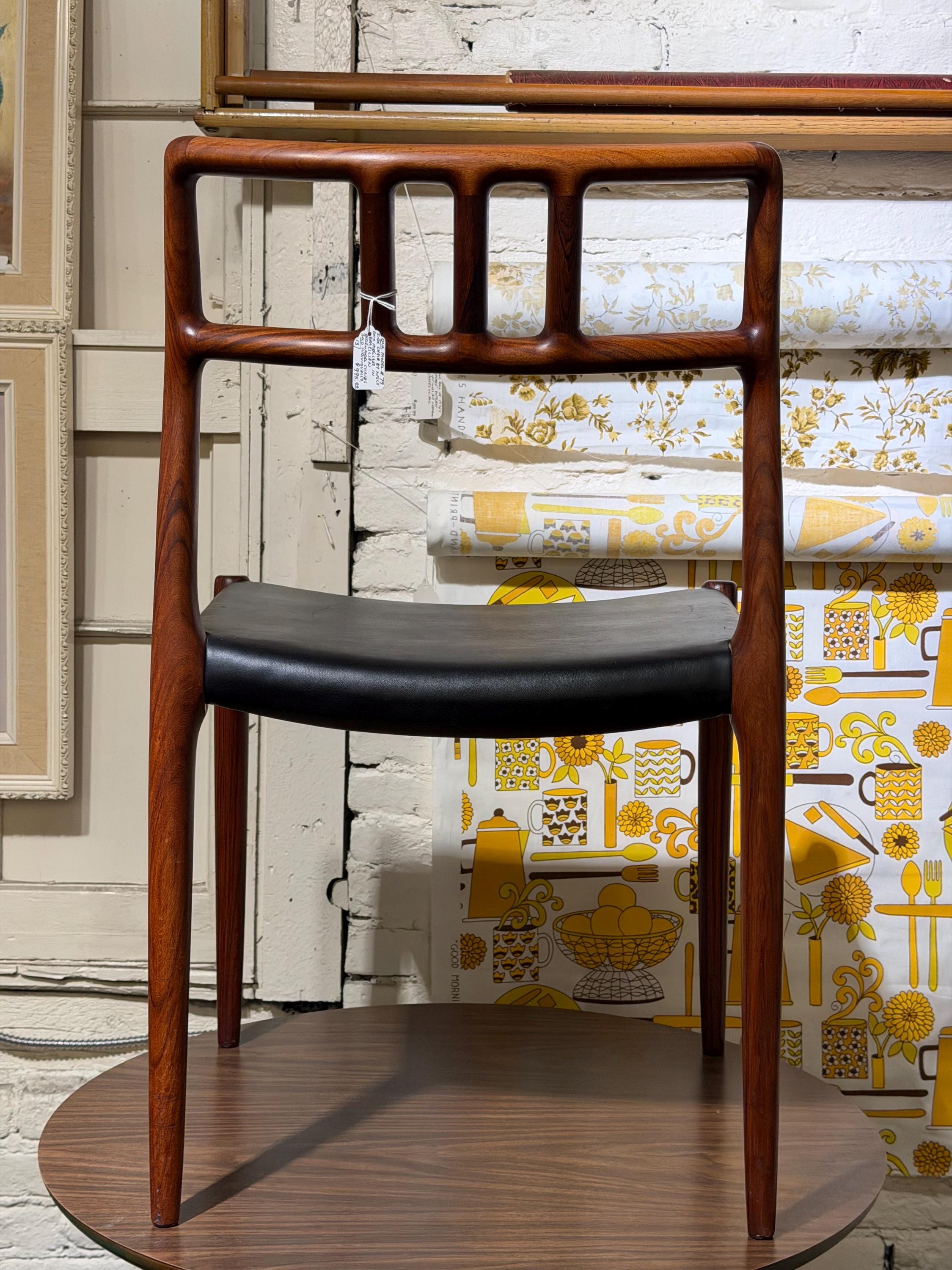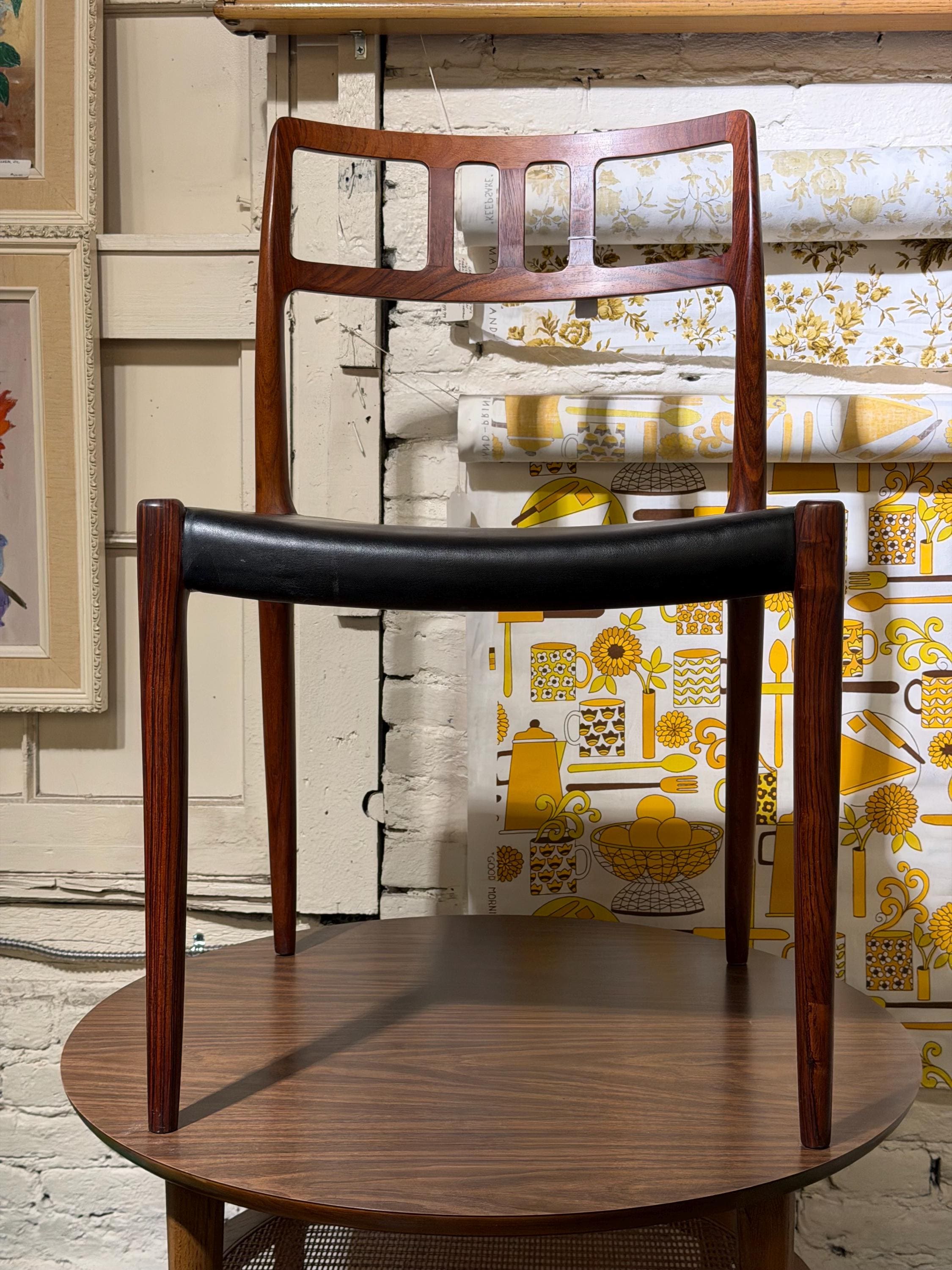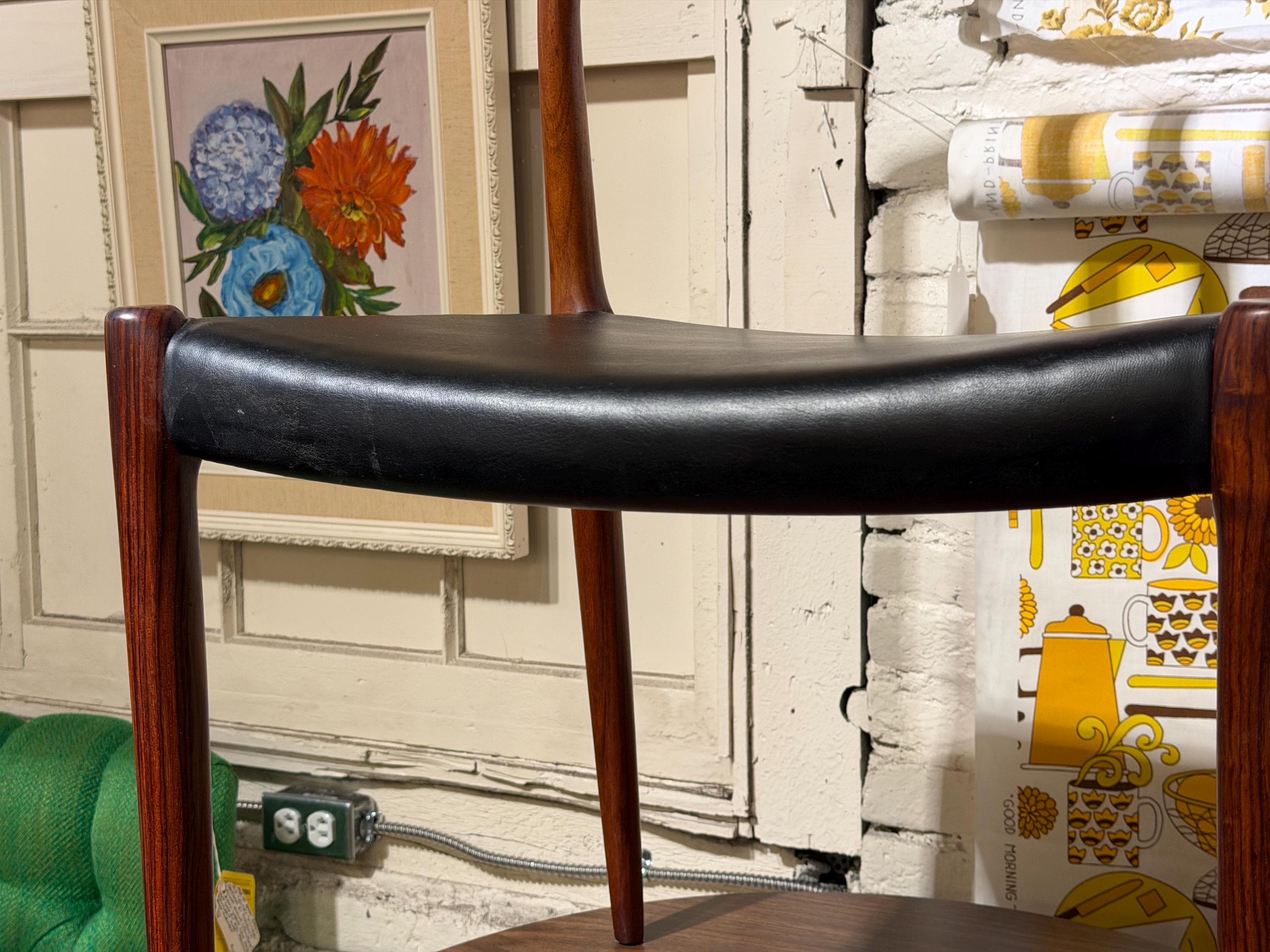 This Niels Otto Møller Model No. 79 side chair is crafted in rosewood with an original black leather seat. The chair is stamped by the maker and retains its Danish Control label, a distinction reserved for the highest-quality pieces exported from Denmark during the mid-century era.