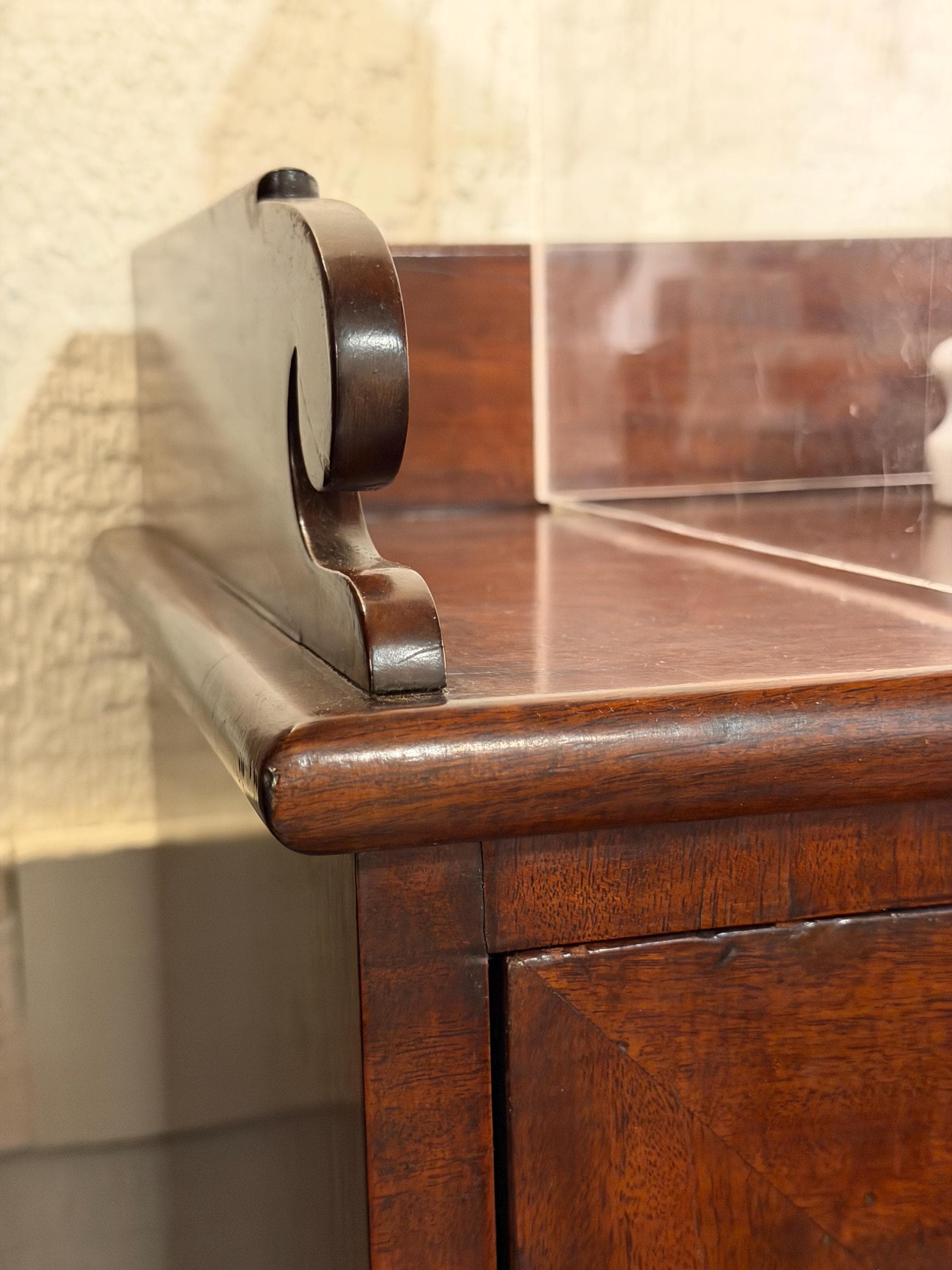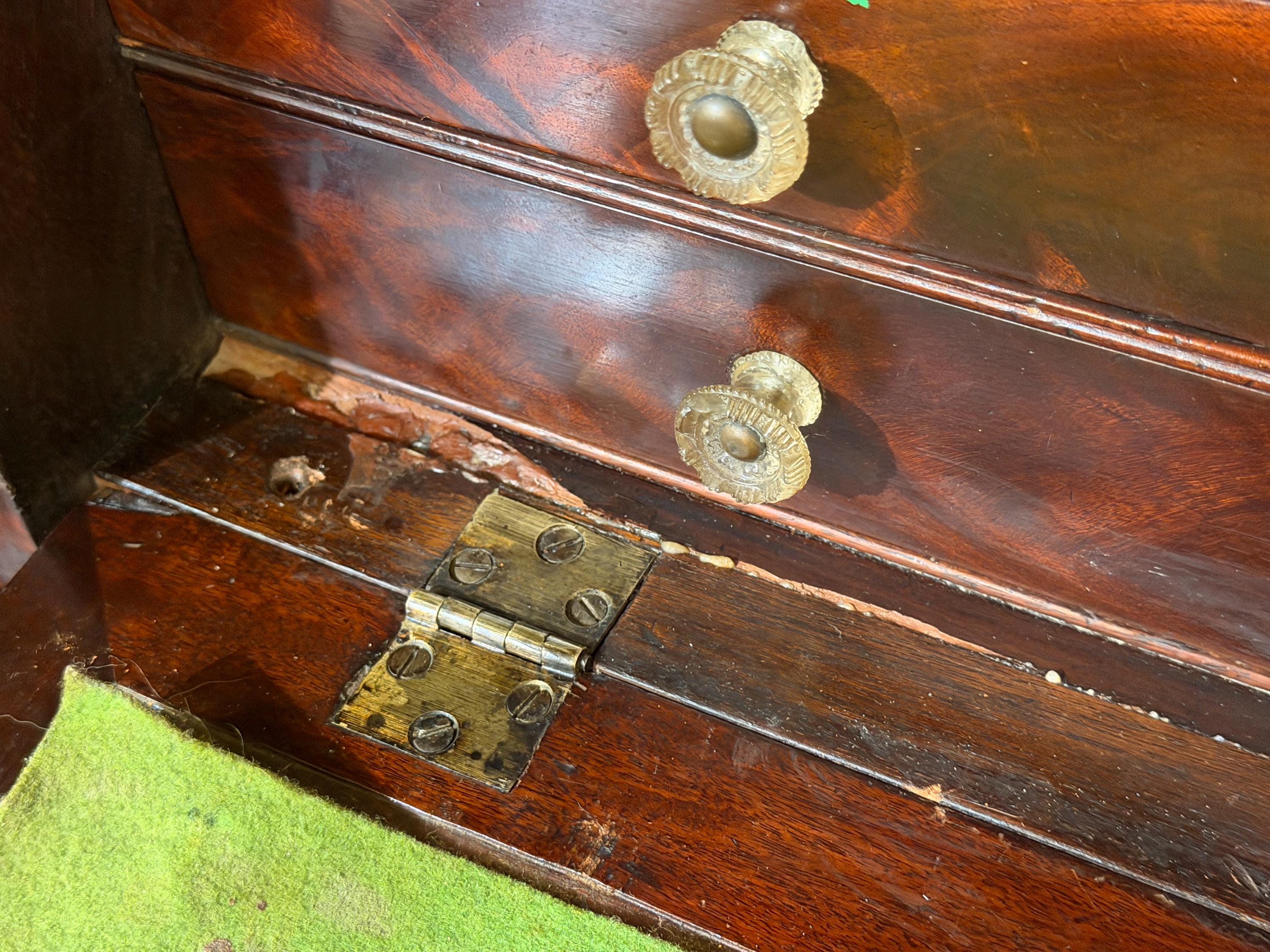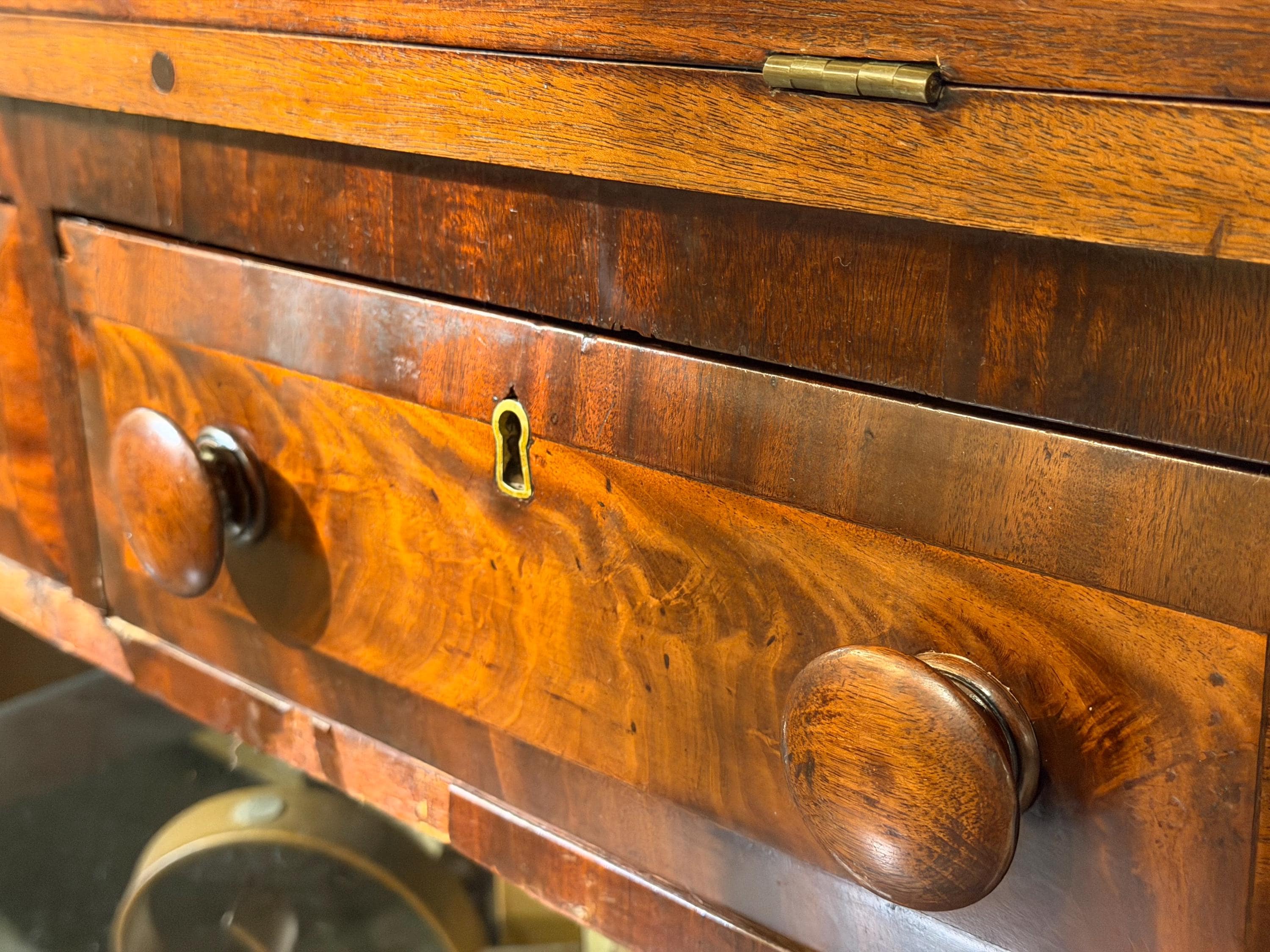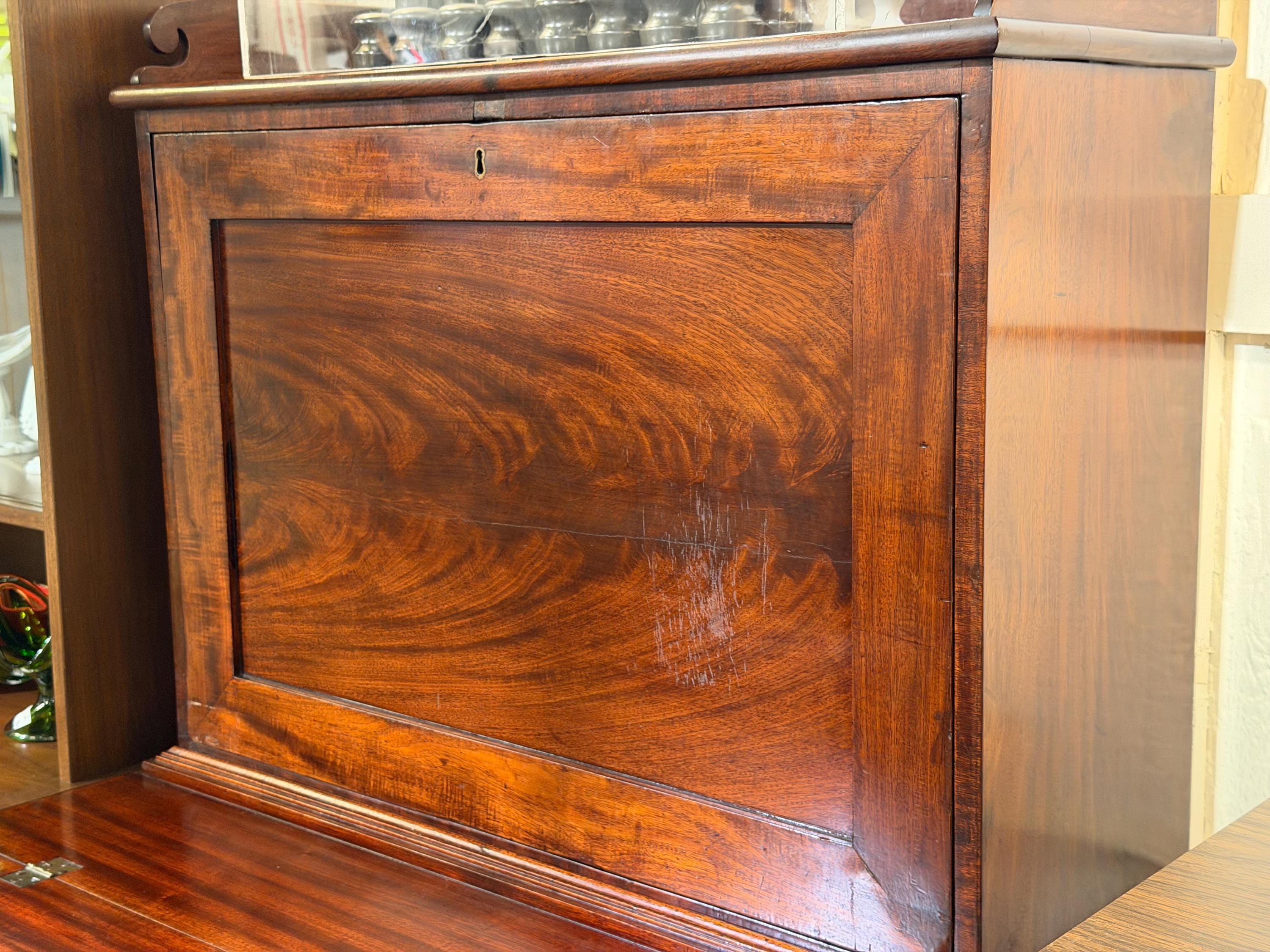 Condition-wise, the piece shows honest wear consistent with age and use. There is some veneer loss at the knee area of the base, visible in the photos, as well as general surface wear throughout. A small repair was made to the left side of the upper section, visible when the fall-front is opened. Despite these age-related imperfections, the desk remains sturdy and functional.