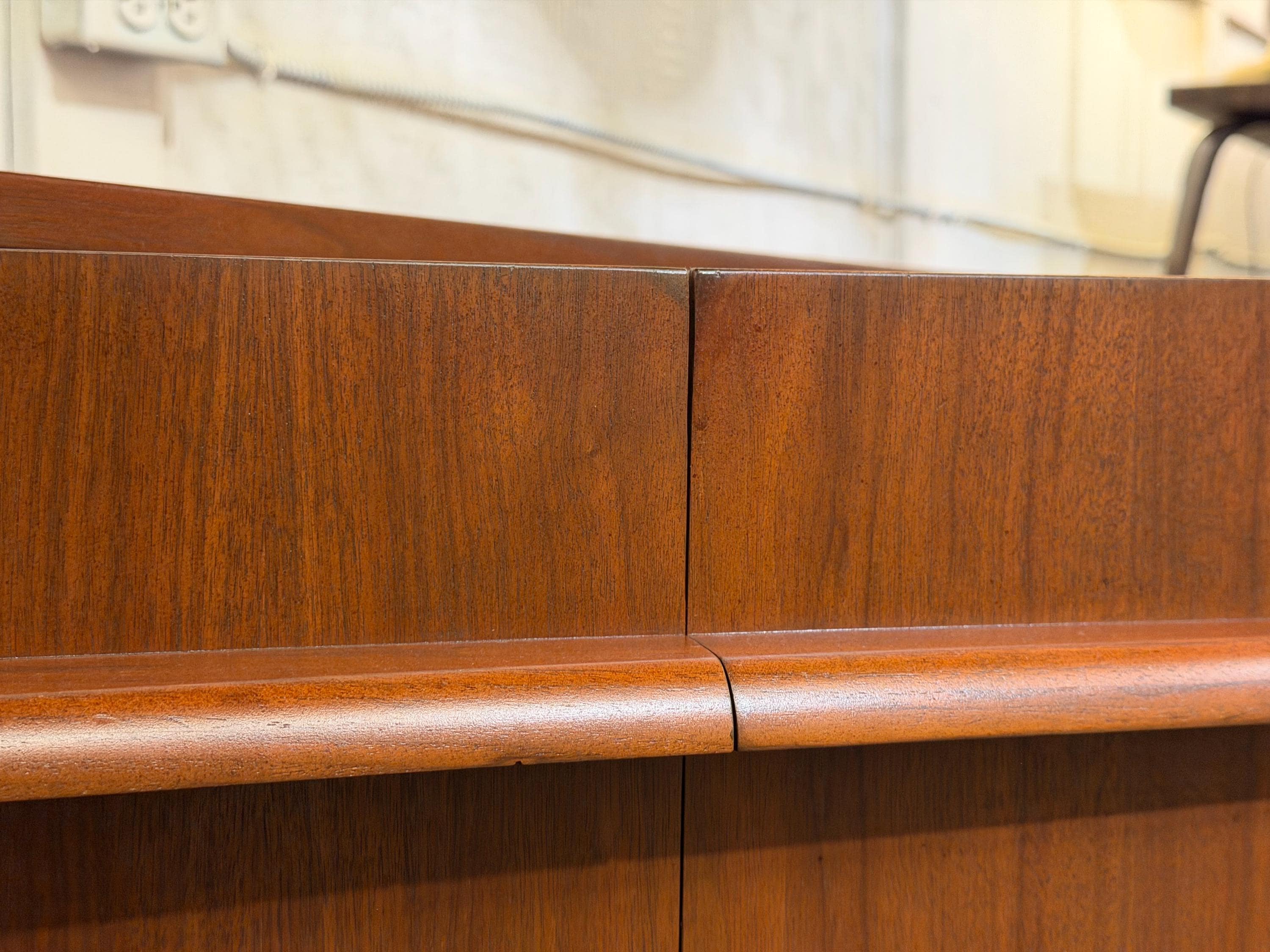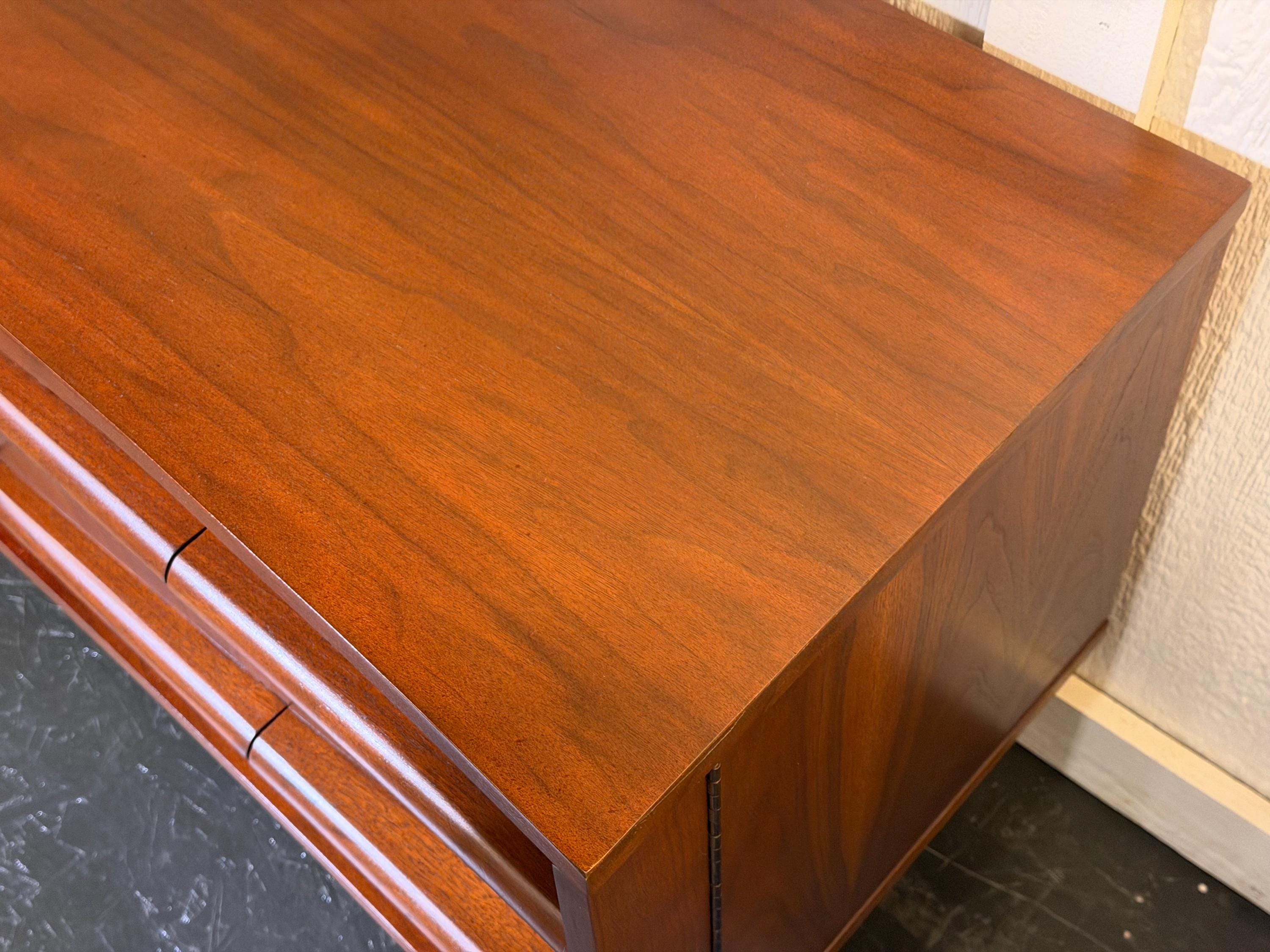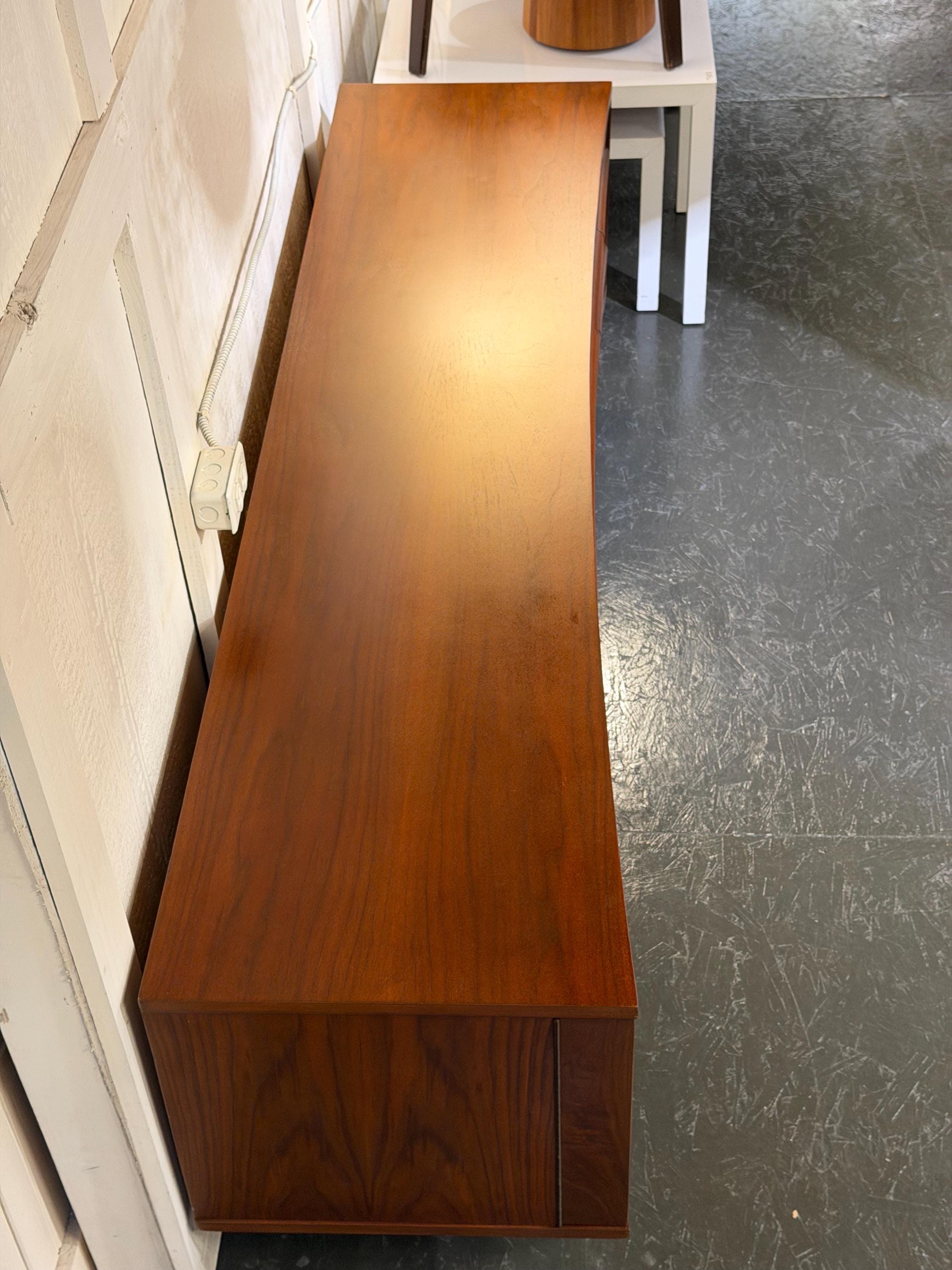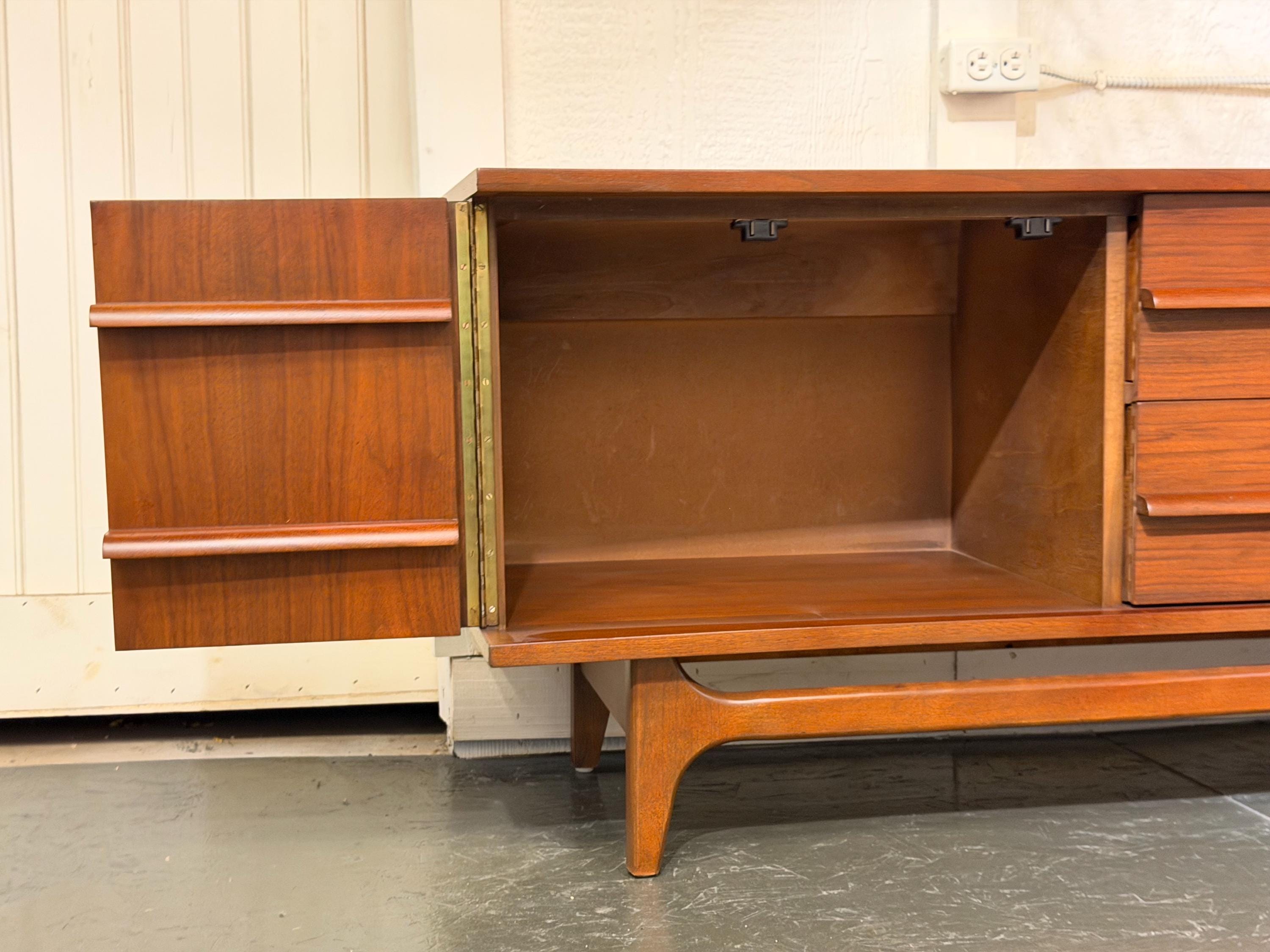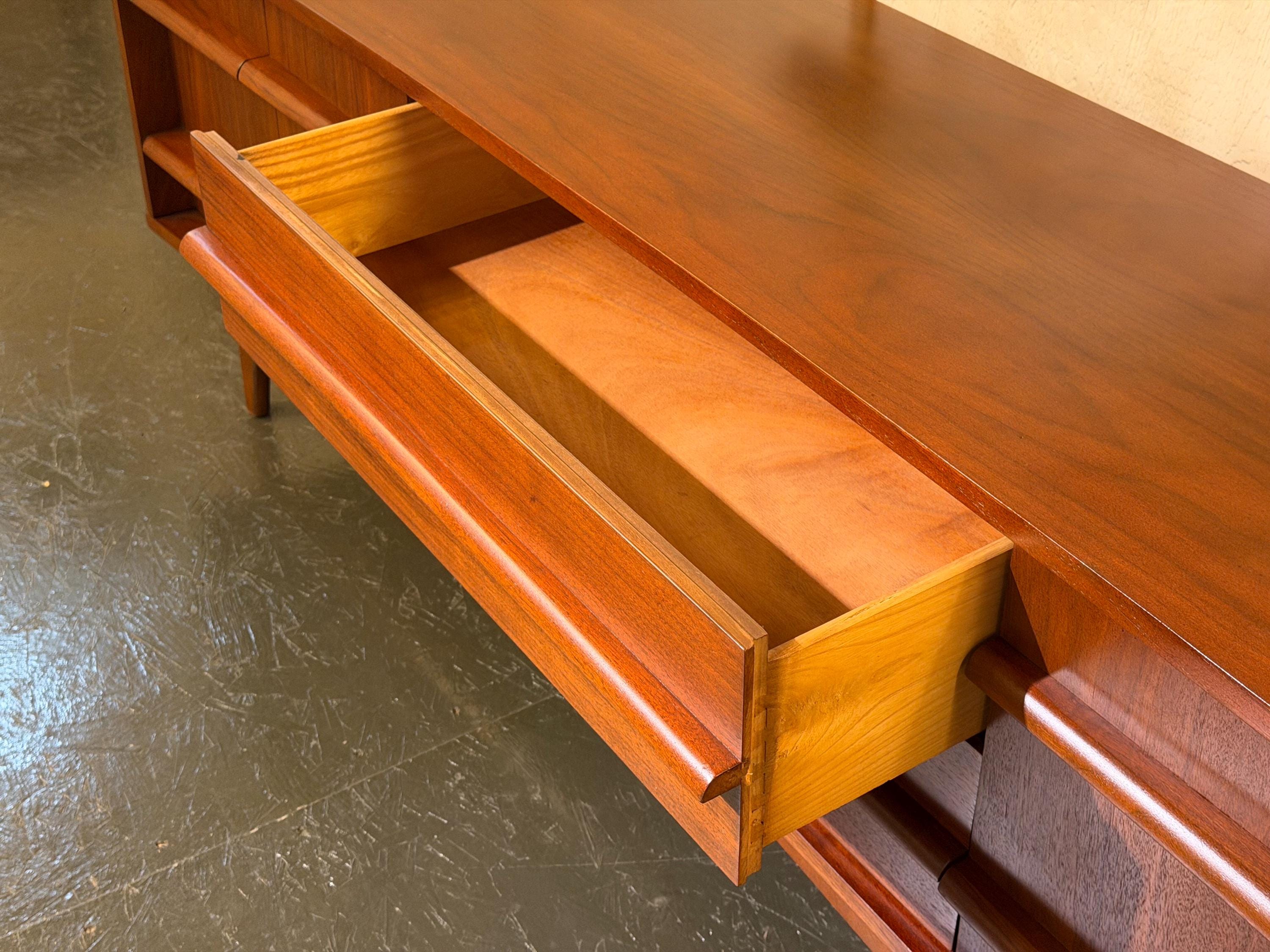 Solid, stable, and retaining its original maker’s stamp on the backing, this credenza stands as a fine example of mid-century craftsmanship. With proper care, it is well-suited to provide lasting beauty and function for years to come—an ideal statement piece for the discerning mid-century modern interior.