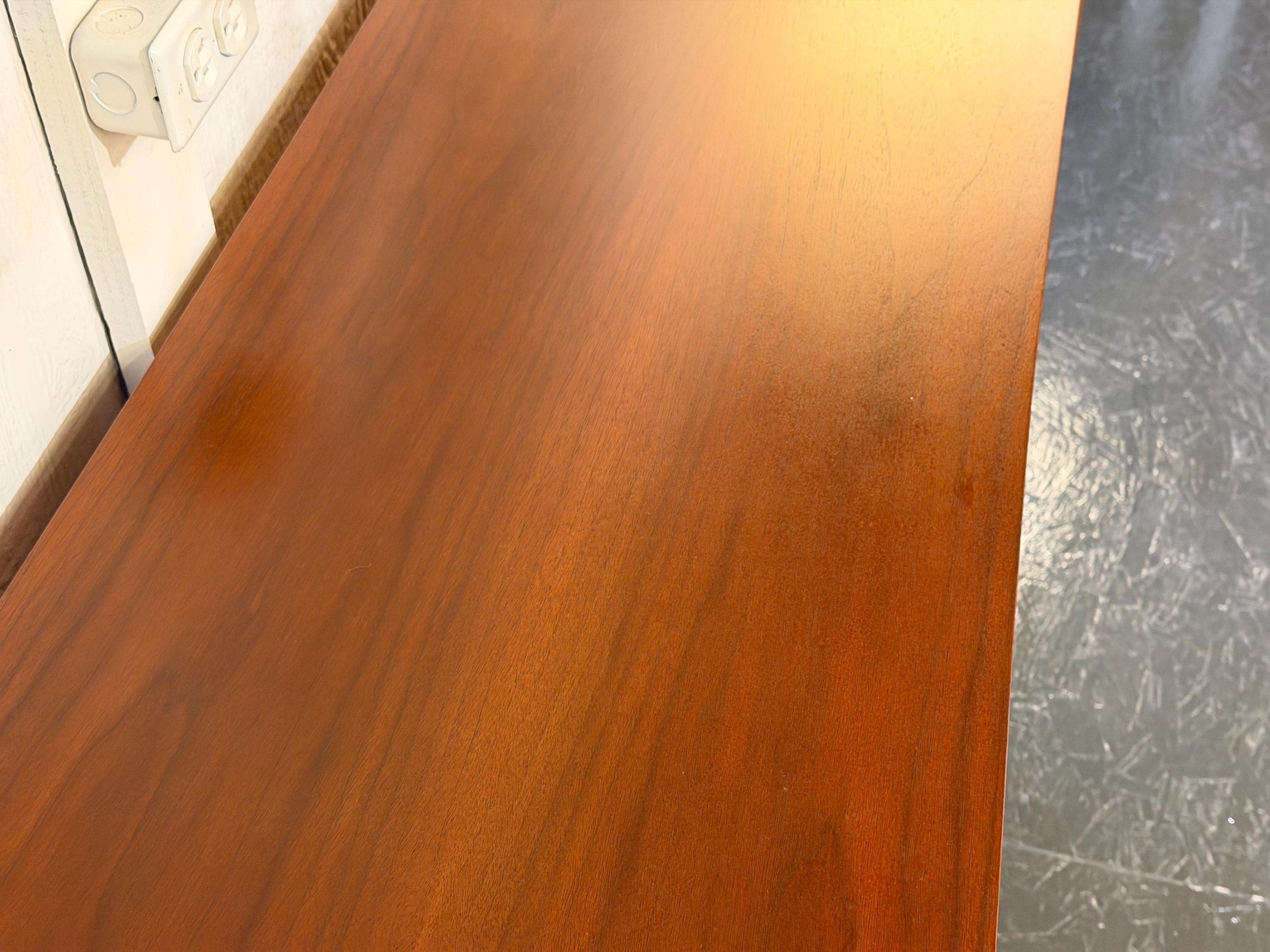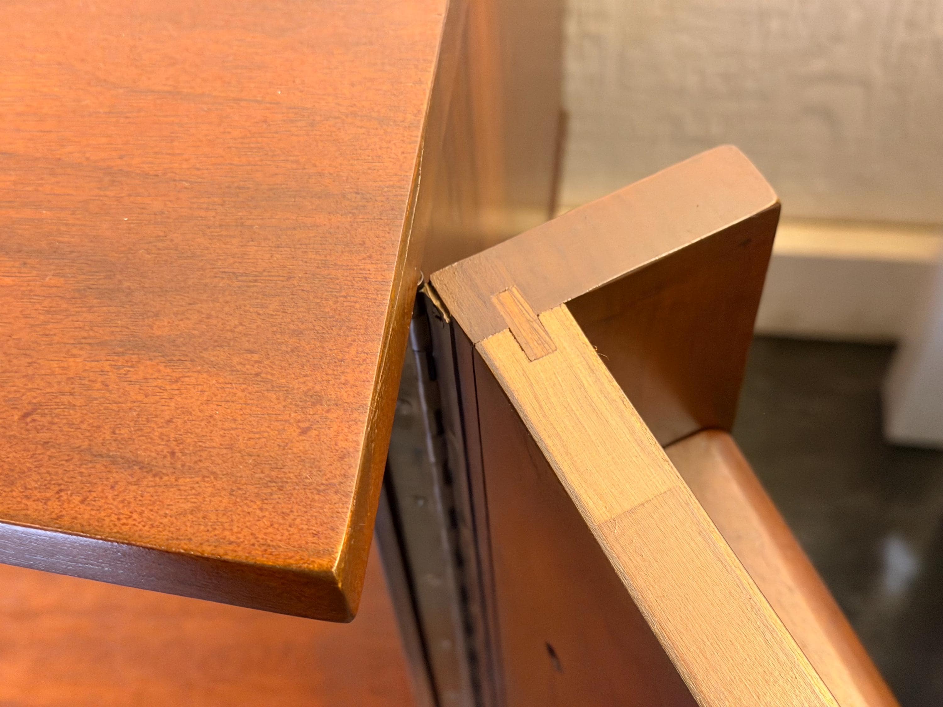 This piece has undergone a thorough inspection and professional restoration. Visible surface scratches and cup rings have been carefully minimized, doors and latches have been adjusted for smooth functionality, and both drawers have been outfitted with new wooden rails to ensure an improved glide. The walnut finish presents a slightly deeper tone with a subtle reddish warmth, enhancing the natural character of the wood.