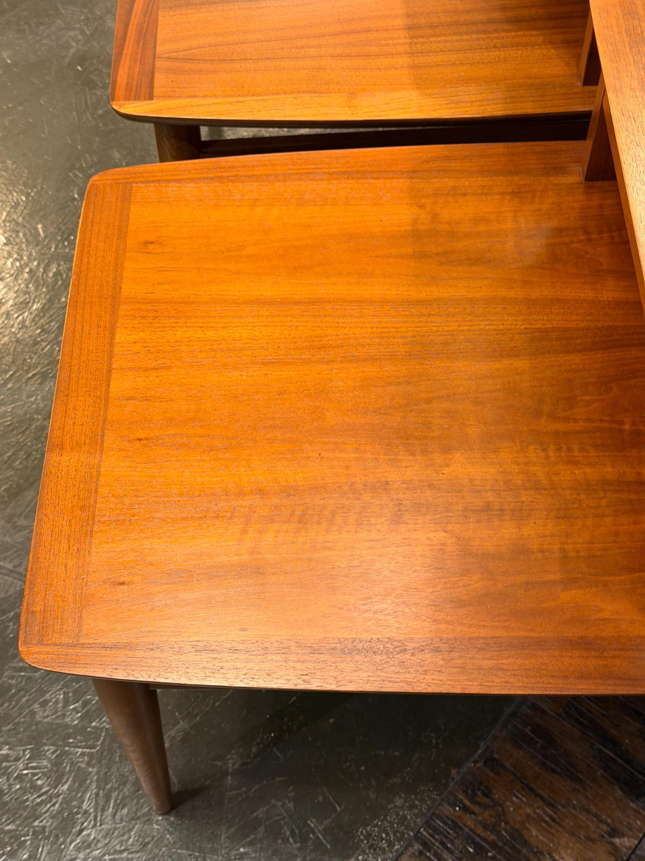 As expected with vintage pieces, there may be light signs of age and use, but overall, the pair remains in very good condition. One table has a slight bend in the side support bar that runs beneath the tabletop from the front legs to the back. This is minor and not immediately noticeable, but we want to mention it for full transparency.