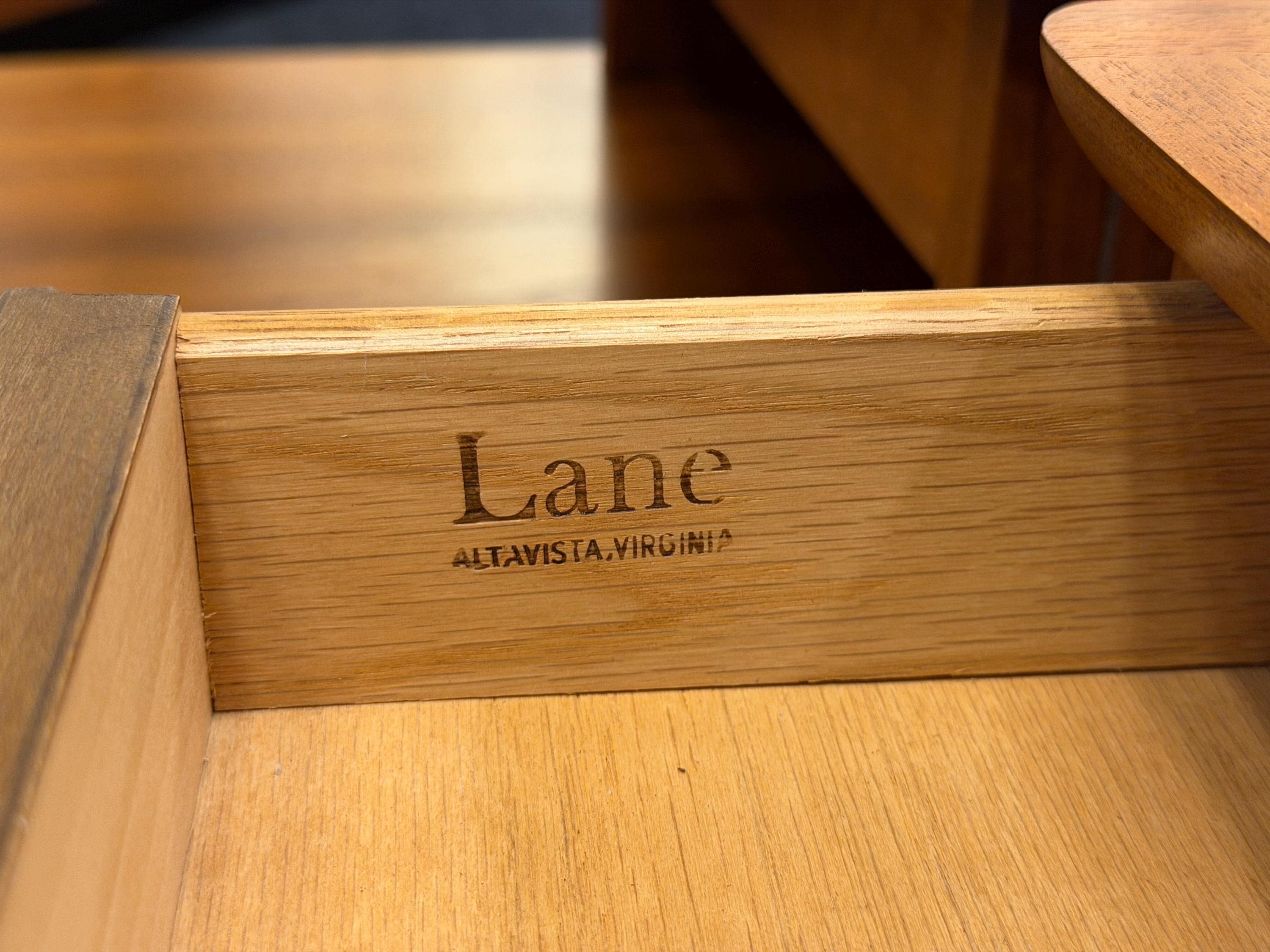 Each table features a convenient drawer located beneath the top surface and retains its original Lane maker’s mark inside the drawer, further verifying authenticity and origin.