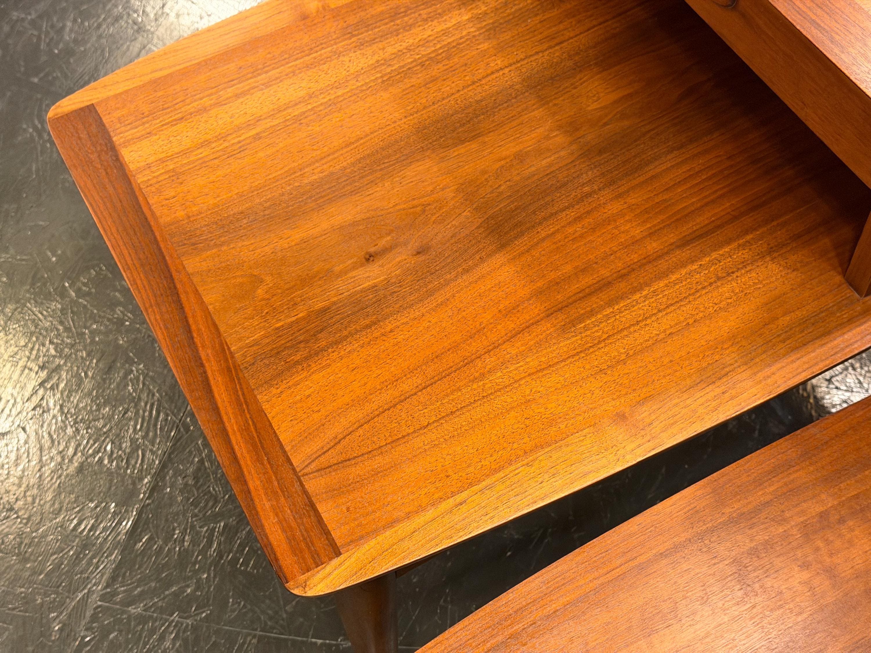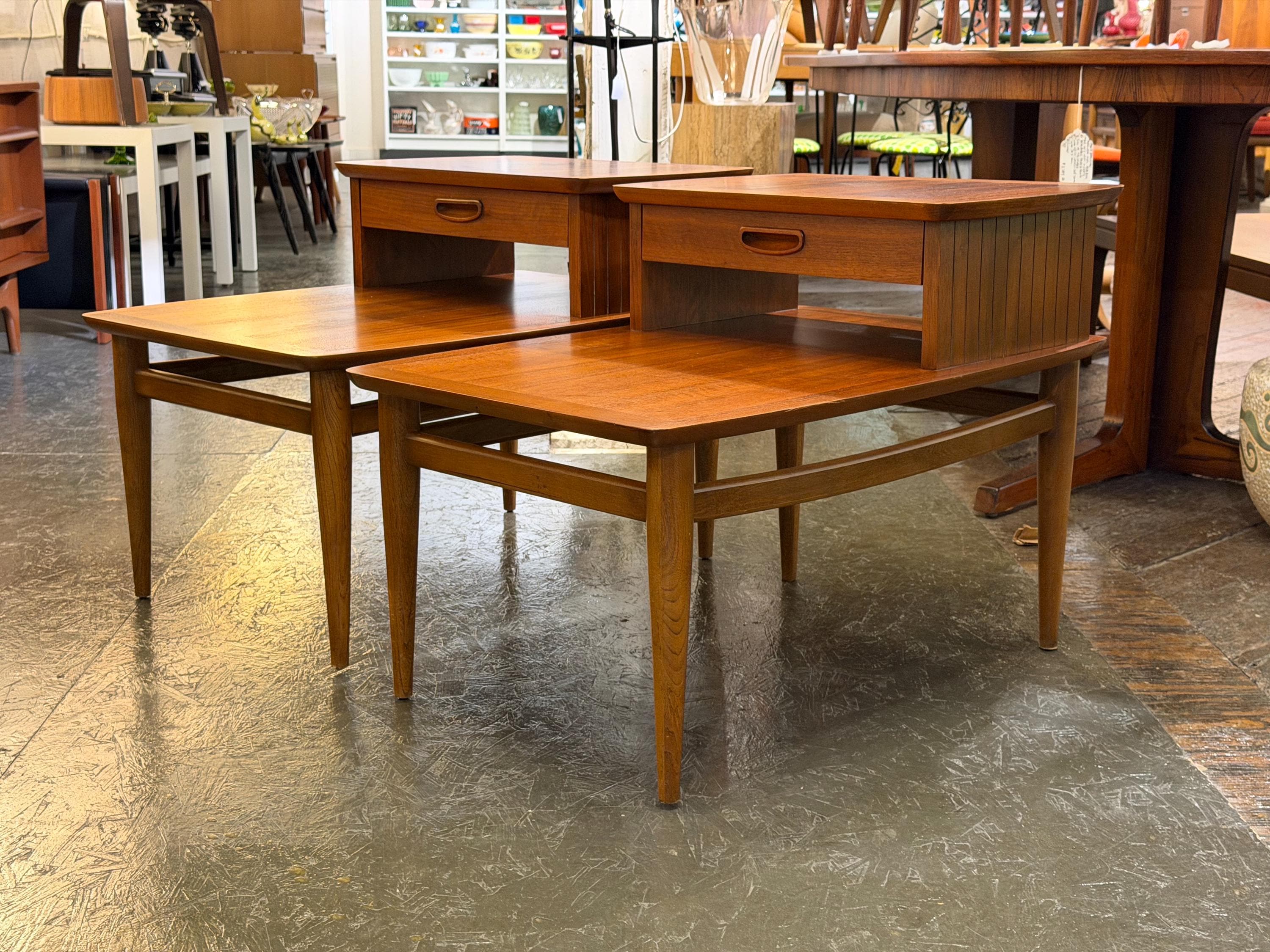 This pair of matching step-end tables by Lane Furniture Company, circa 1964, is a wonderful example of classic mid-century American craftsmanship. Both tables retain matching serial numbers, confirming they have remained together since new.