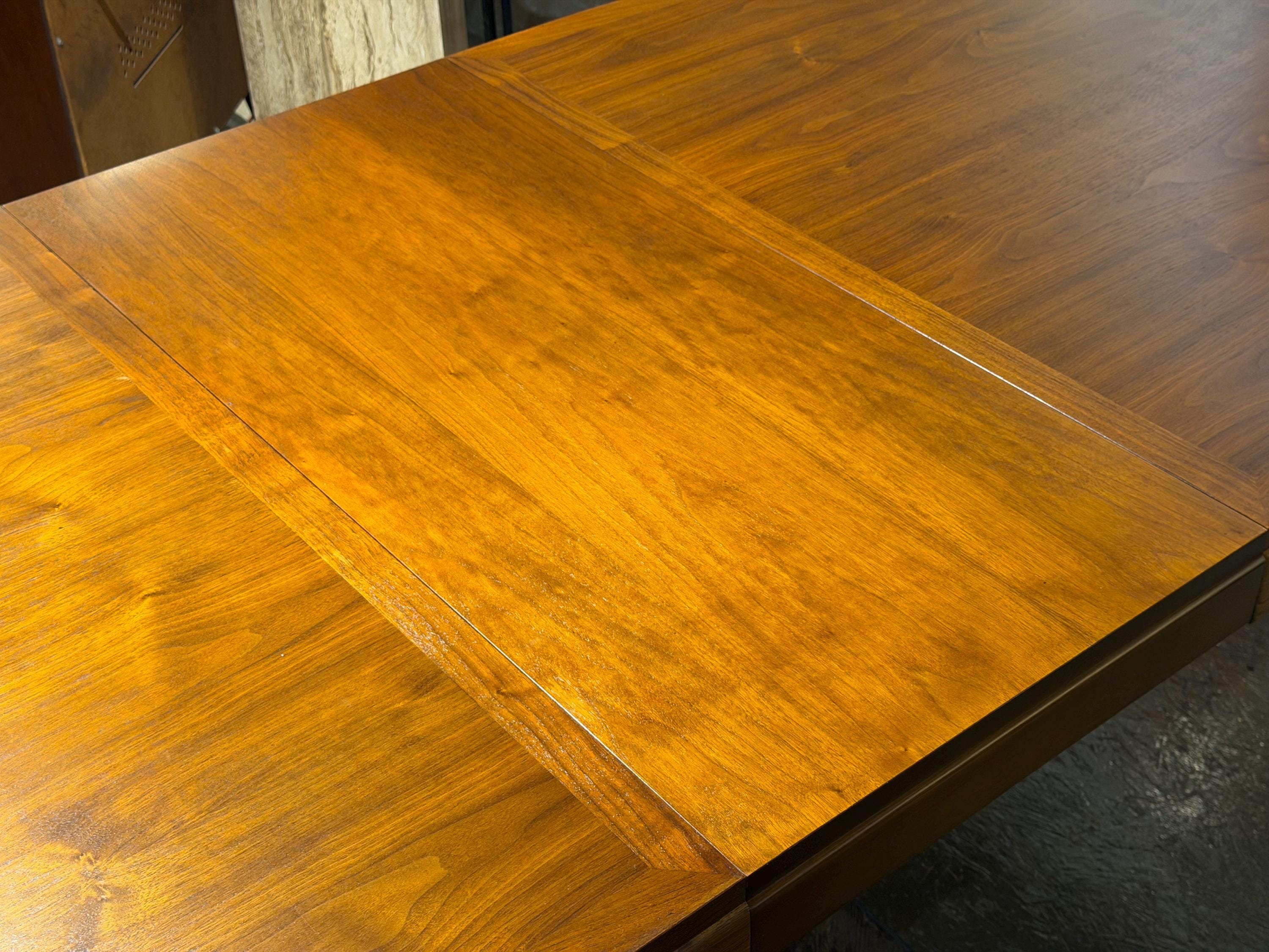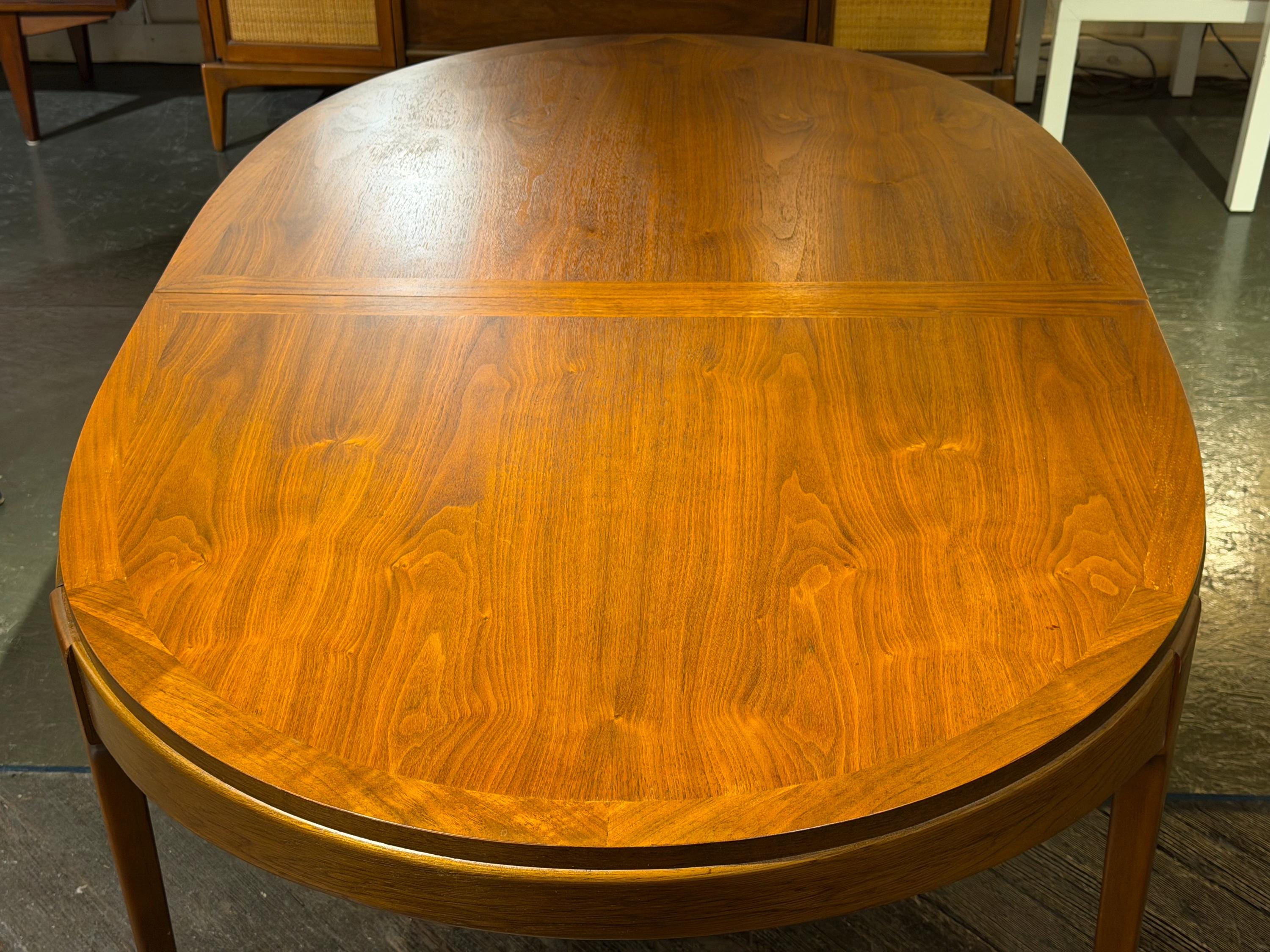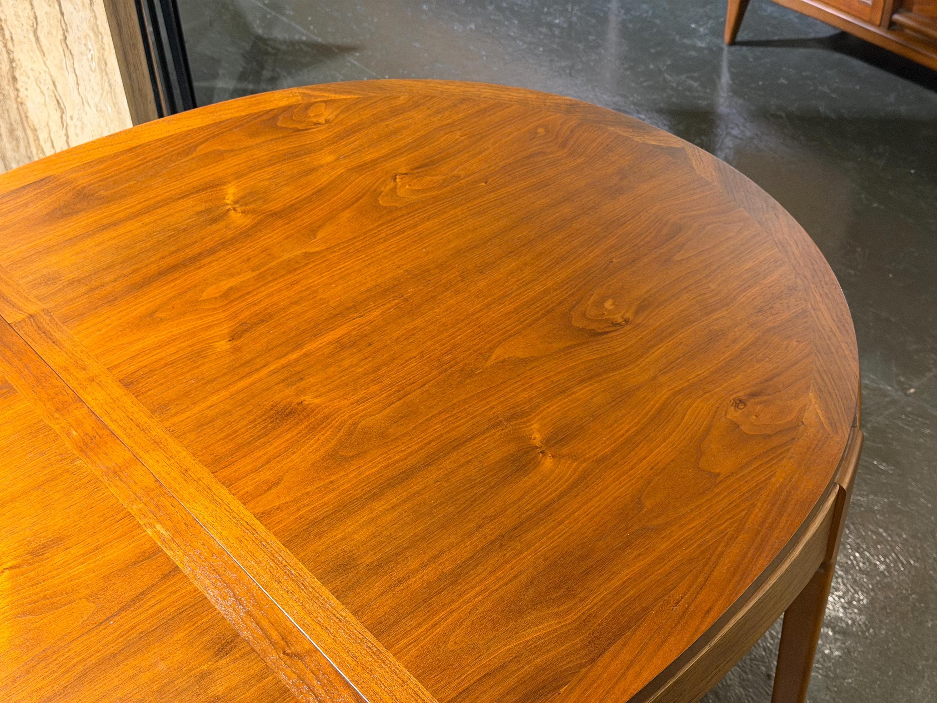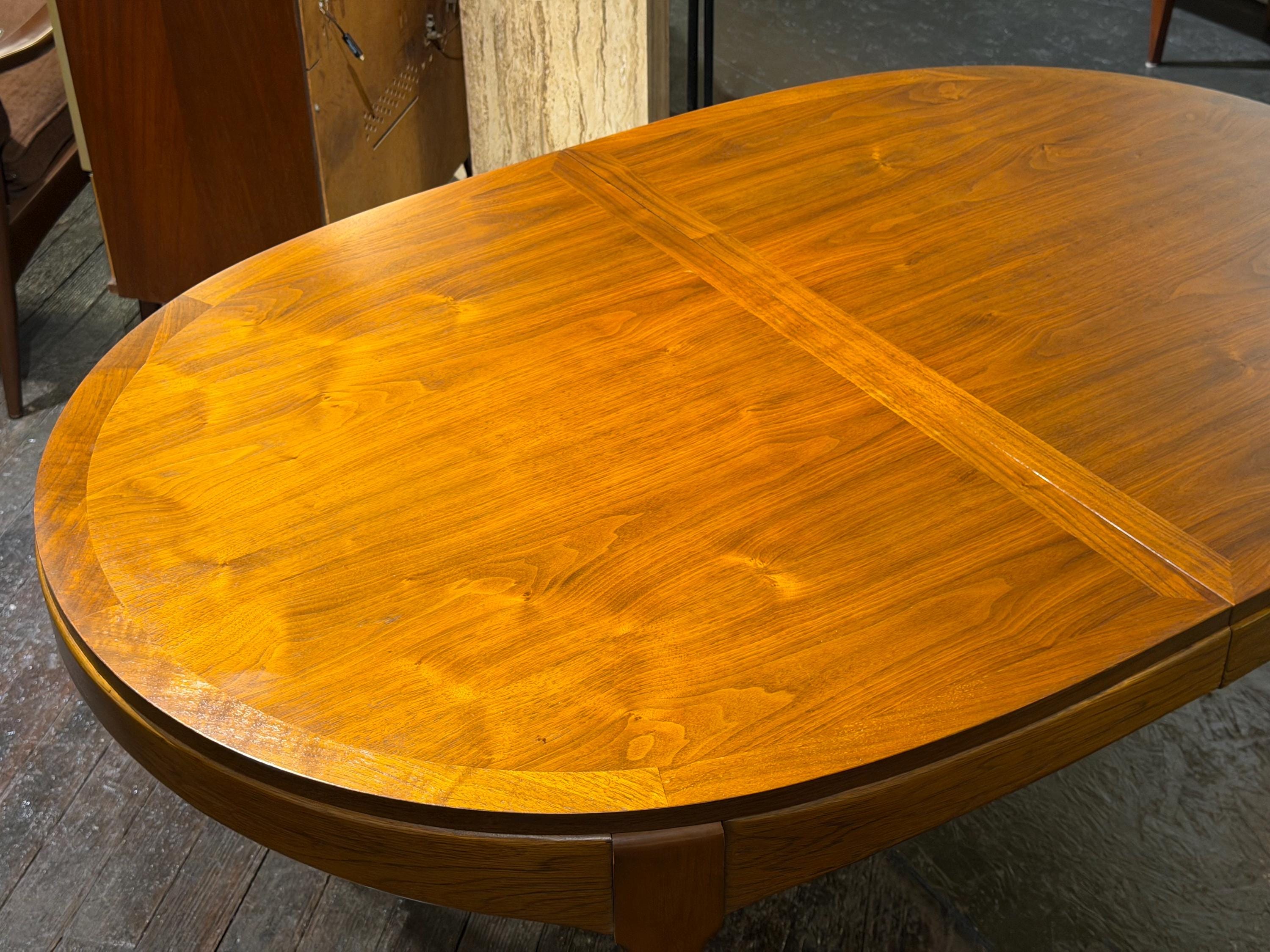 Now available is a beautifully preserved walnut extending dining table by Lane, from their highly regarded Rhythm line, circa 1974. This exceptional piece highlights a rich, continuous walnut grain across the tabletop, exemplifying the quality and craftsmanship associated with mid-century design.