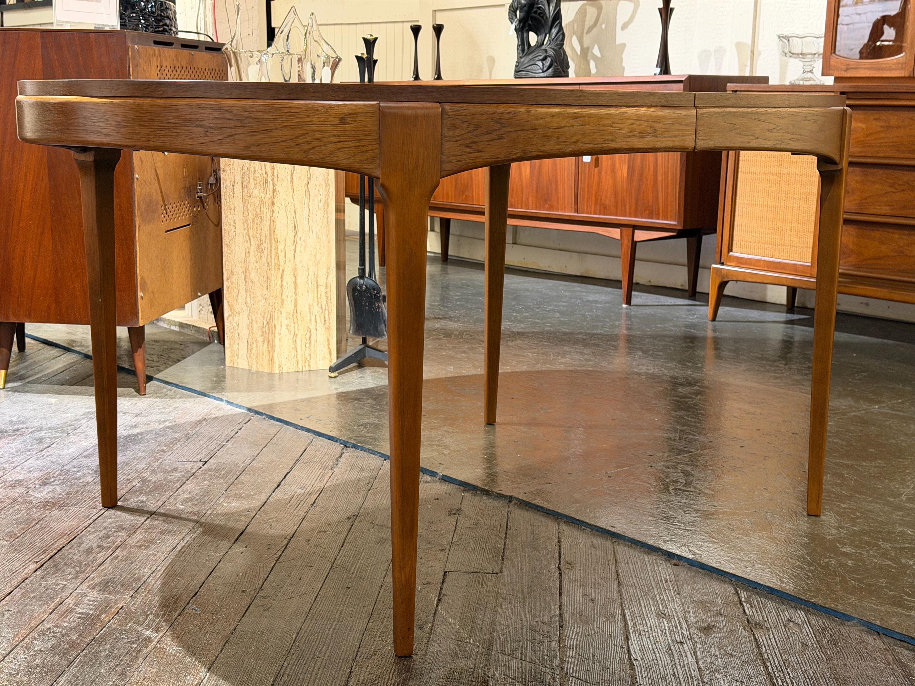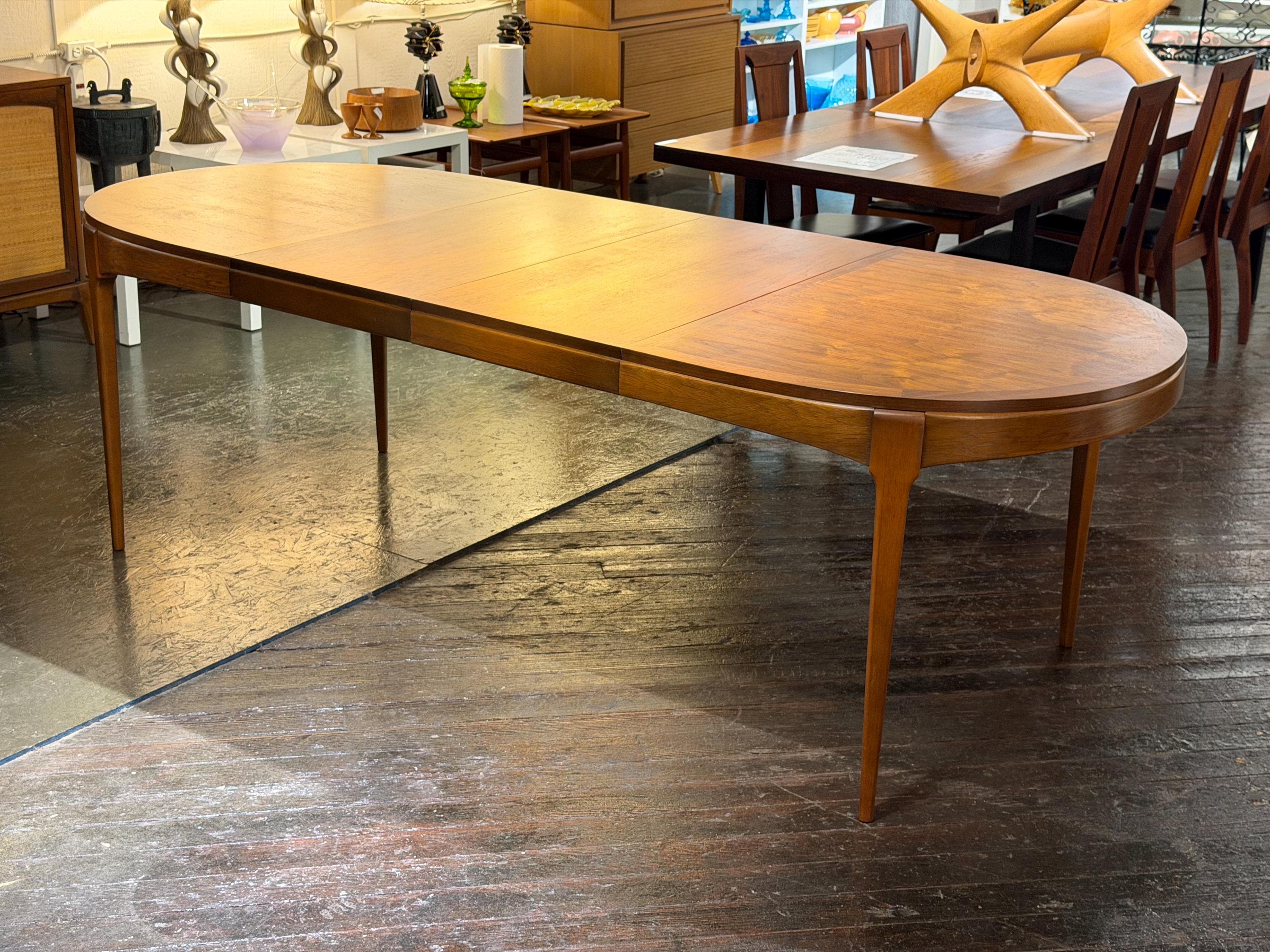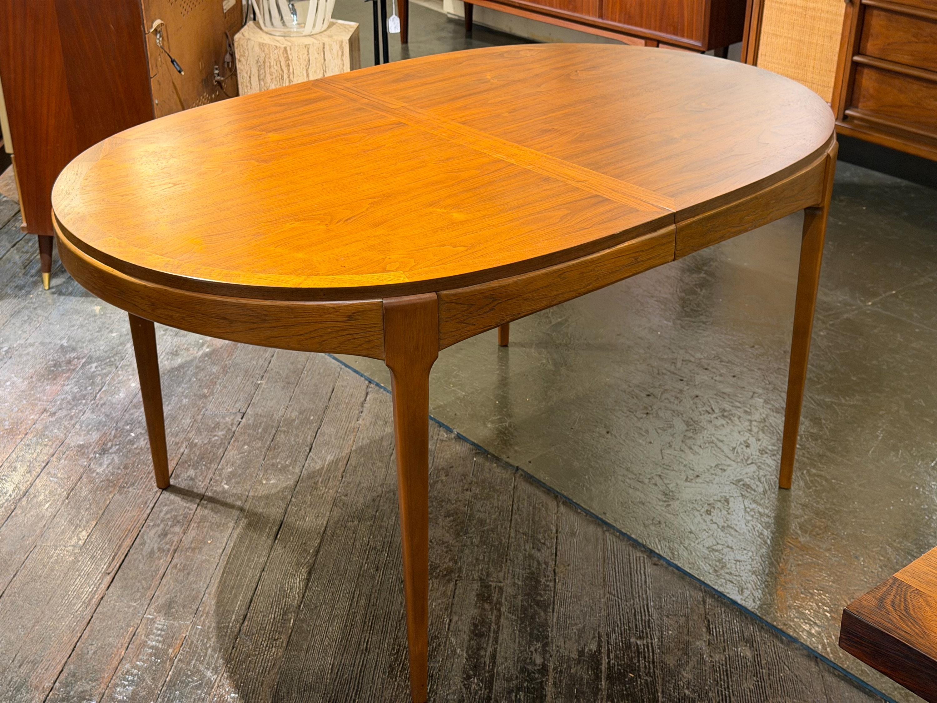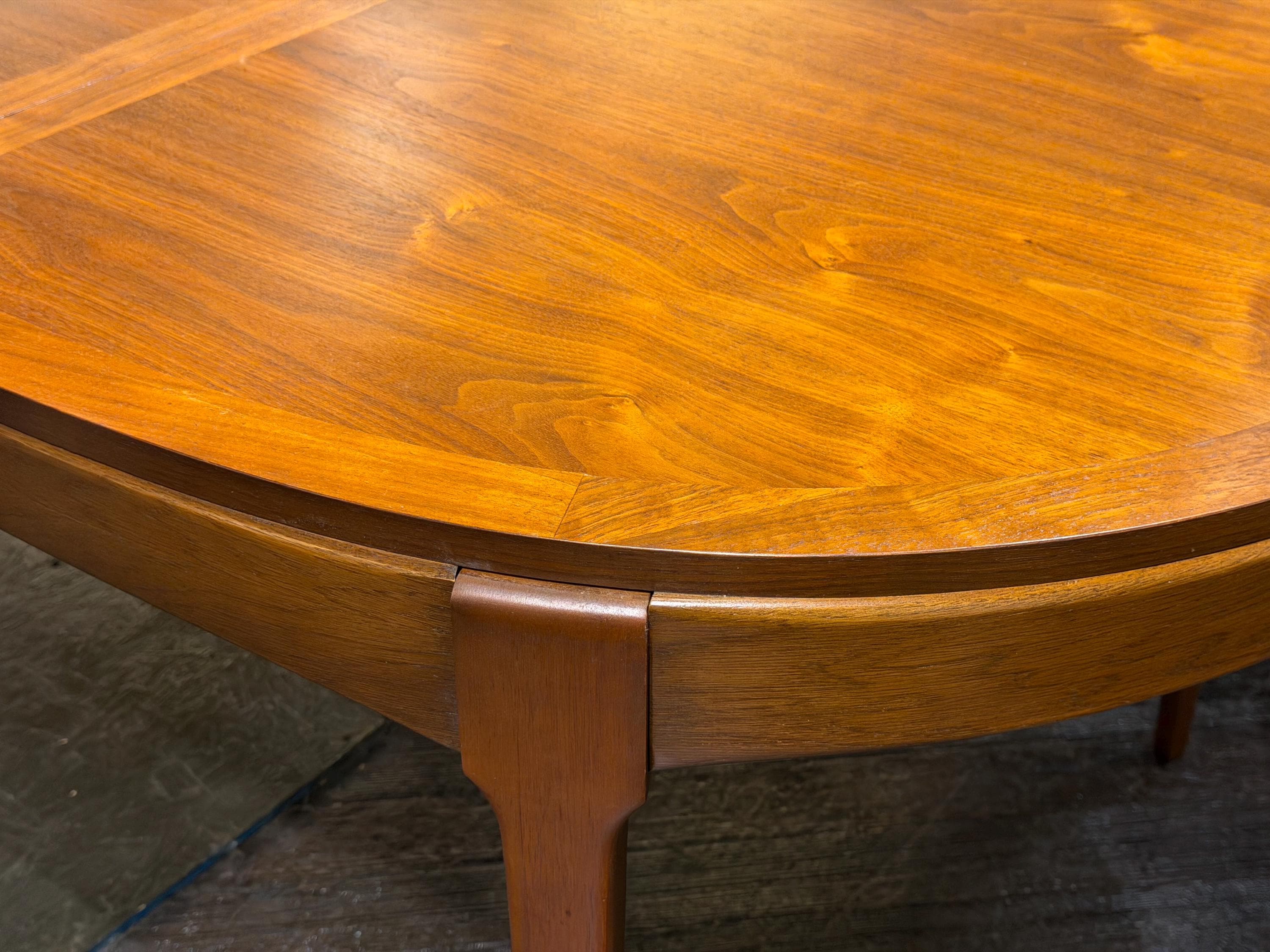 Now available is a beautifully preserved walnut extending dining table by Lane, from their highly regarded Rhythm line, circa 1974. This exceptional piece highlights a rich, continuous walnut grain across the tabletop, exemplifying the quality and craftsmanship associated with mid-century design.