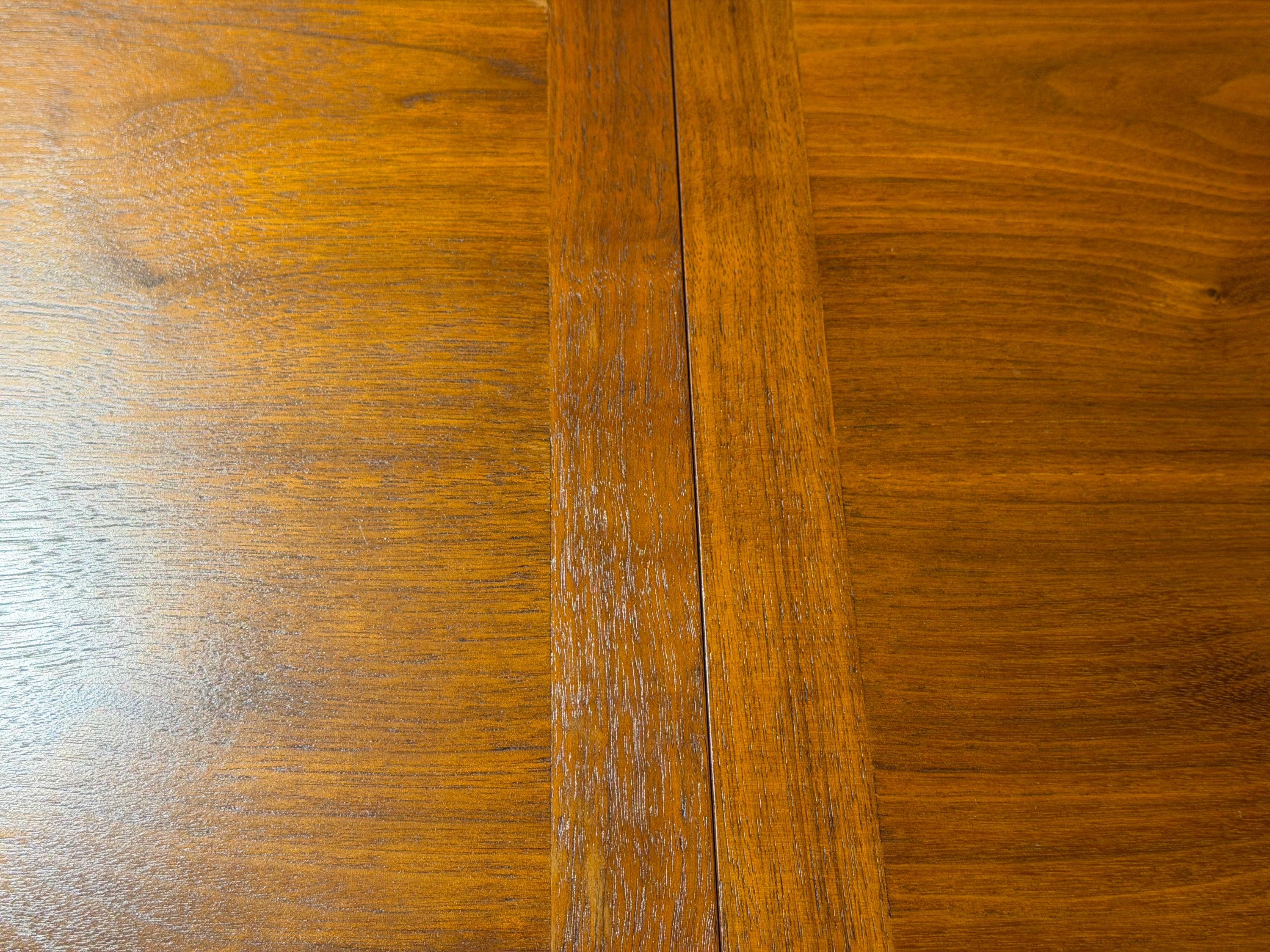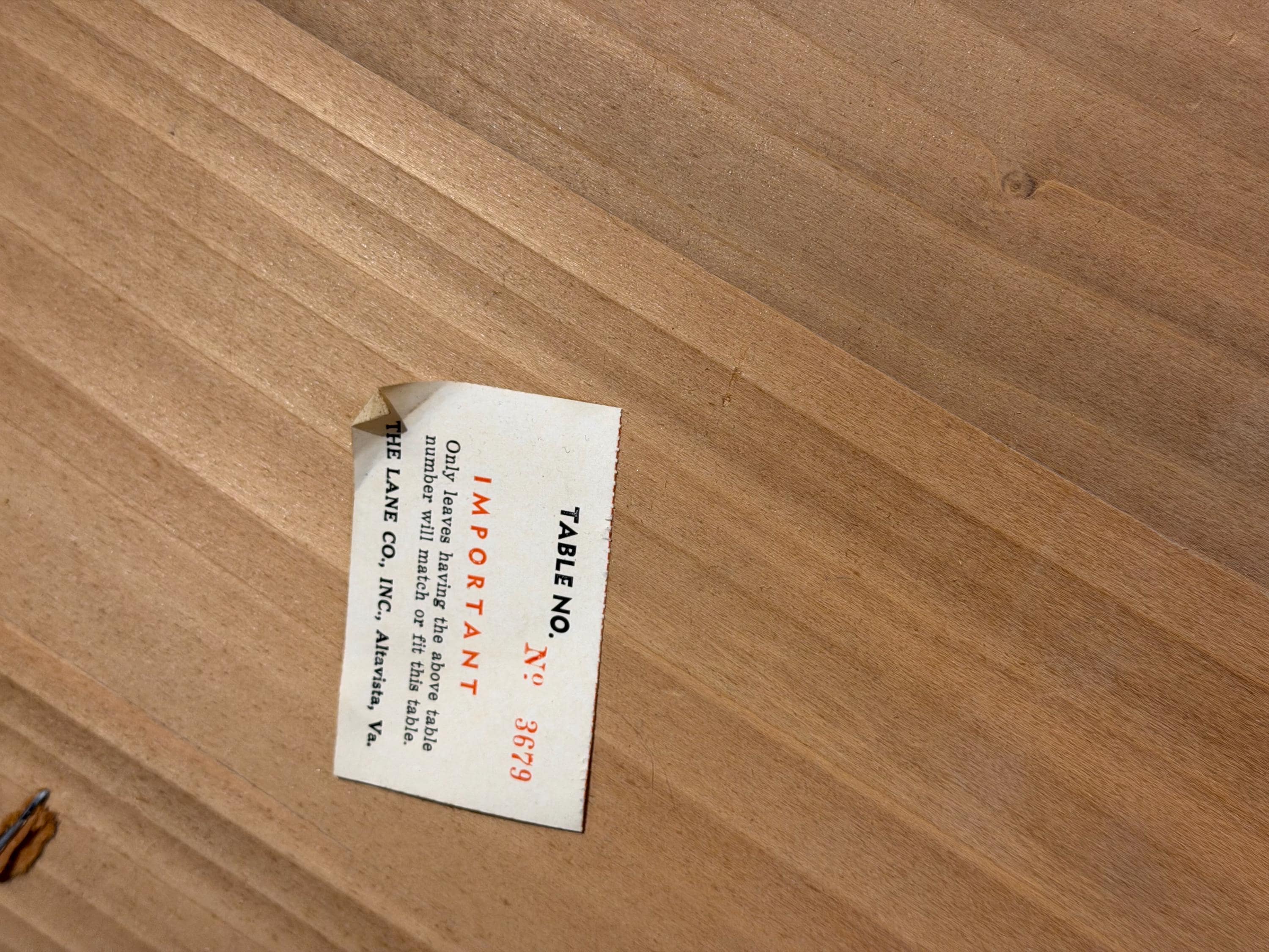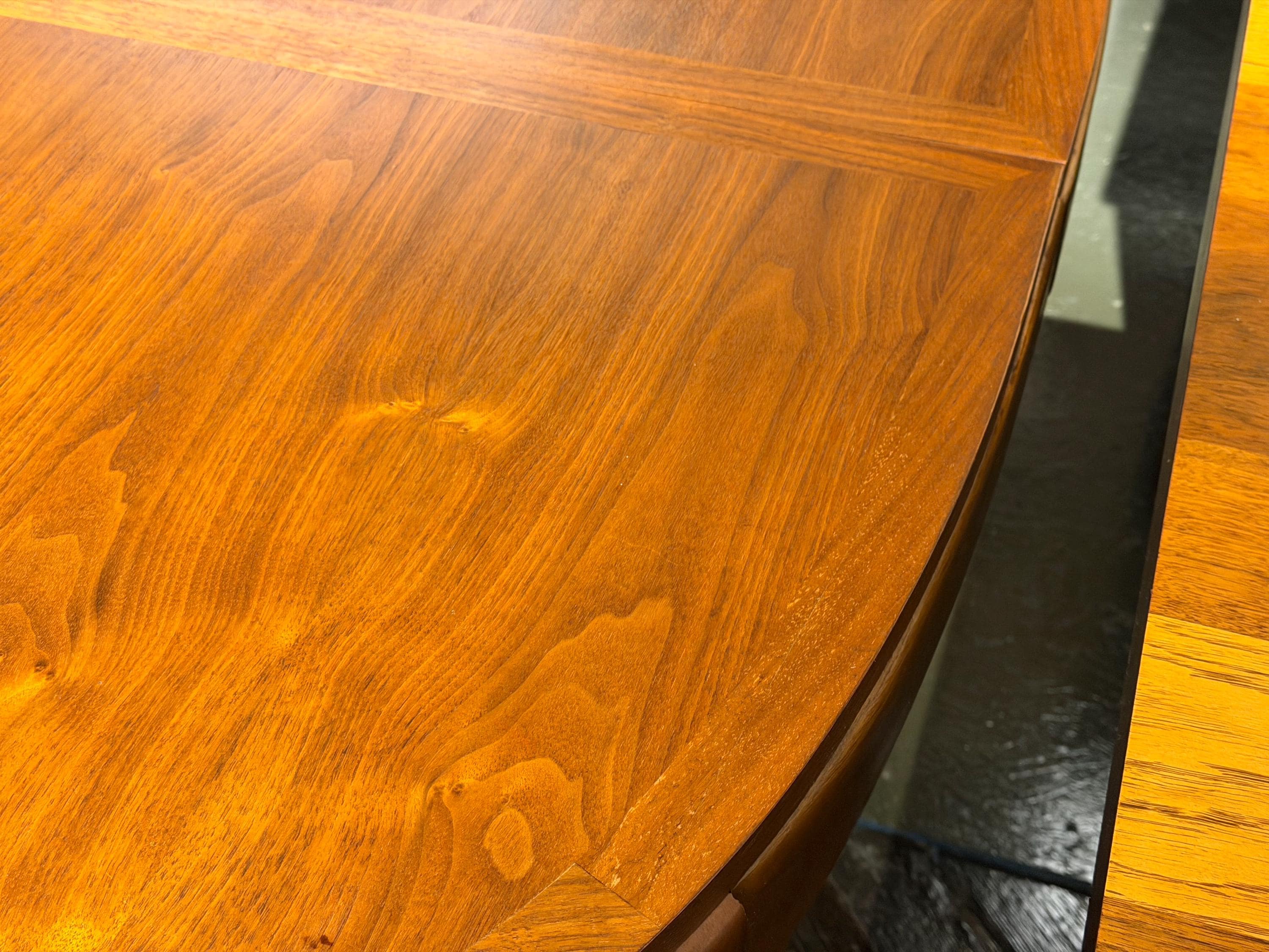 The tabletop has been carefully cleaned while preserving its original finish, which remains in excellent condition with only minimal signs of age and use. Notably, the original owner kept the table well protected, contributing to its outstanding preservation. One leaf has a very small nick on a corner edge, as shown in the accompanying images, but it does not detract from the overall presentation.
