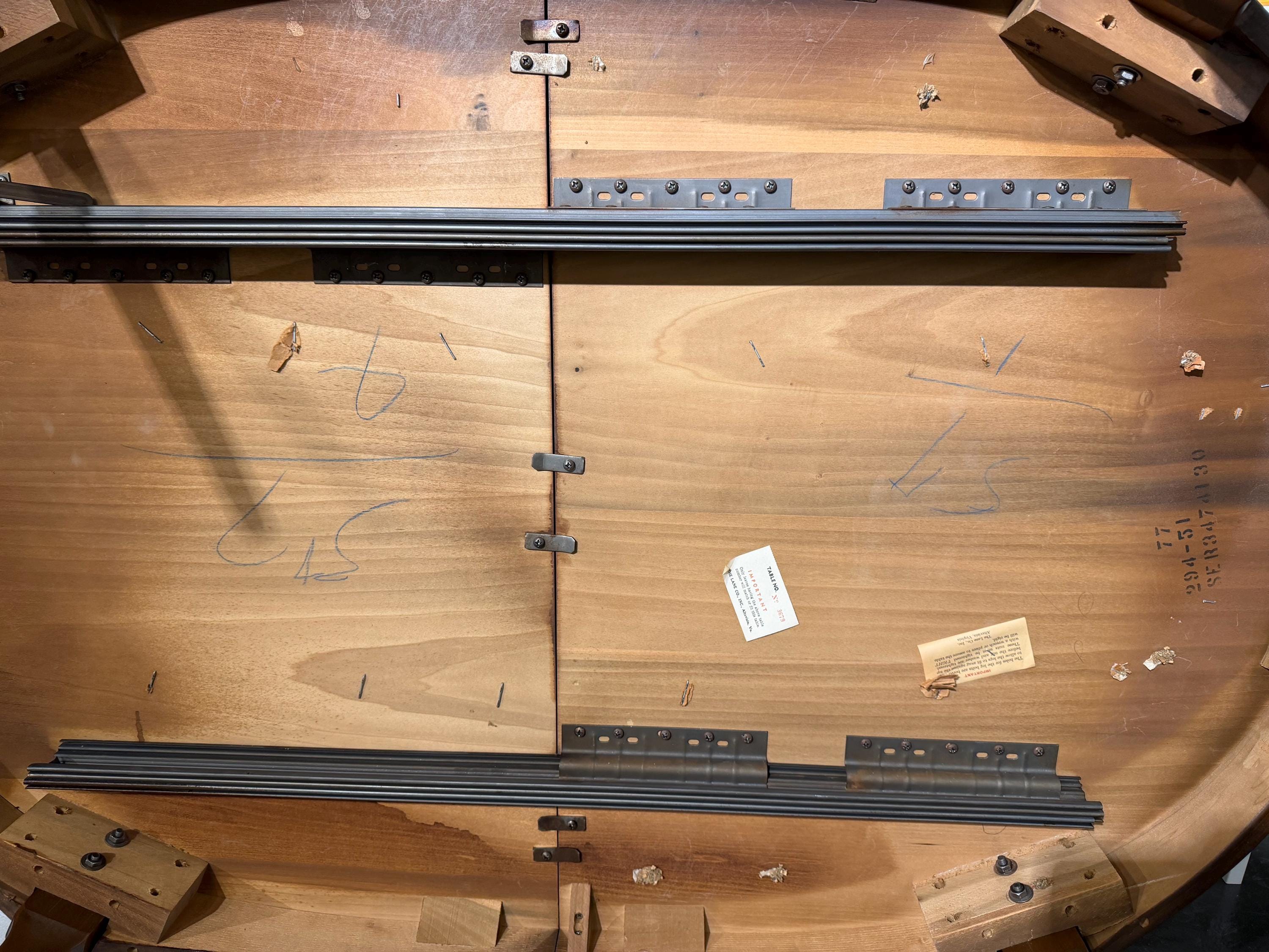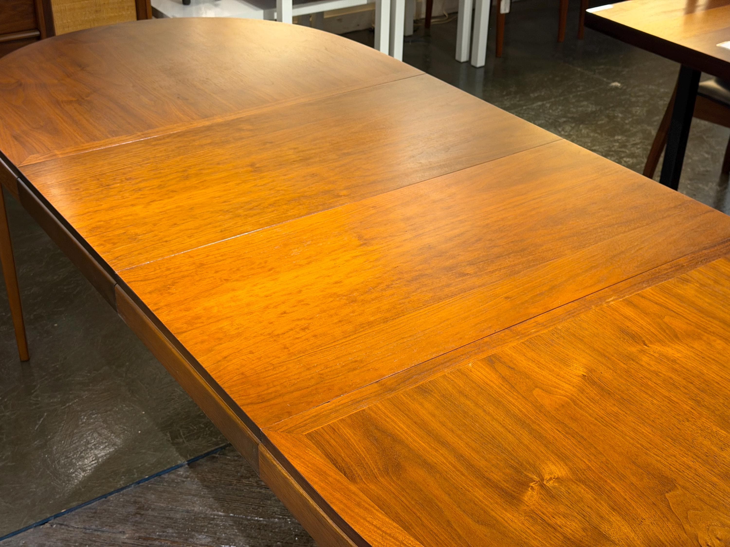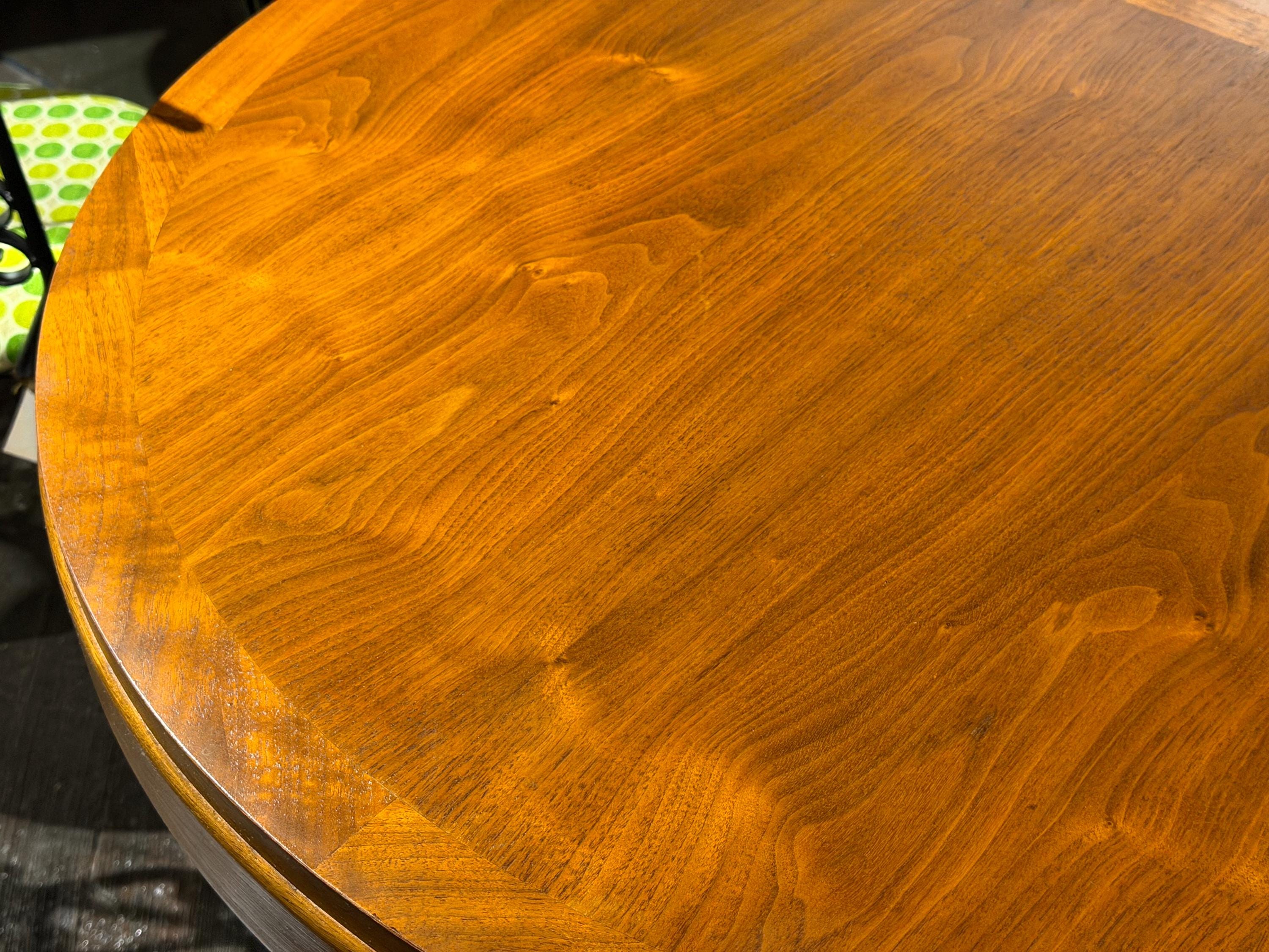 The tabletop has been carefully cleaned while preserving its original finish, which remains in excellent condition with only minimal signs of age and use. Notably, the original owner kept the table well protected, contributing to its outstanding preservation. One leaf has a very small nick on a corner edge, as shown in the accompanying images, but it does not detract from the overall presentation.