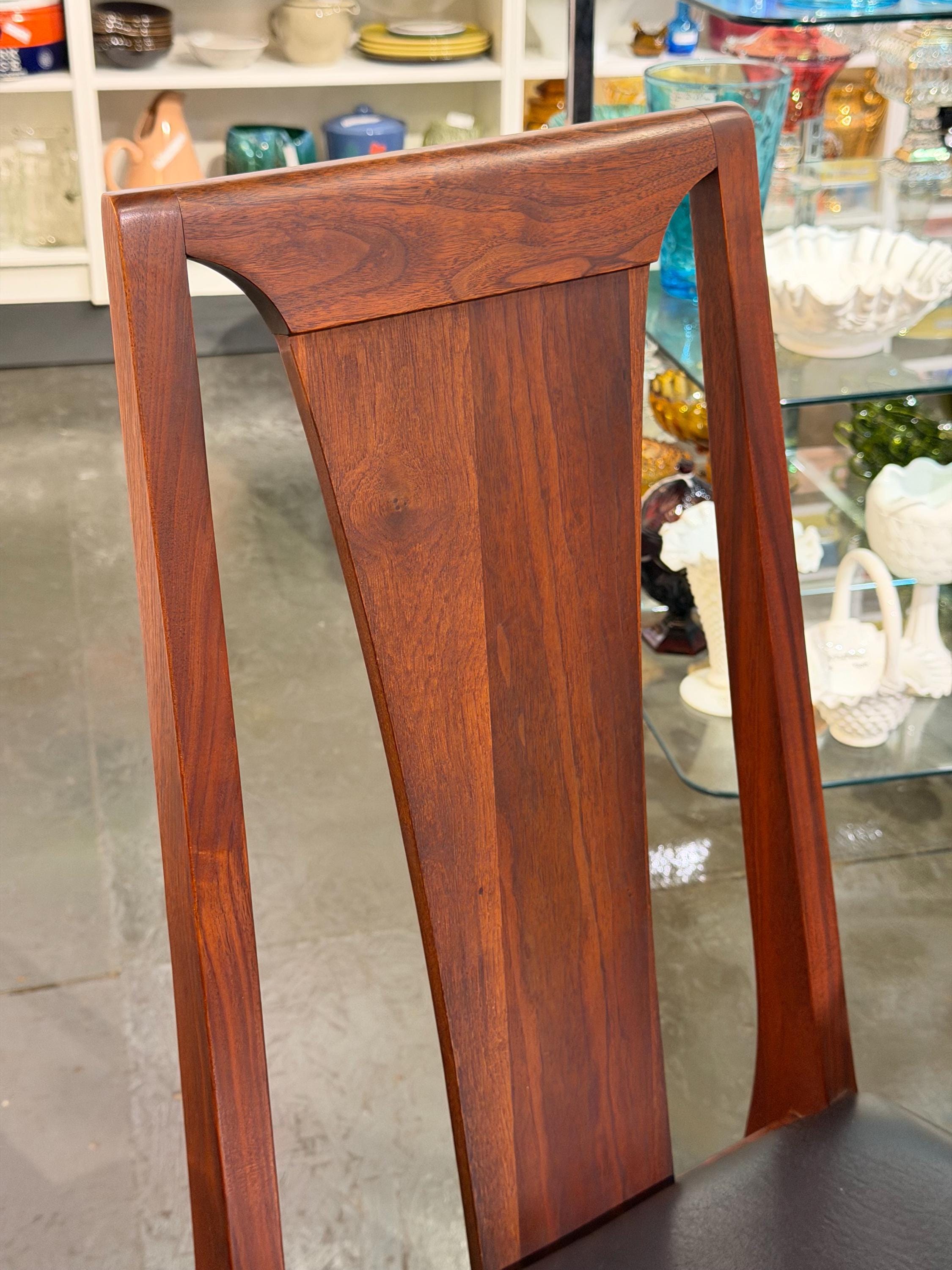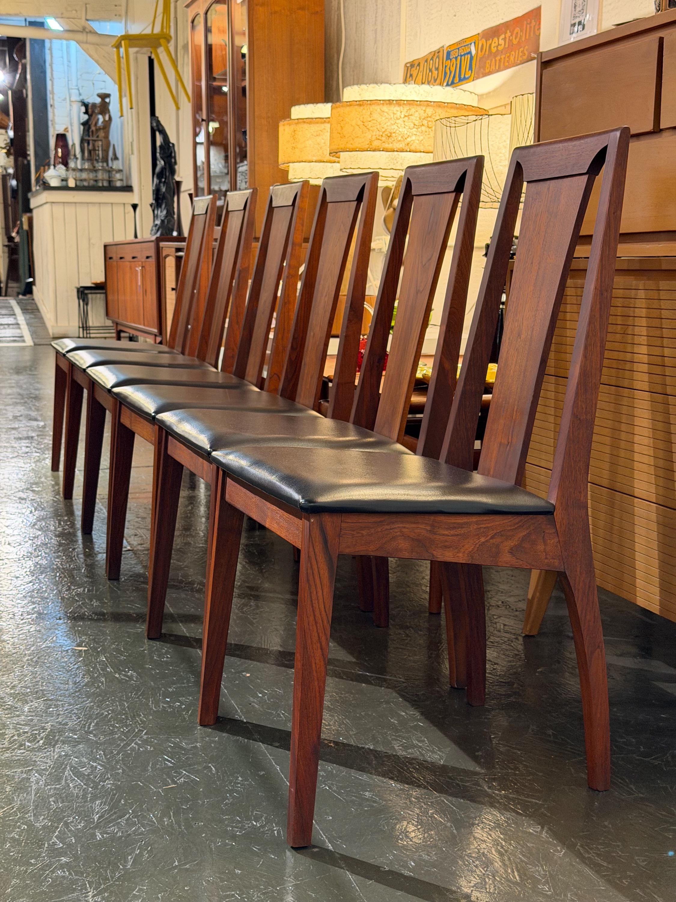 Each chair is crafted from high-quality walnut, showcasing a rich, refined grain comparable to the materials seen in pieces by Jack Cartwright for Founders Furniture Company, though this set is unmarked. The frames exhibit superb craftsmanship and a timeless mid-century modern aesthetic.