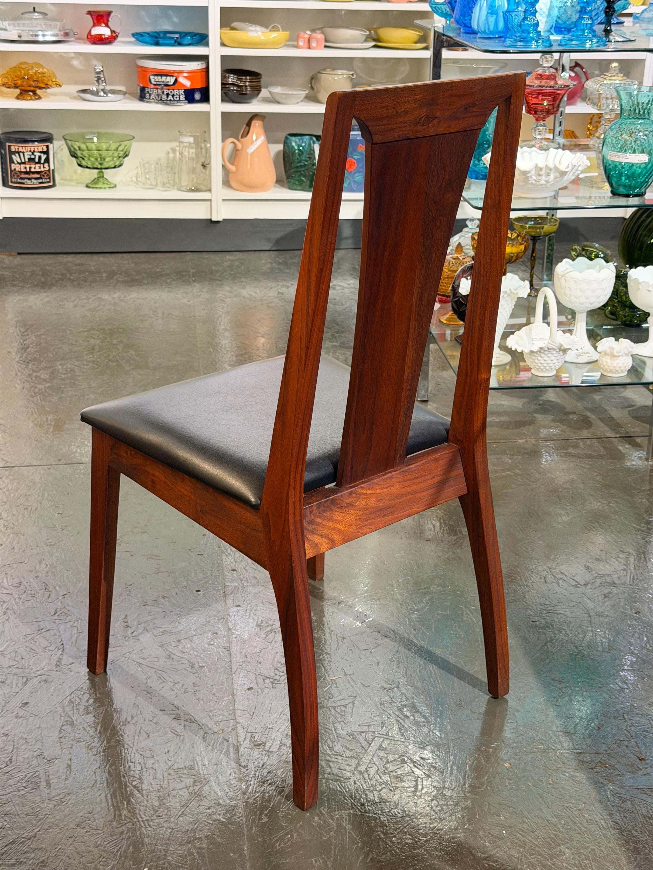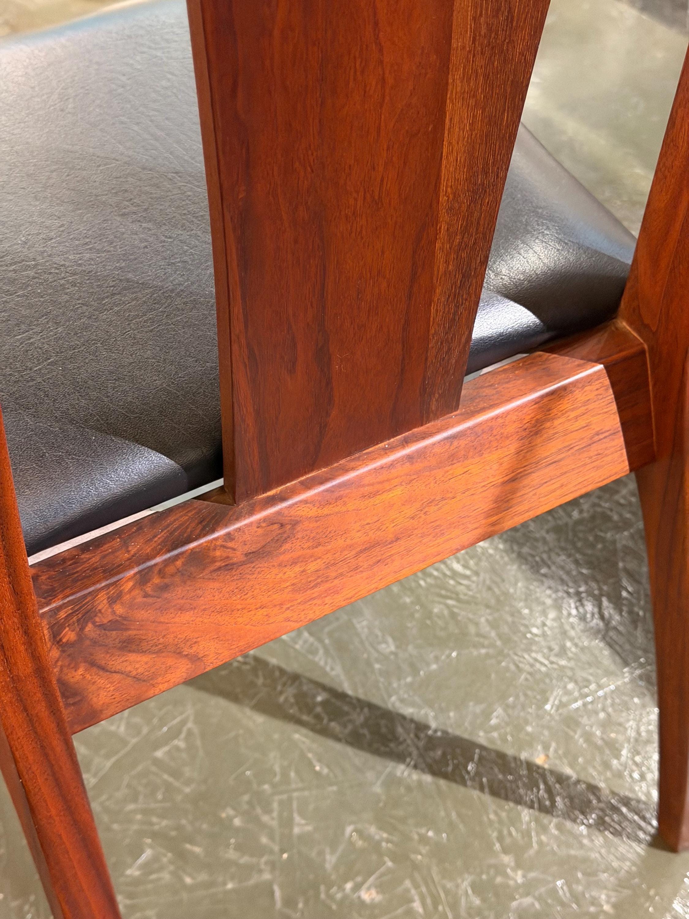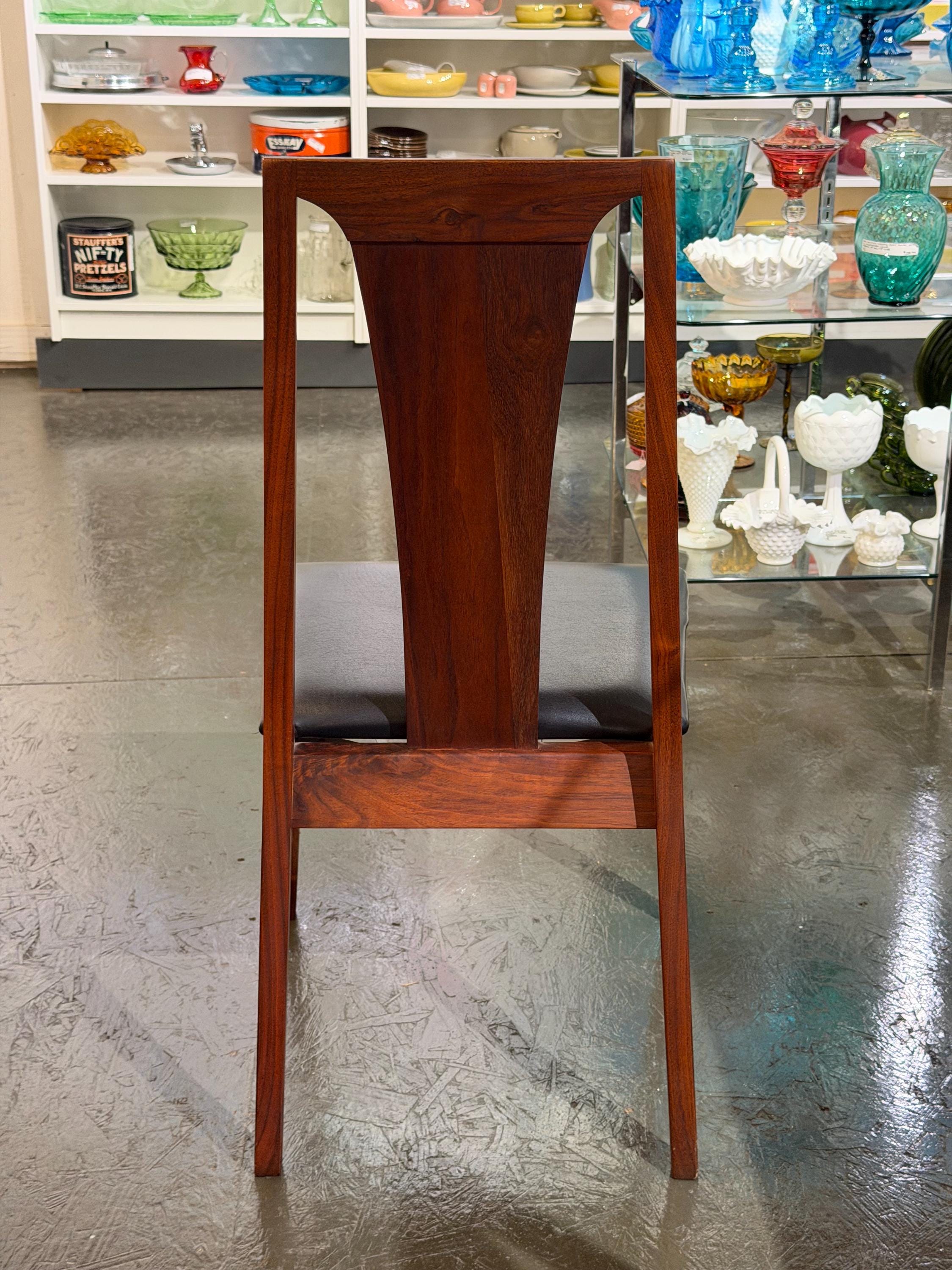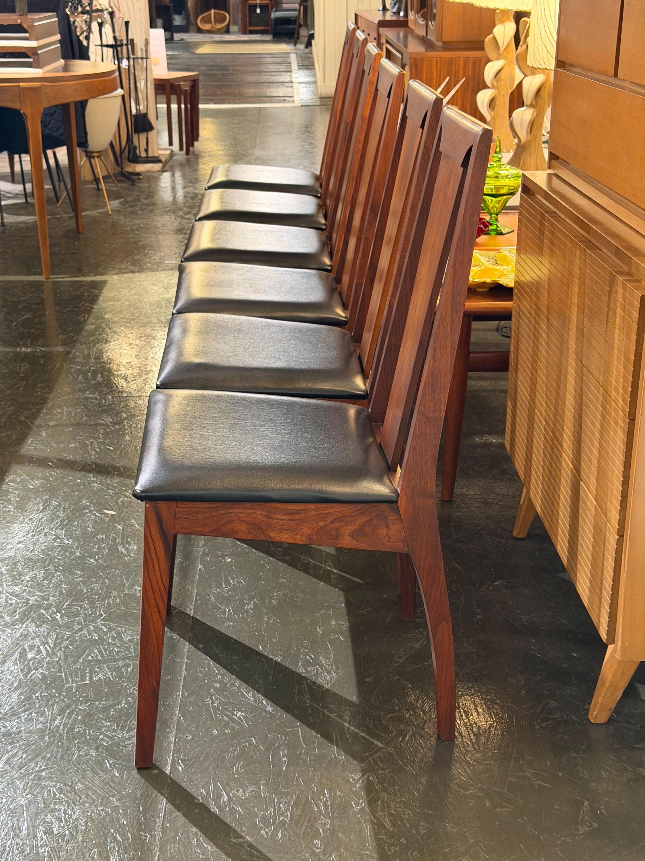 The chairs retain their original black vinyl upholstered seats, all of which are clean and free from stains or tears. Structurally, each chair is sturdy and well-balanced, with gracefully curved rear legs that angle outward—an elegant design detail that enhances their distinctive mid-century character.