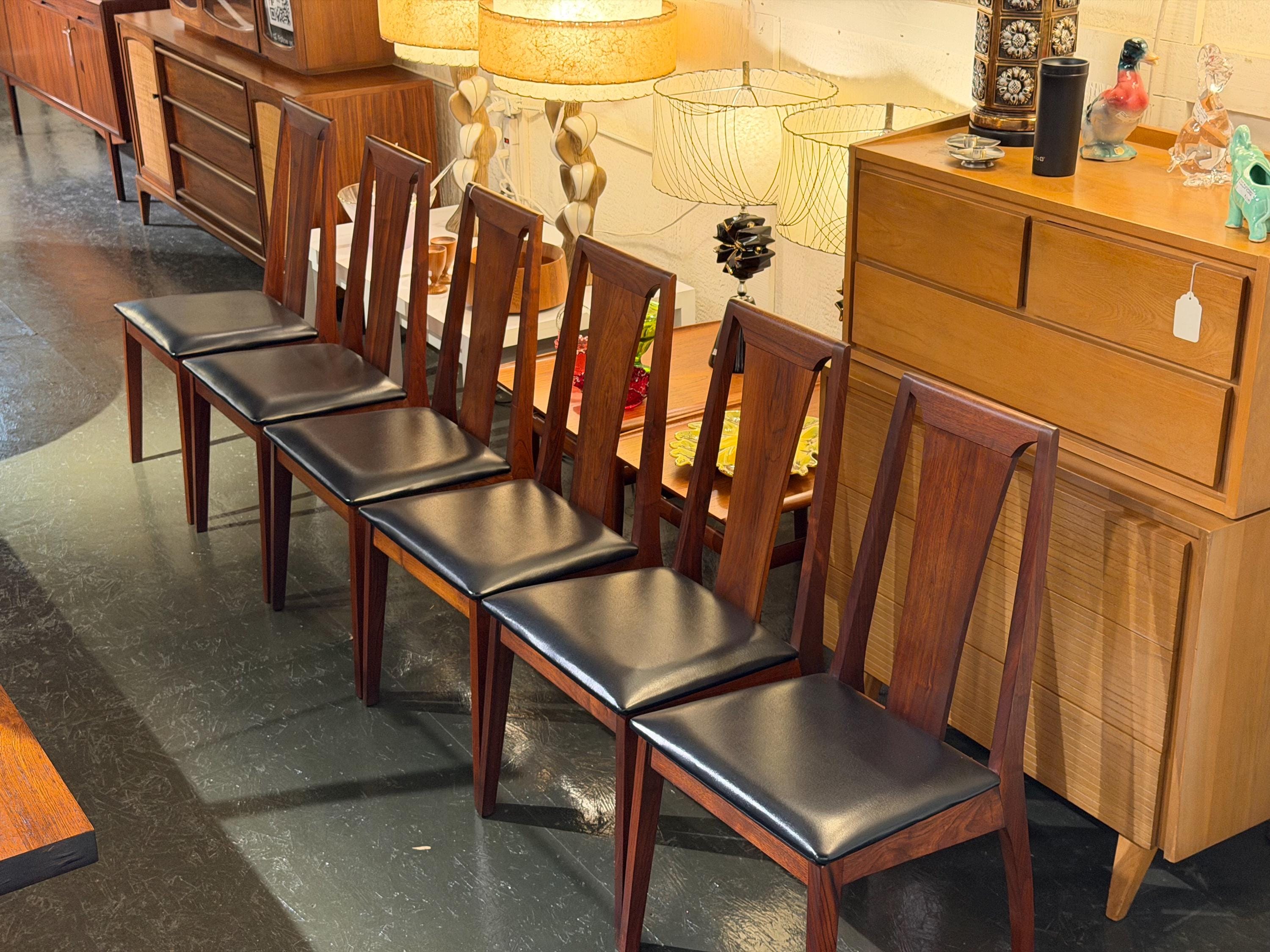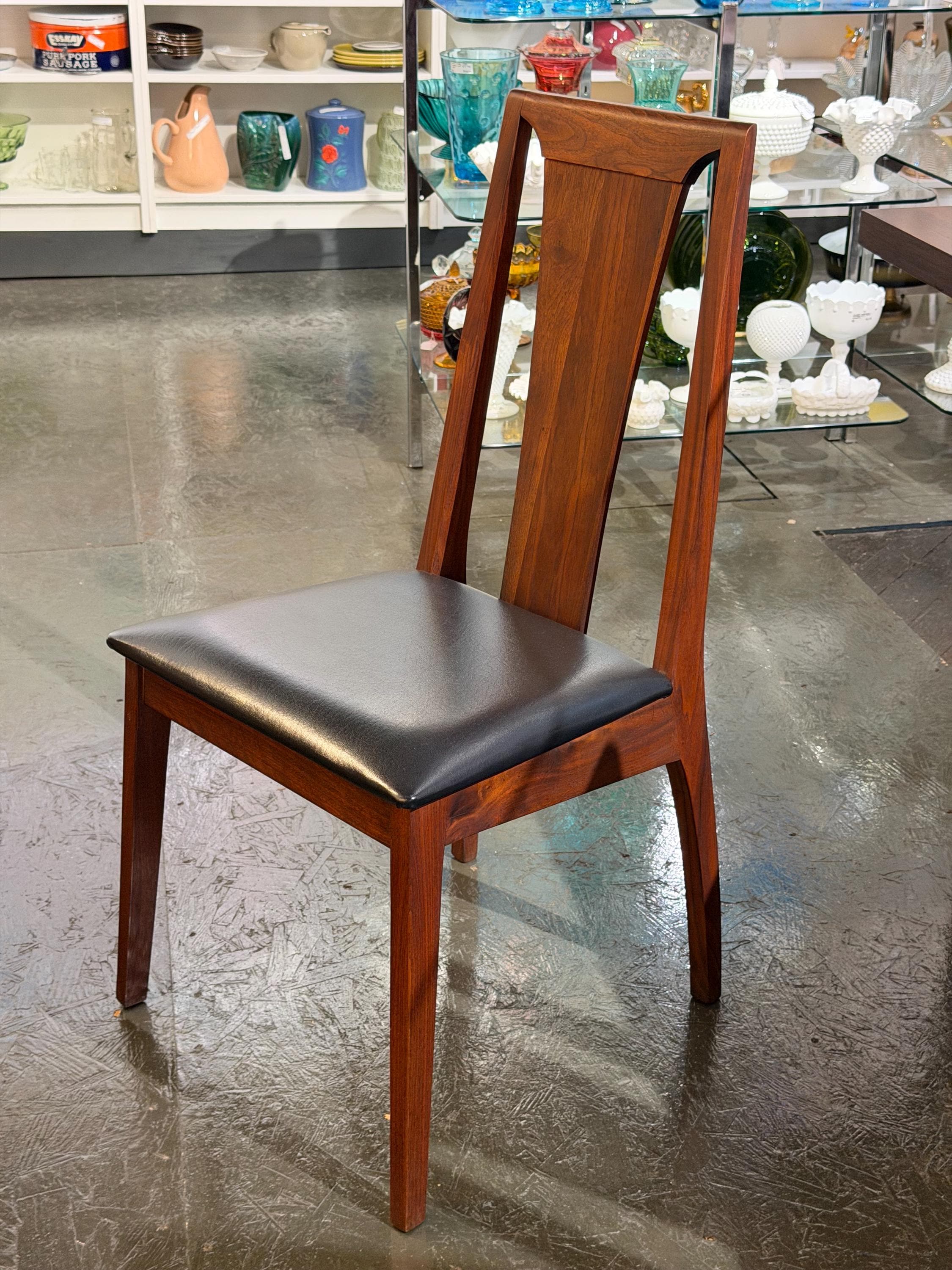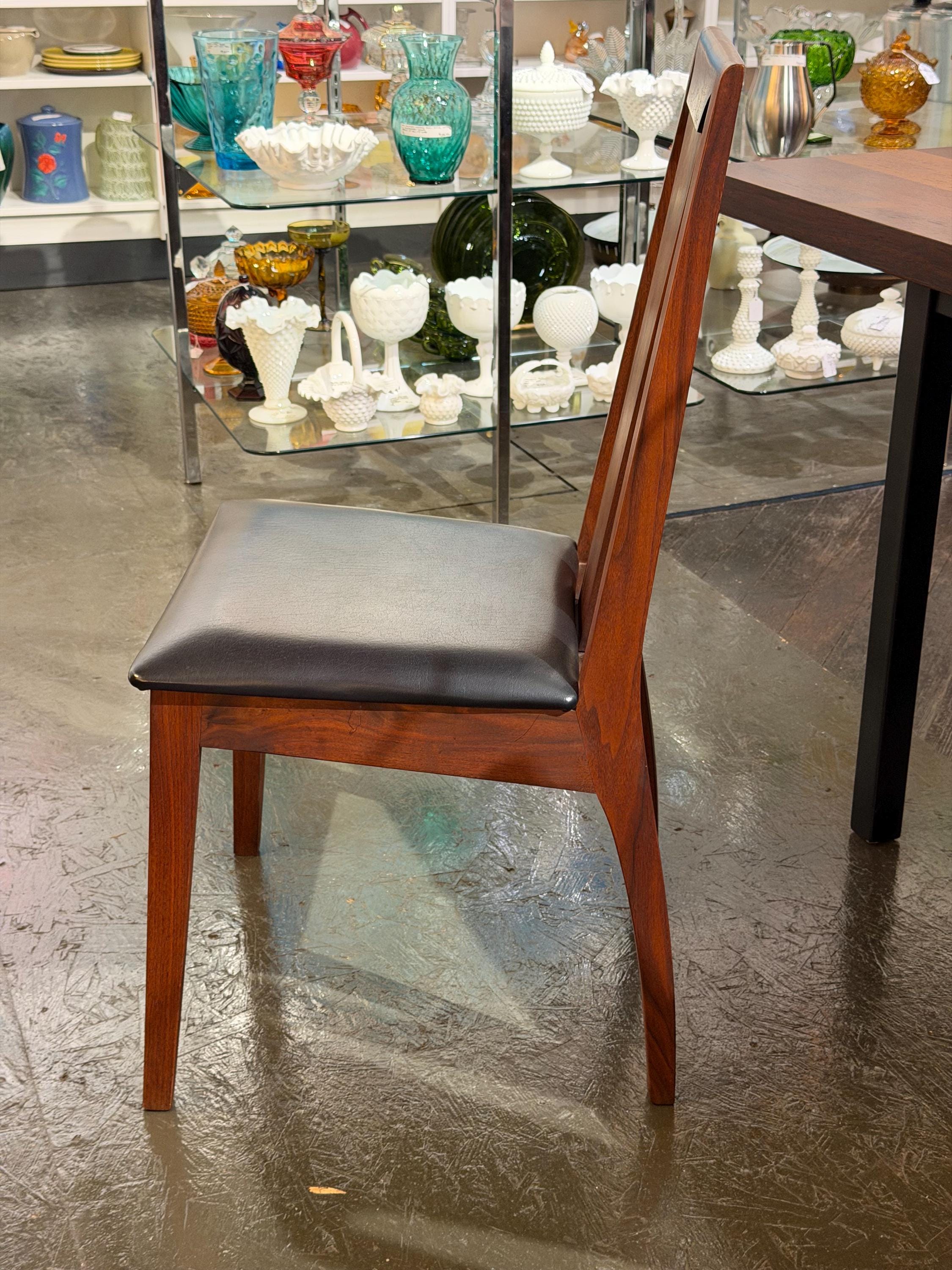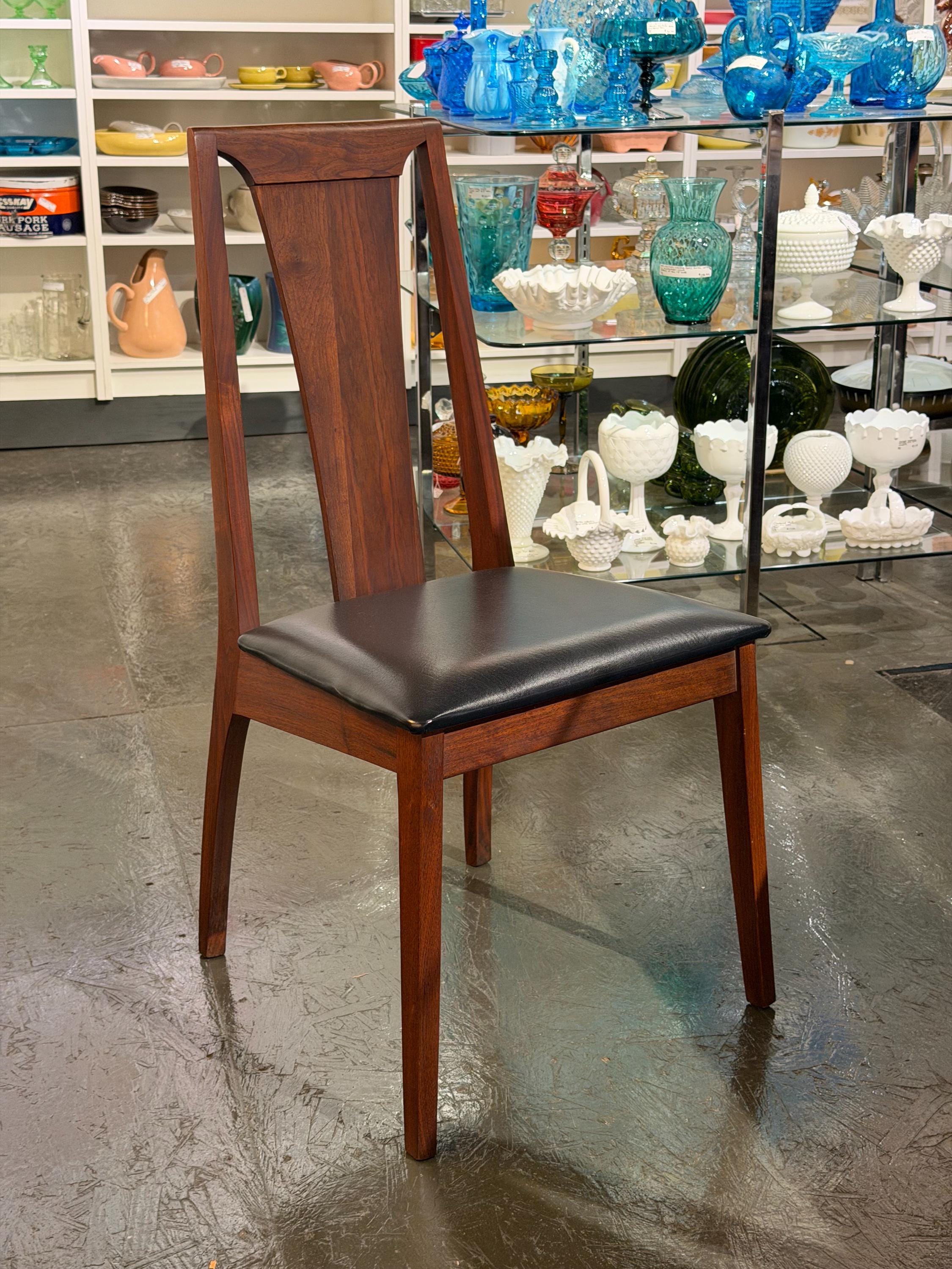 The chairs retain their original black vinyl upholstered seats, all of which are clean and free from stains or tears. Structurally, each chair is sturdy and well-balanced, with gracefully curved rear legs that angle outward—an elegant design detail that enhances their distinctive mid-century character.