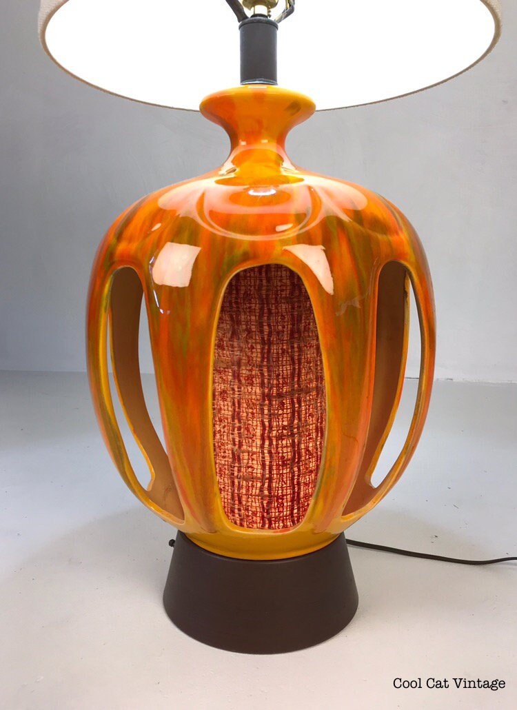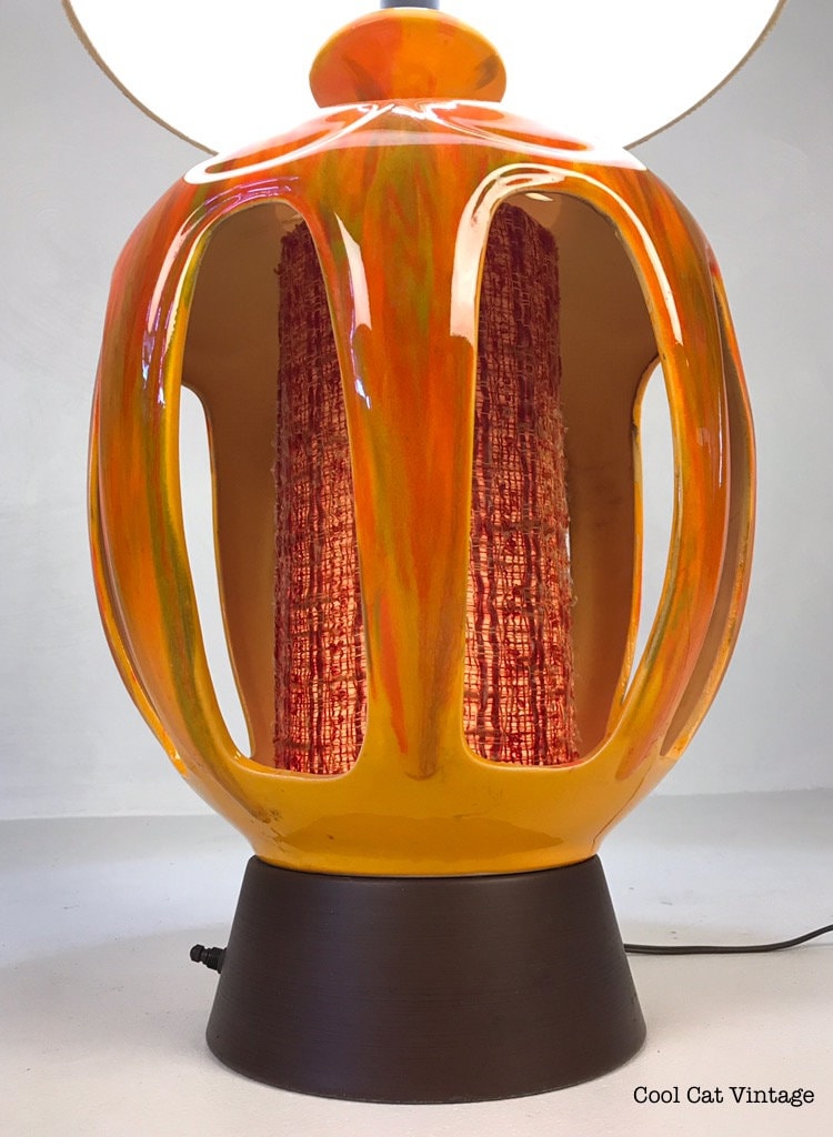 This beautiful mid century orange drip glaze table lamp is in great original working condition. The base portion inside lights up with its own switch separate from the switch for the top portion! This would be a great stand out addition to any room in your house.