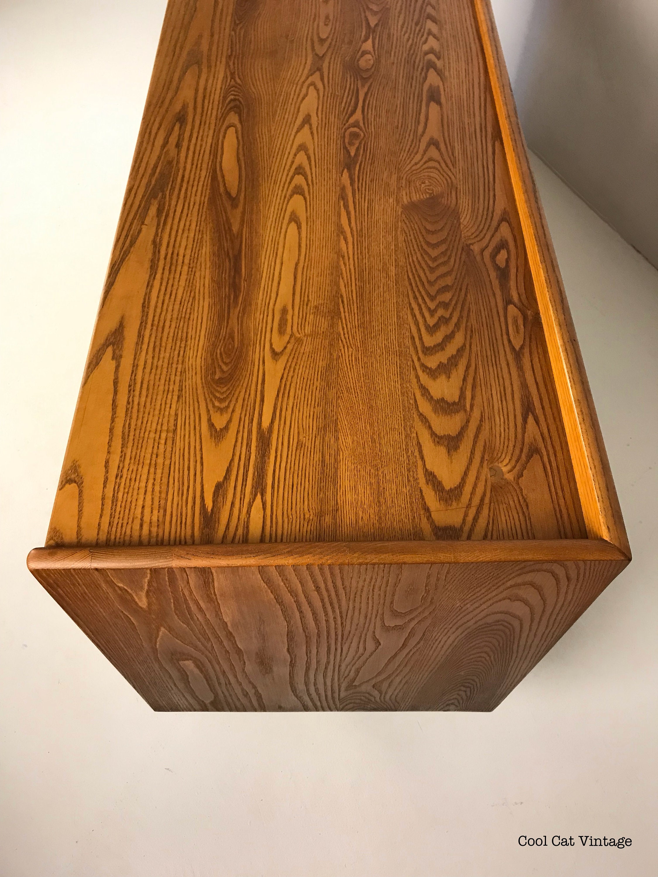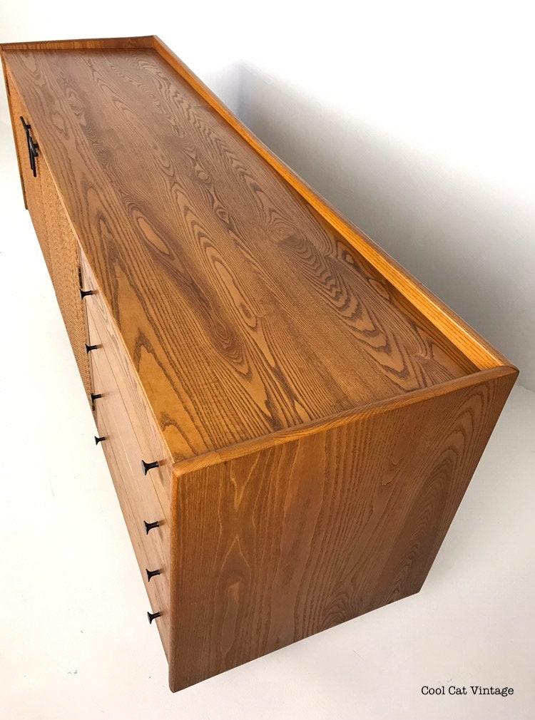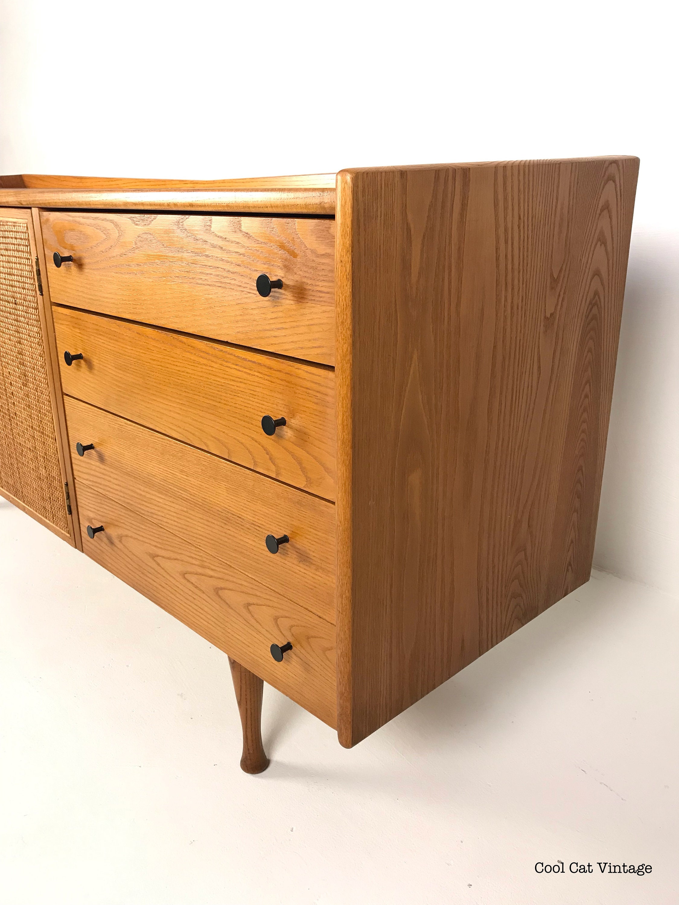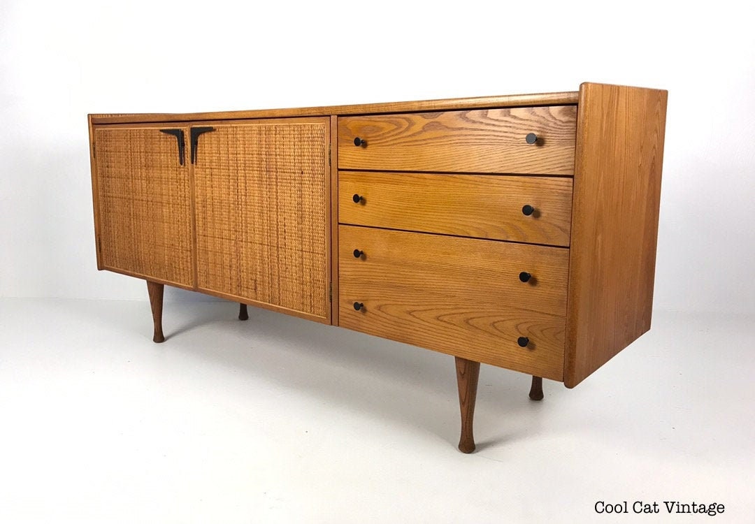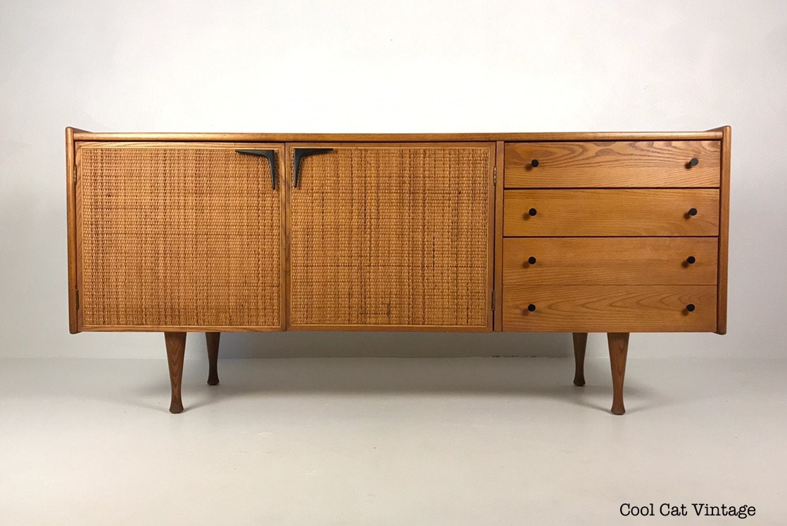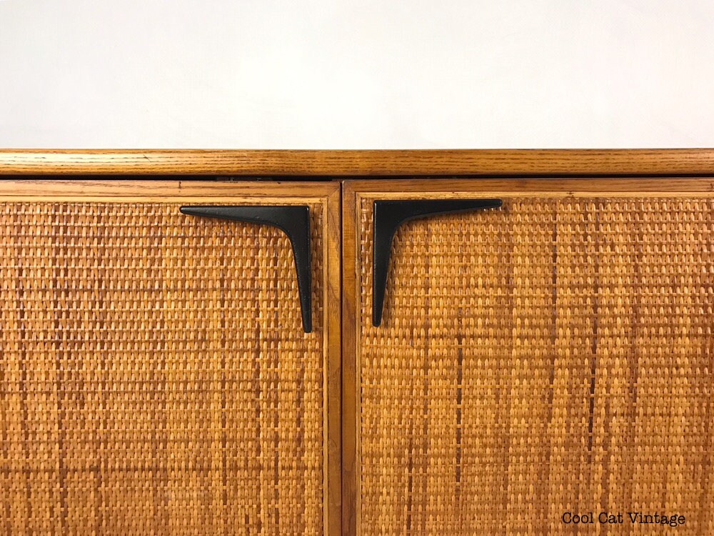 This piece has two caned doors on the front left (in perfect condition) with black cast iron boomerang style handles and two pull out blonde shelves inside. On the right there are three drawers, the top drawer has dividers for your silverware, the second/middle drawer is a regular drawer and the bottom drawer is double the depth of the top two for storing larger items.