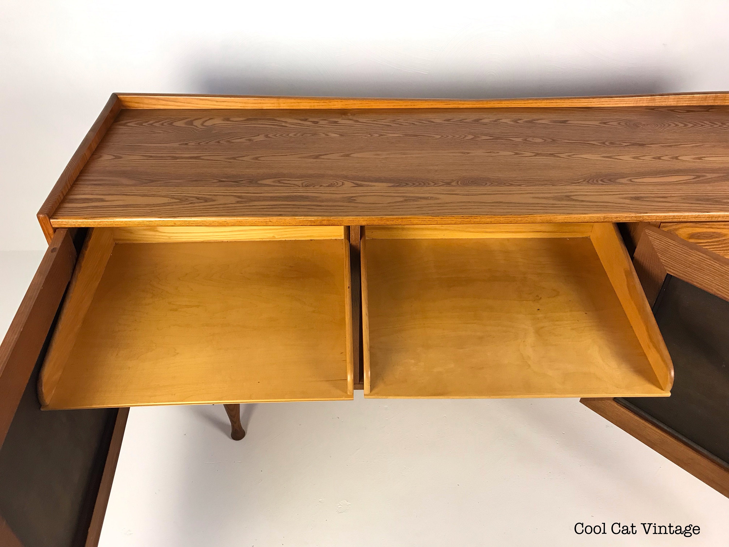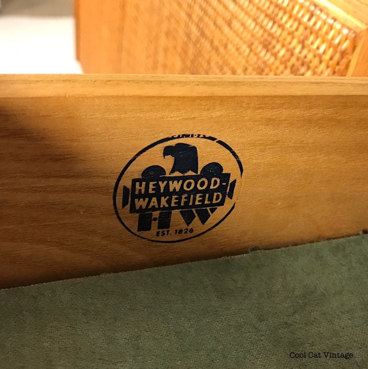 Here is a very nice and hard to find Heywood Wakefield credenza (model no. A654), this was part of Heywood Wakefield’s “Danish Modern” line, circa 1961. Crafted from solid oak and in true Heywood Wakefield style this piece has a teak stain applied similar to the more common Wheat and Champagne stained piece found on the market today.