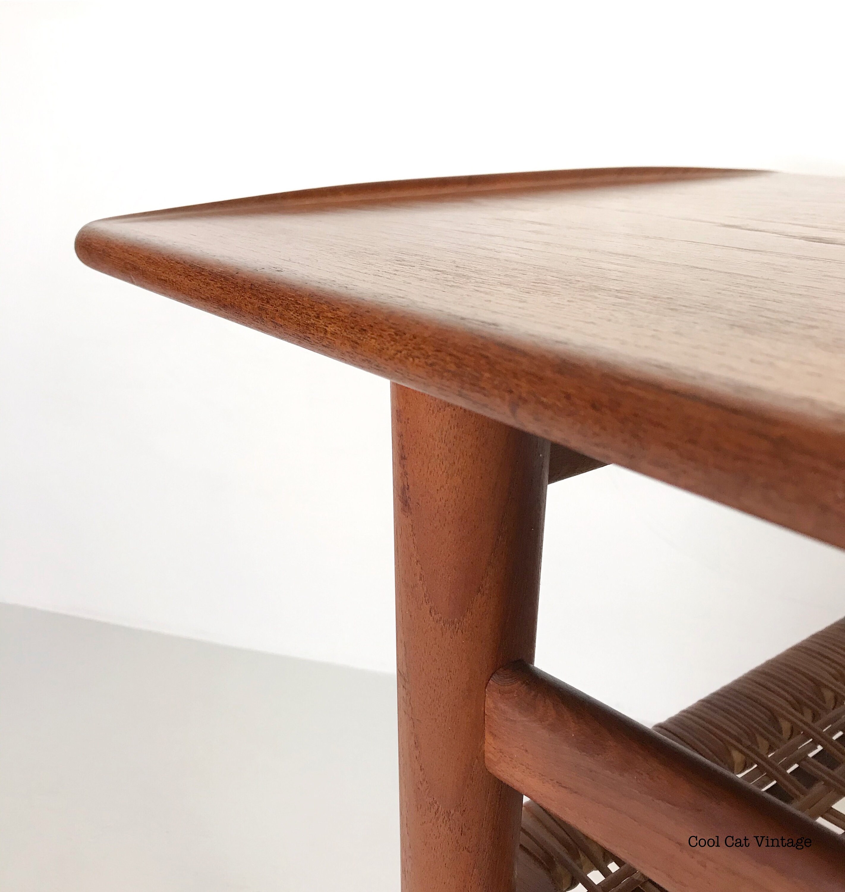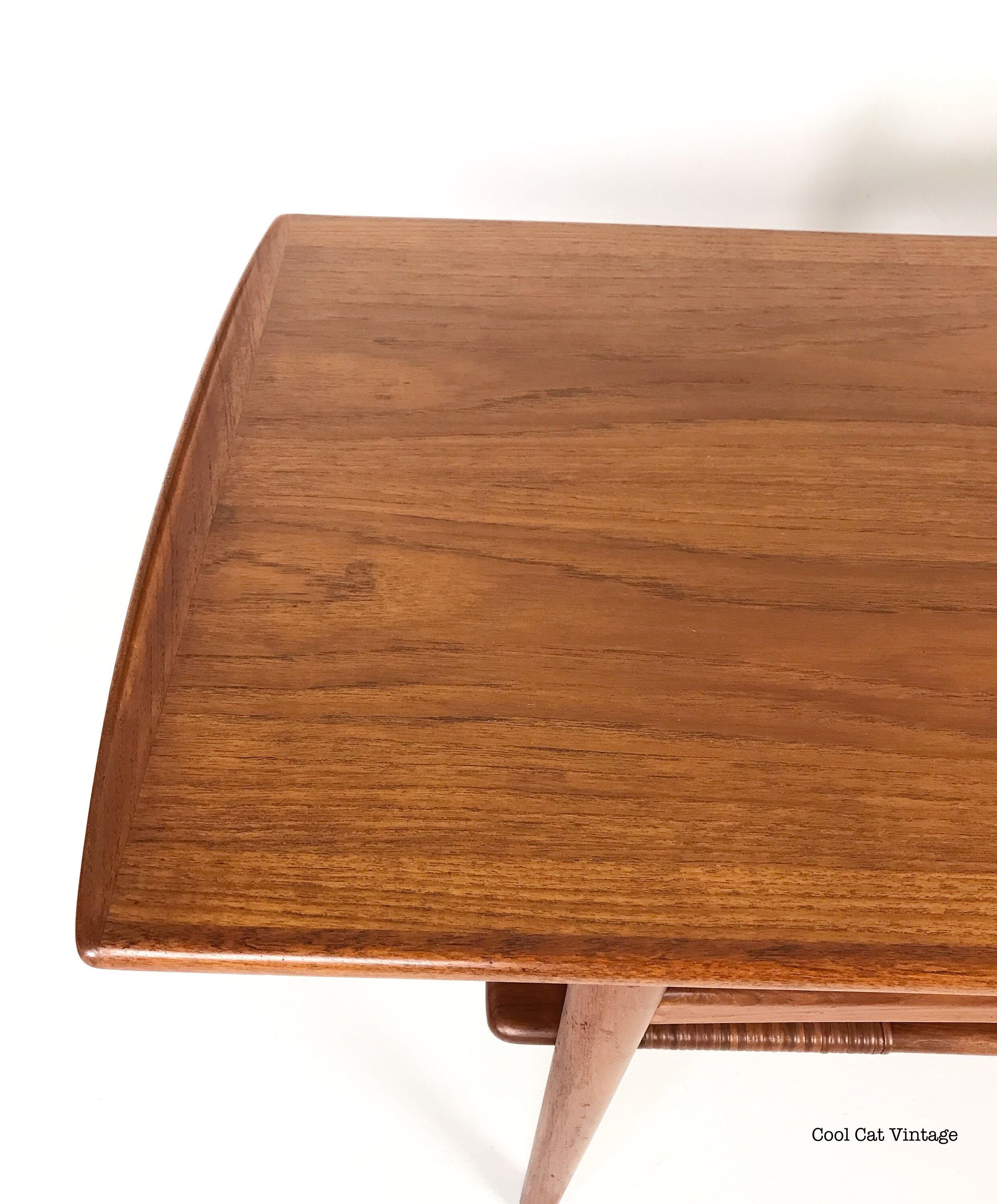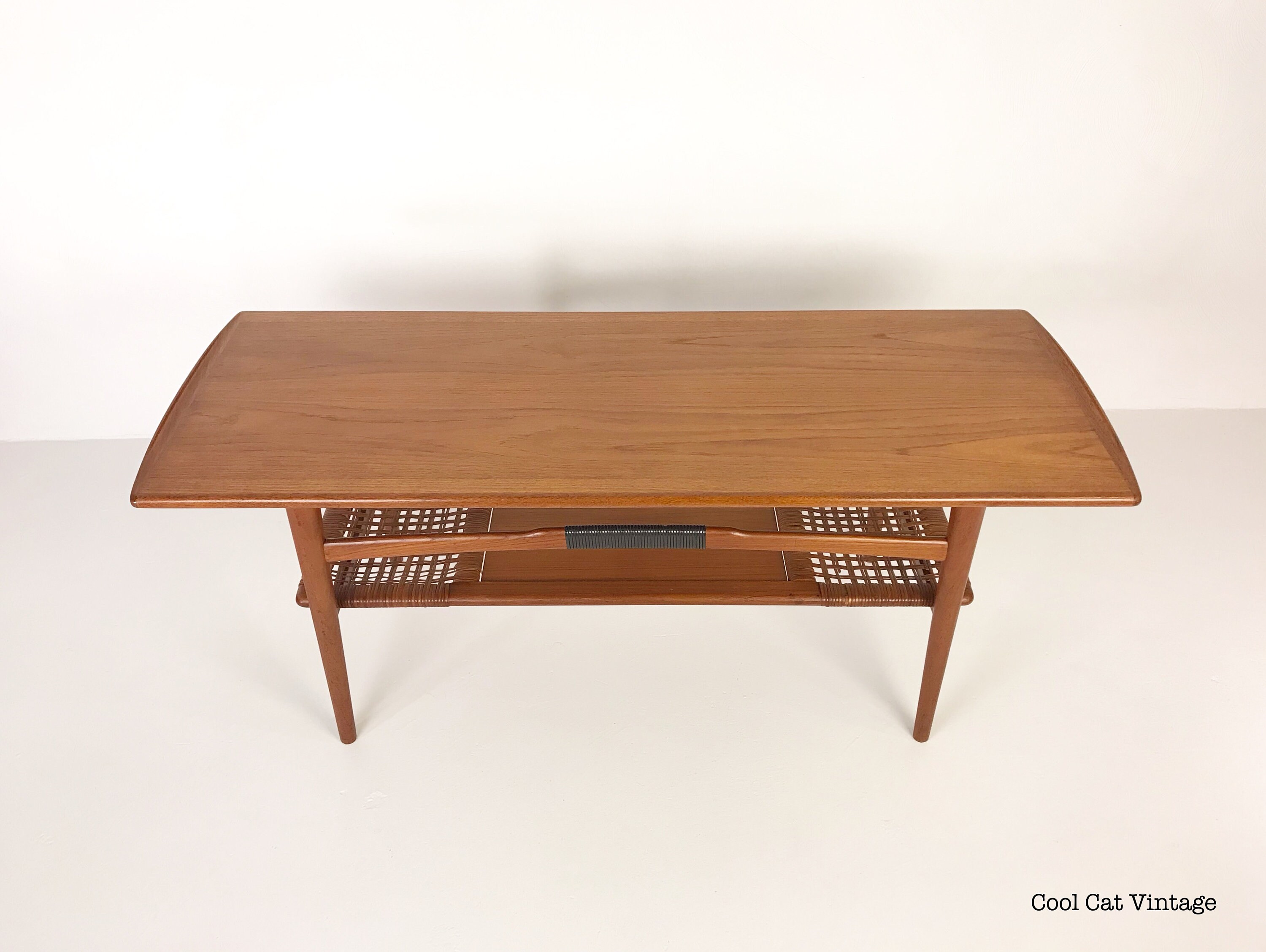 Here is a beautifully restored Danish teak coffee table with a partially caned shelf, circa 1960s. This piece was crafted in Denmark in the early 1960s and showcases a very nice surfboard style table-top. Underneath the tabletop is a long teak shelf with caning on either end. The caning does show some signs of wear and we decided to keep this part original. This table was taken apart for restoration and carefully re-assembled. This piece sits solid and is in overall good restored condition.