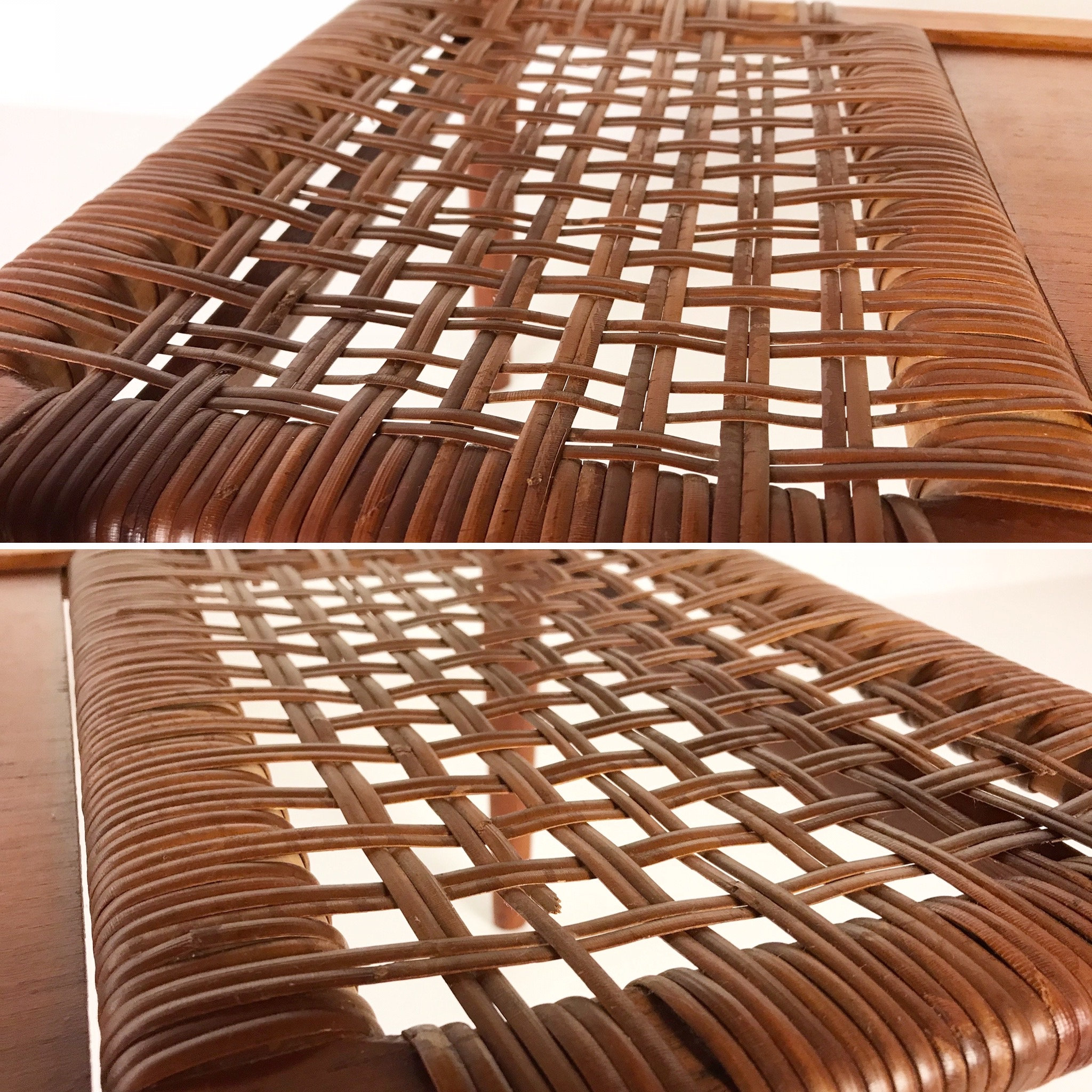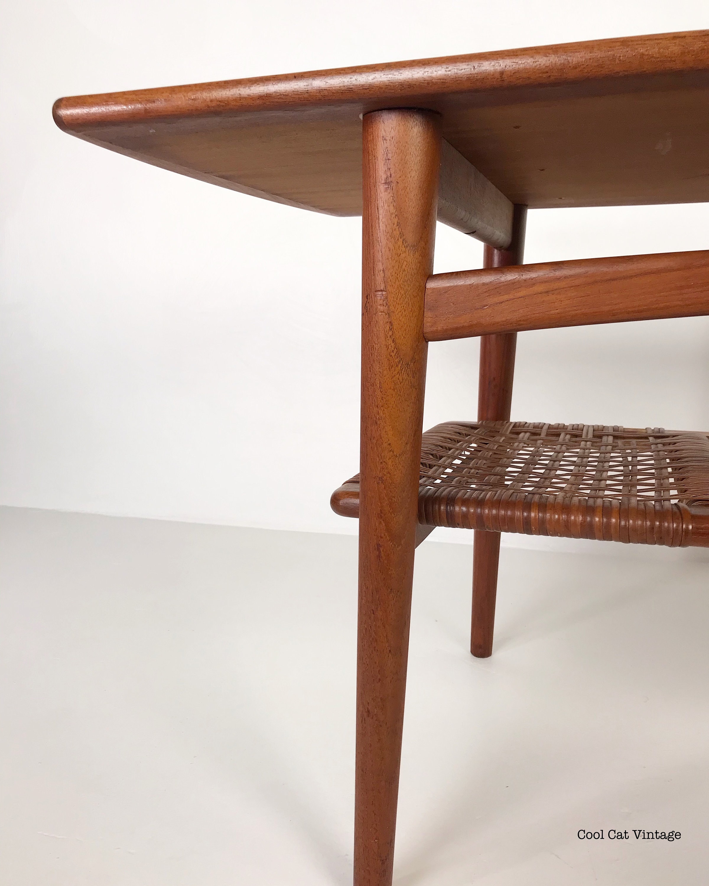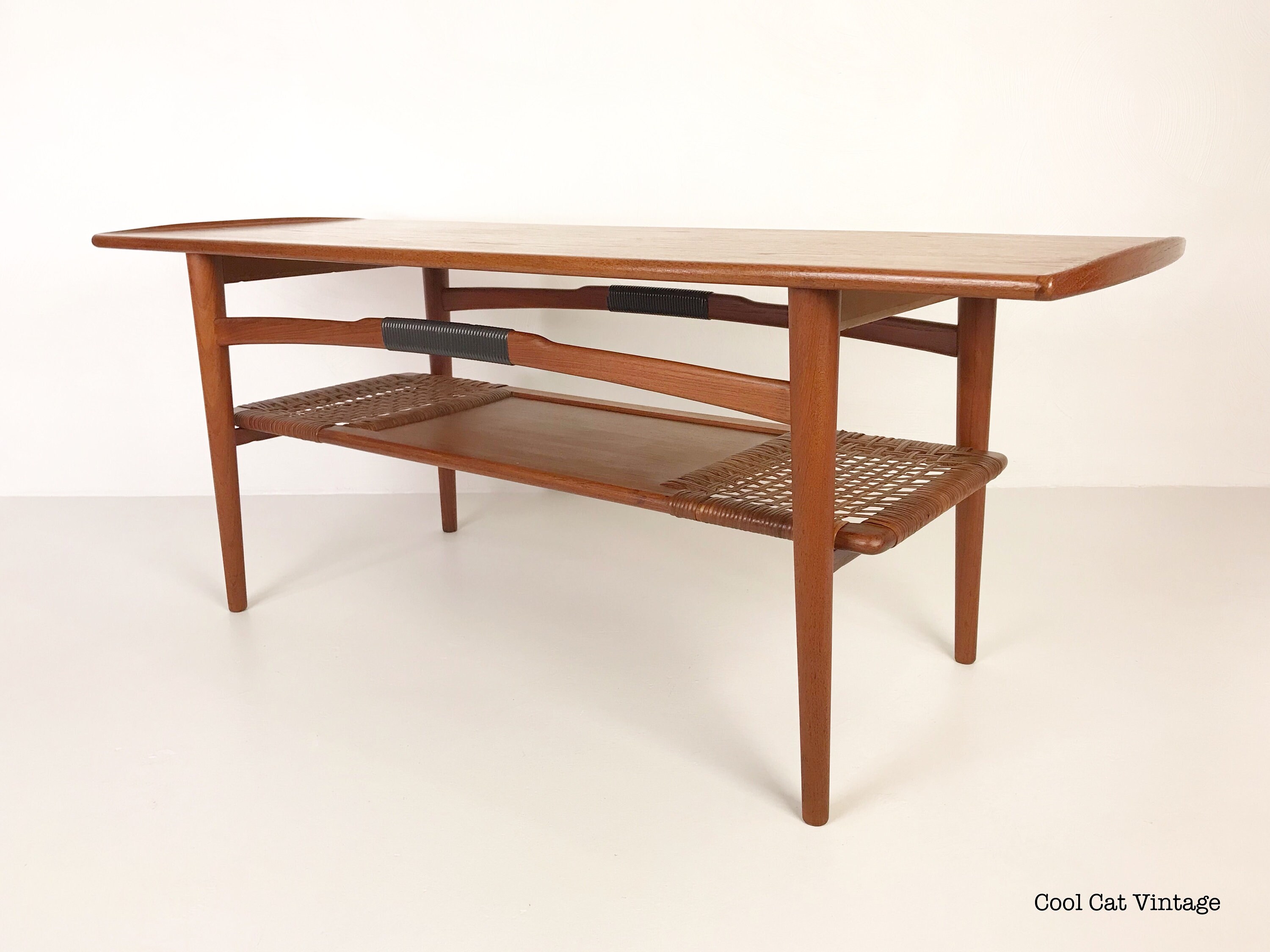 Here is a beautifully restored Danish teak coffee table with a partially caned shelf, circa 1960s. This piece was crafted in Denmark in the early 1960s and showcases a very nice surfboard style table-top. Underneath the tabletop is a long teak shelf with caning on either end. The caning does show some signs of wear and we decided to keep this part original. This table was taken apart for restoration and carefully re-assembled. This piece sits solid and is in overall good restored condition.