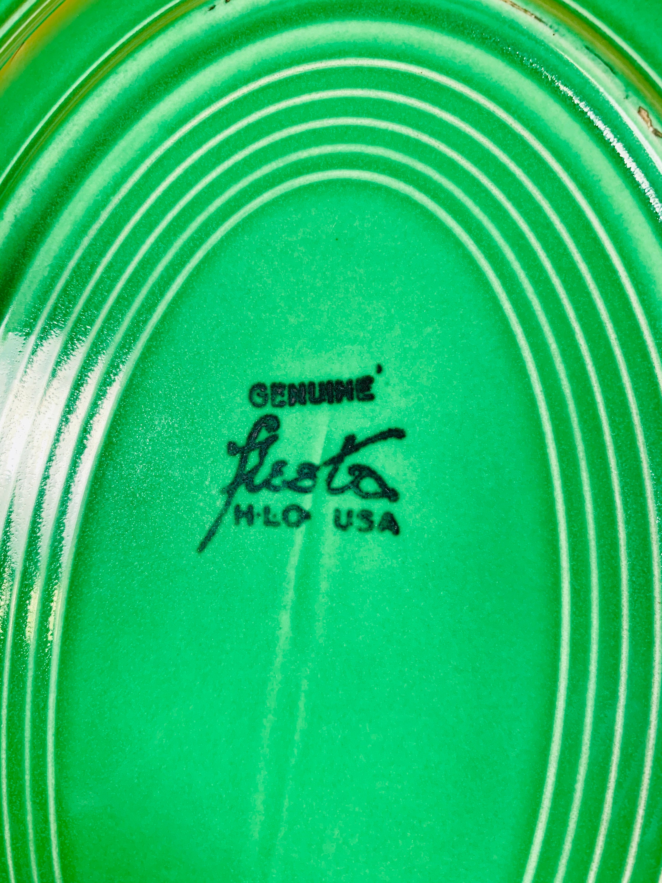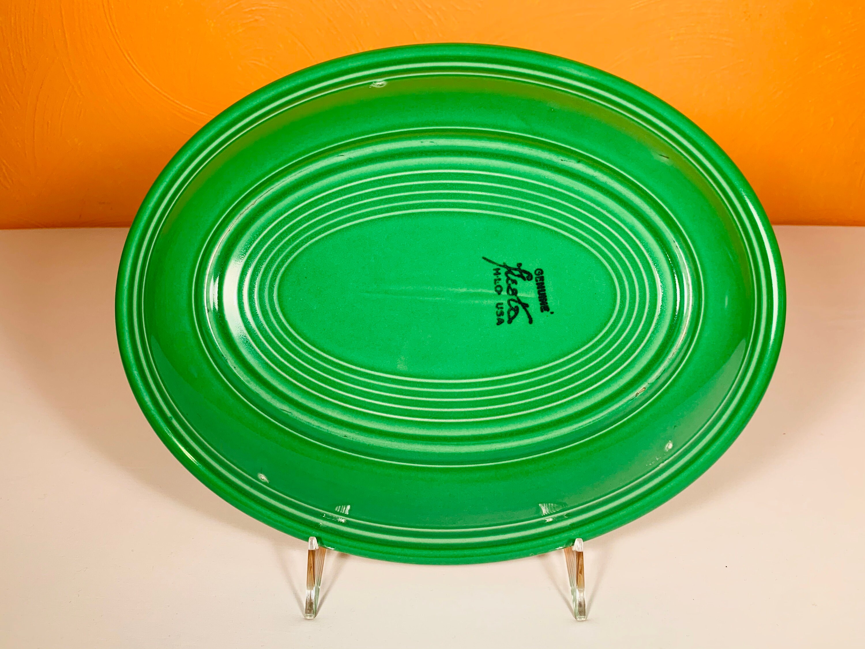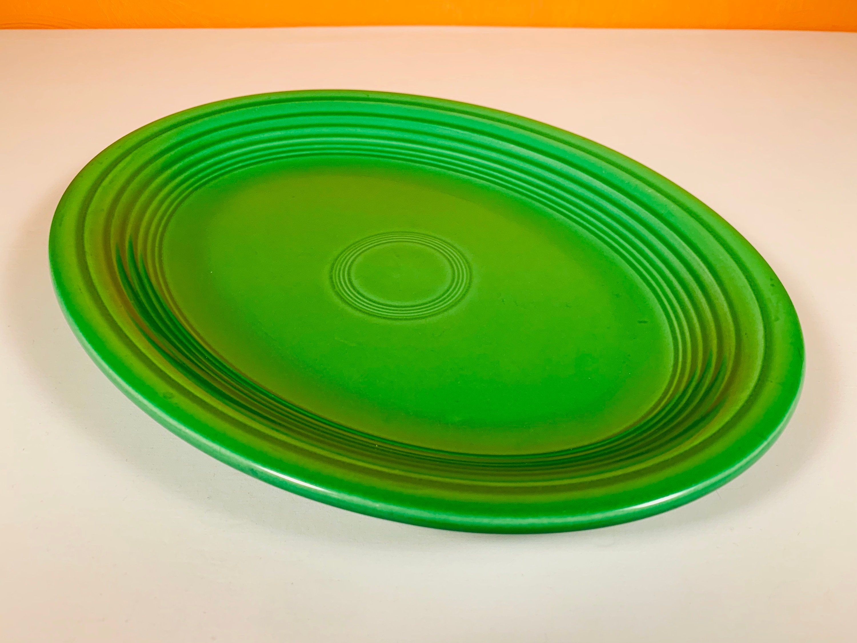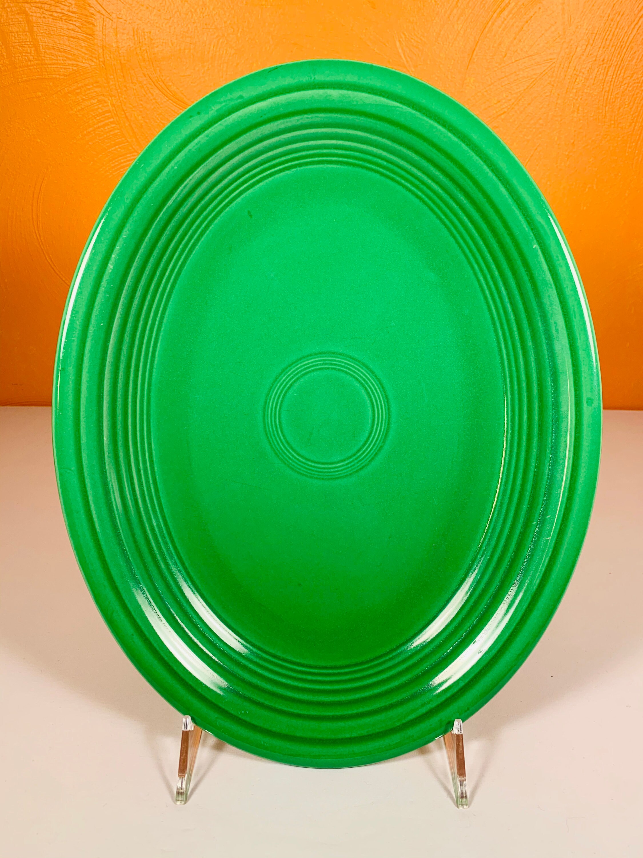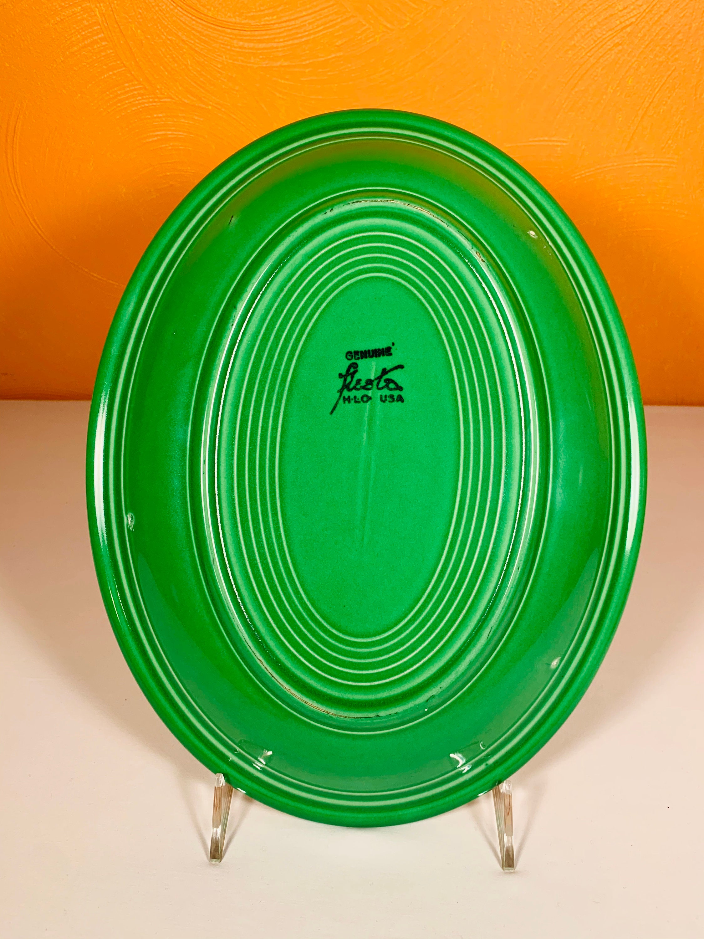 Circa 1959-1969: Medium Green is the hardest and most valuable color to find in Fiesta ware that is pre-1969. This large oval platter in this elusive medium green is a great find. This example is in fantastic condition. No chips, no touch ups, no scuffs, with a wonderful surface and great rich medium green color. Measures 12 5/8" long. Guaranteed medium green.
