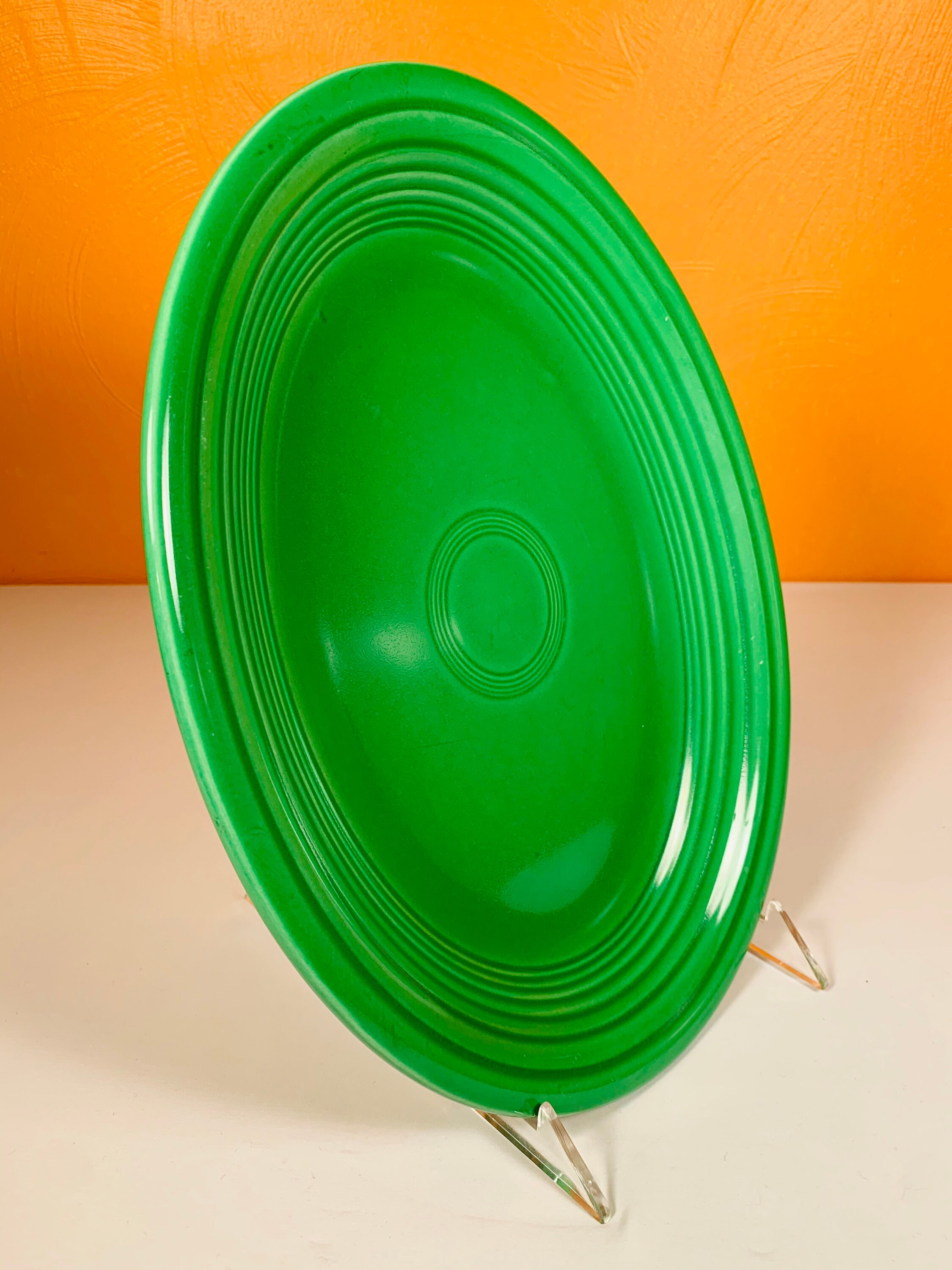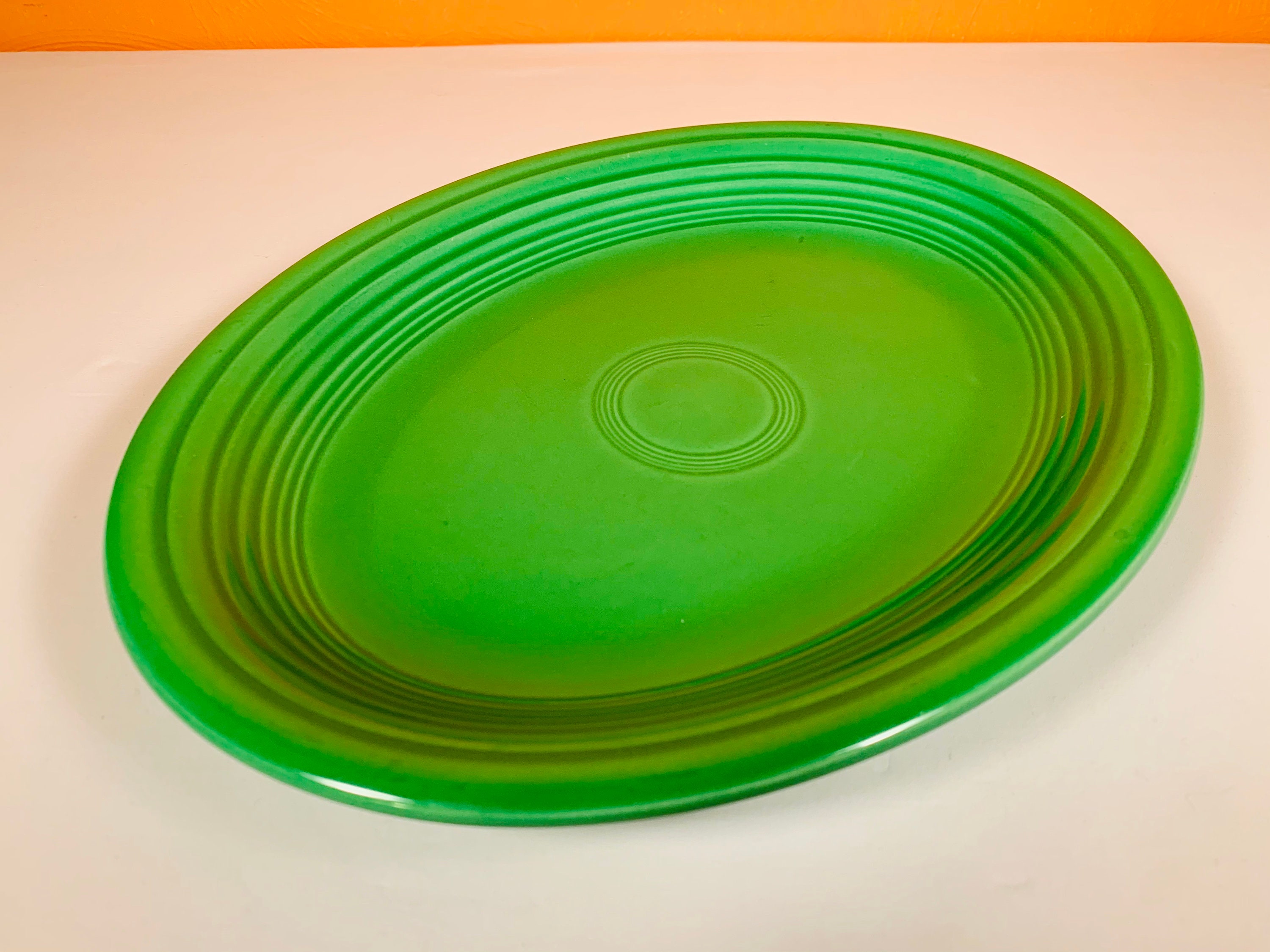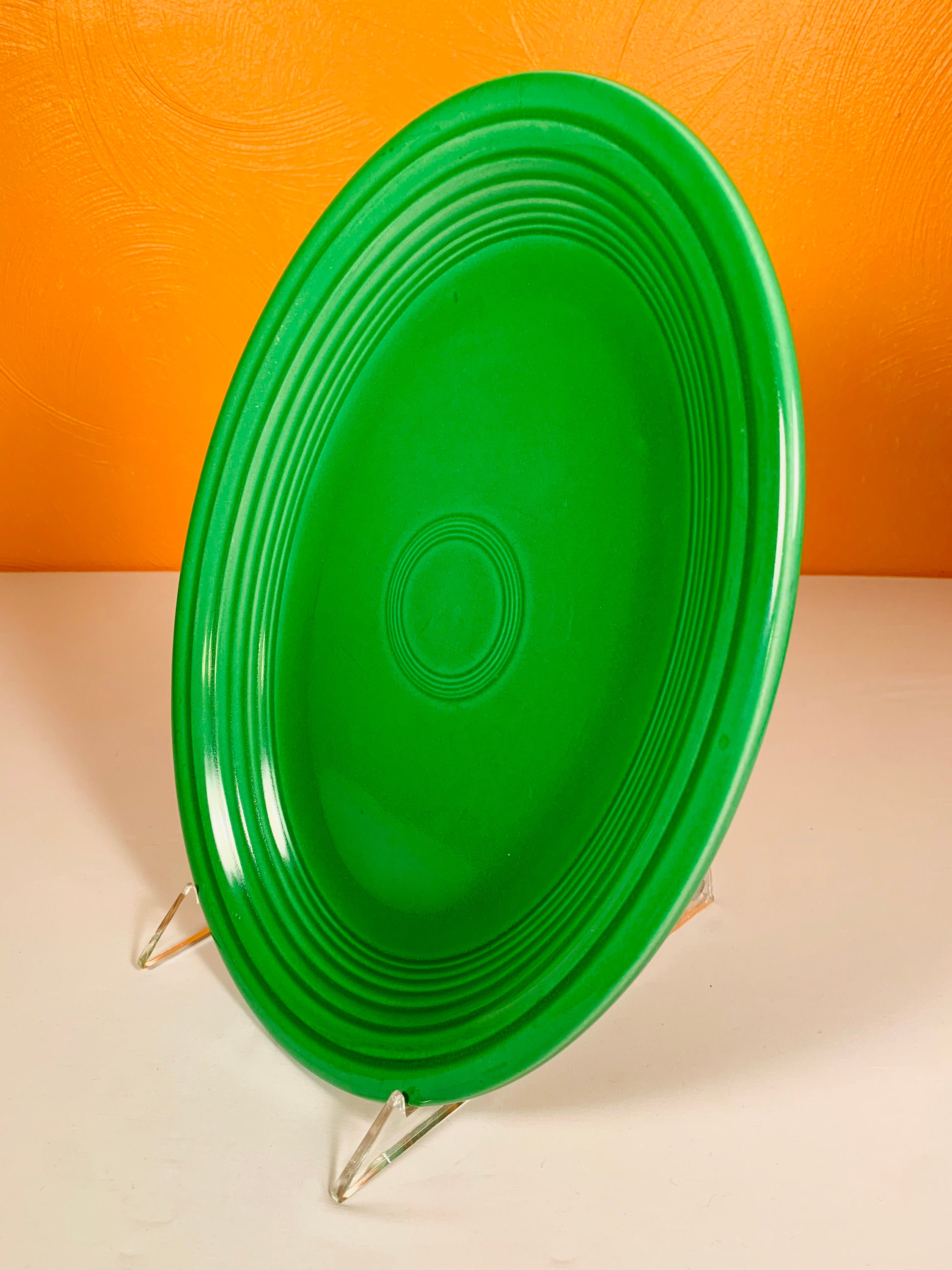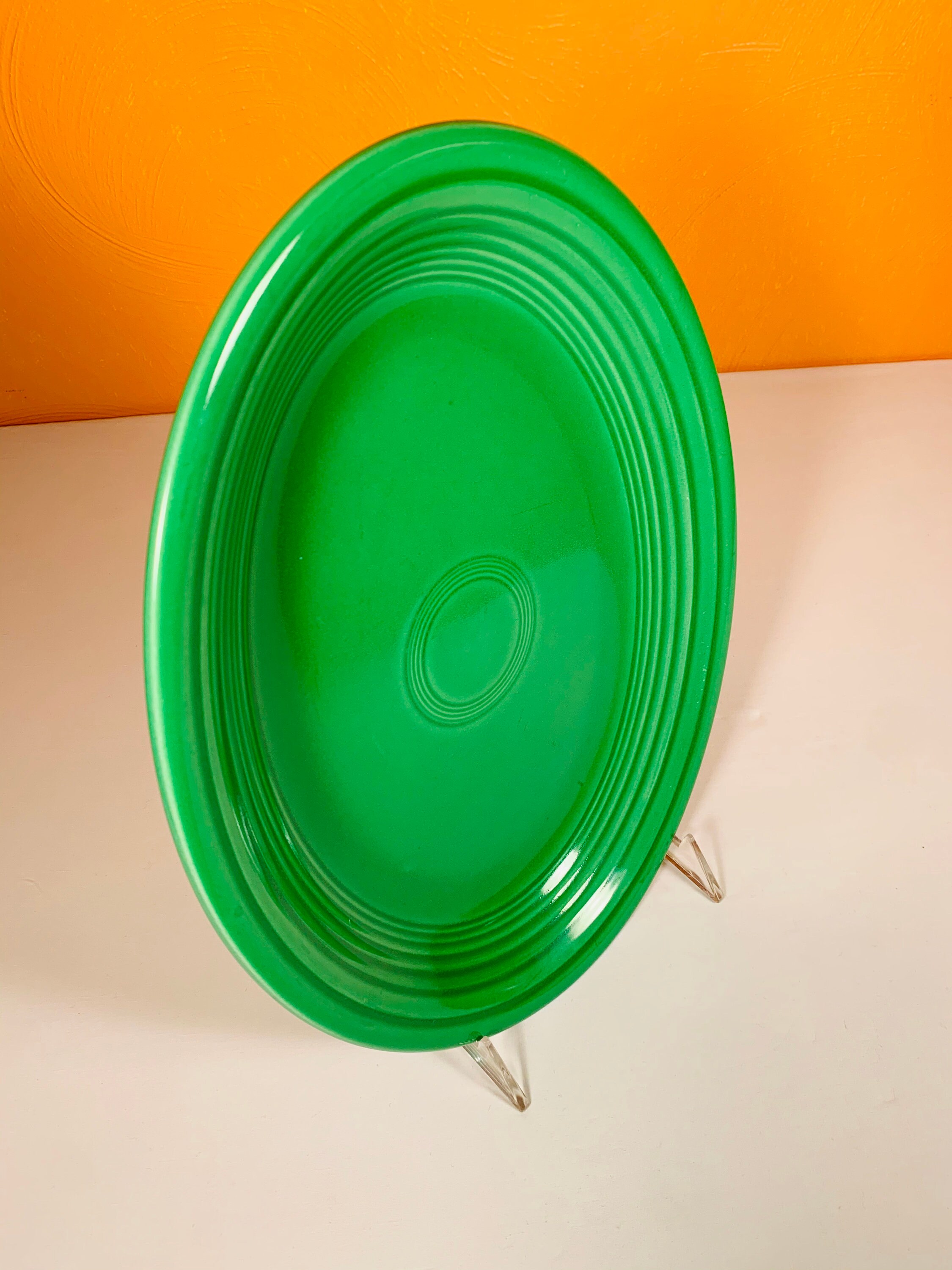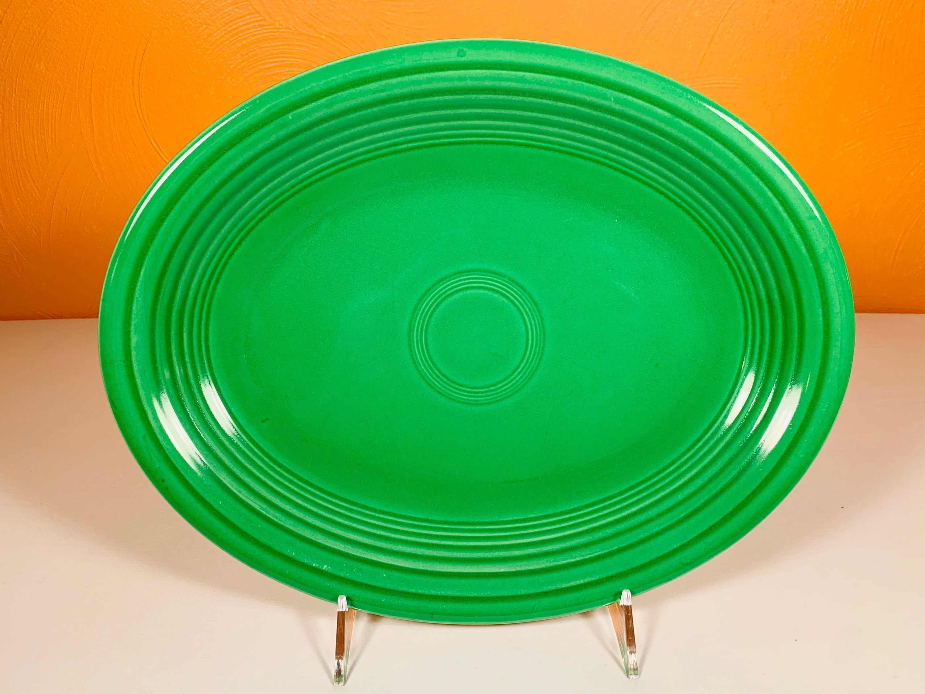 Circa 1959-1969: Medium Green is the hardest and most valuable color to find in Fiesta ware that is pre-1969. This large oval platter in this elusive medium green is a great find. This example is in fantastic condition. No chips, no touch ups, no scuffs, with a wonderful surface and great rich medium green color. Measures 12 5/8" long. Guaranteed medium green.