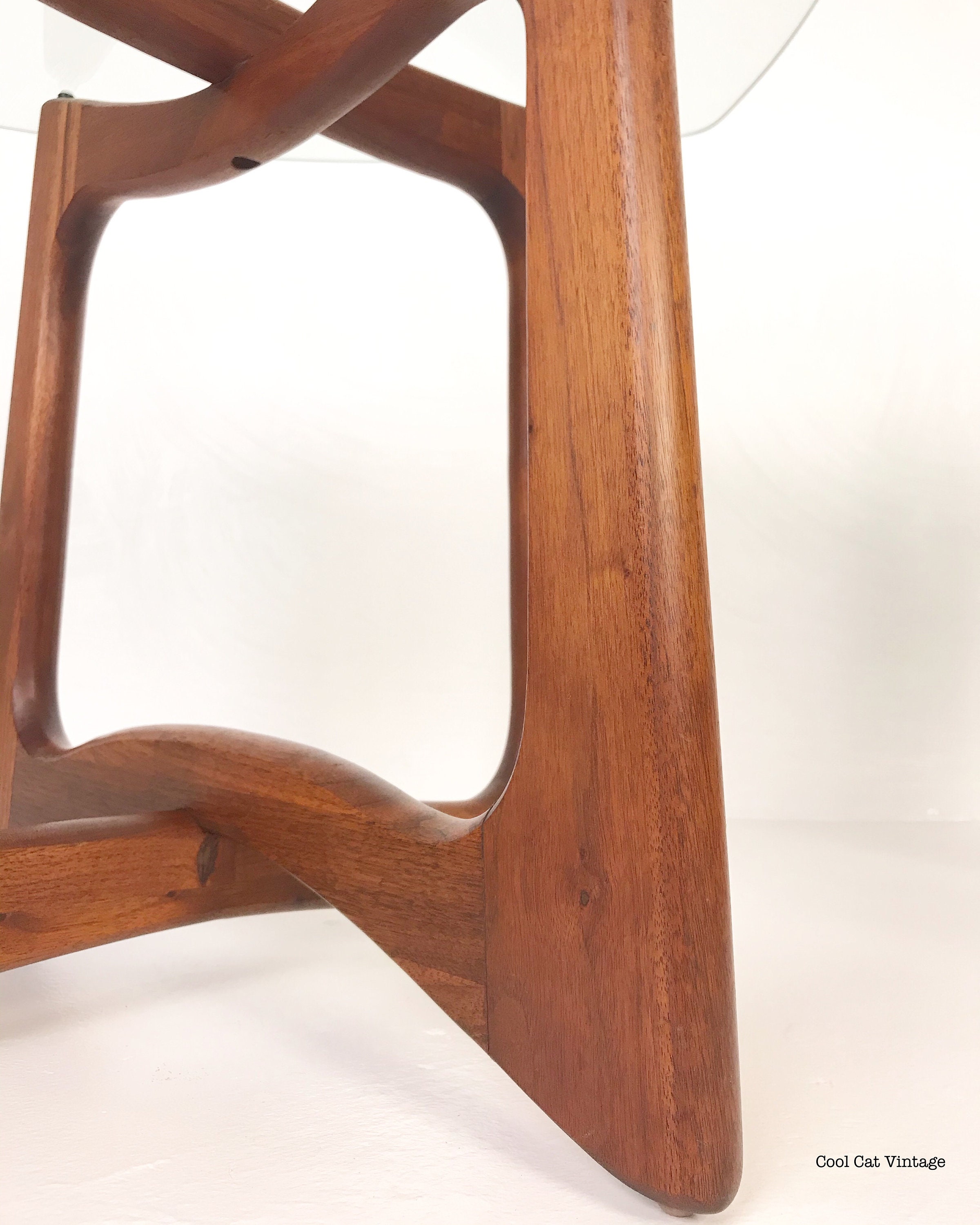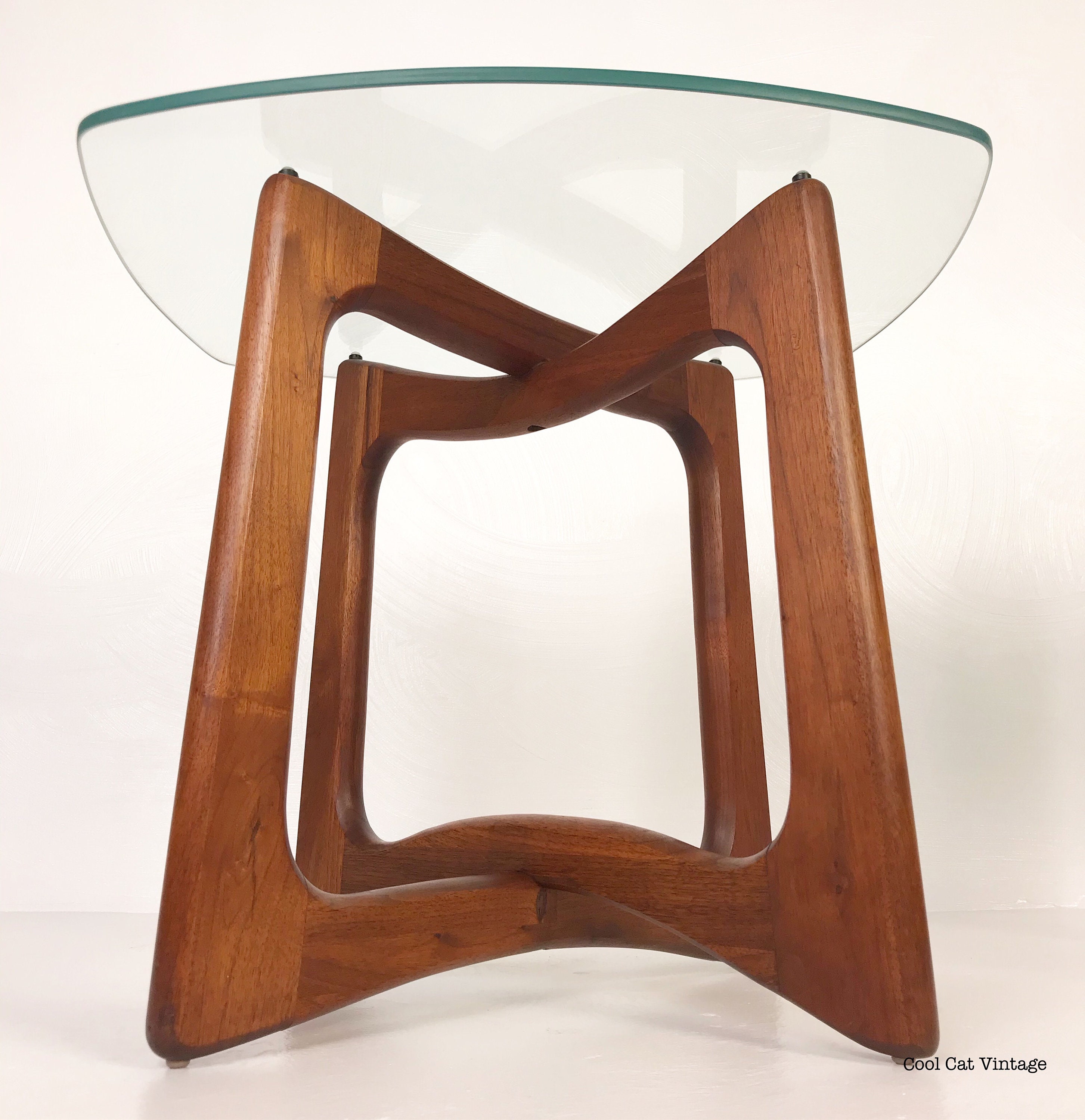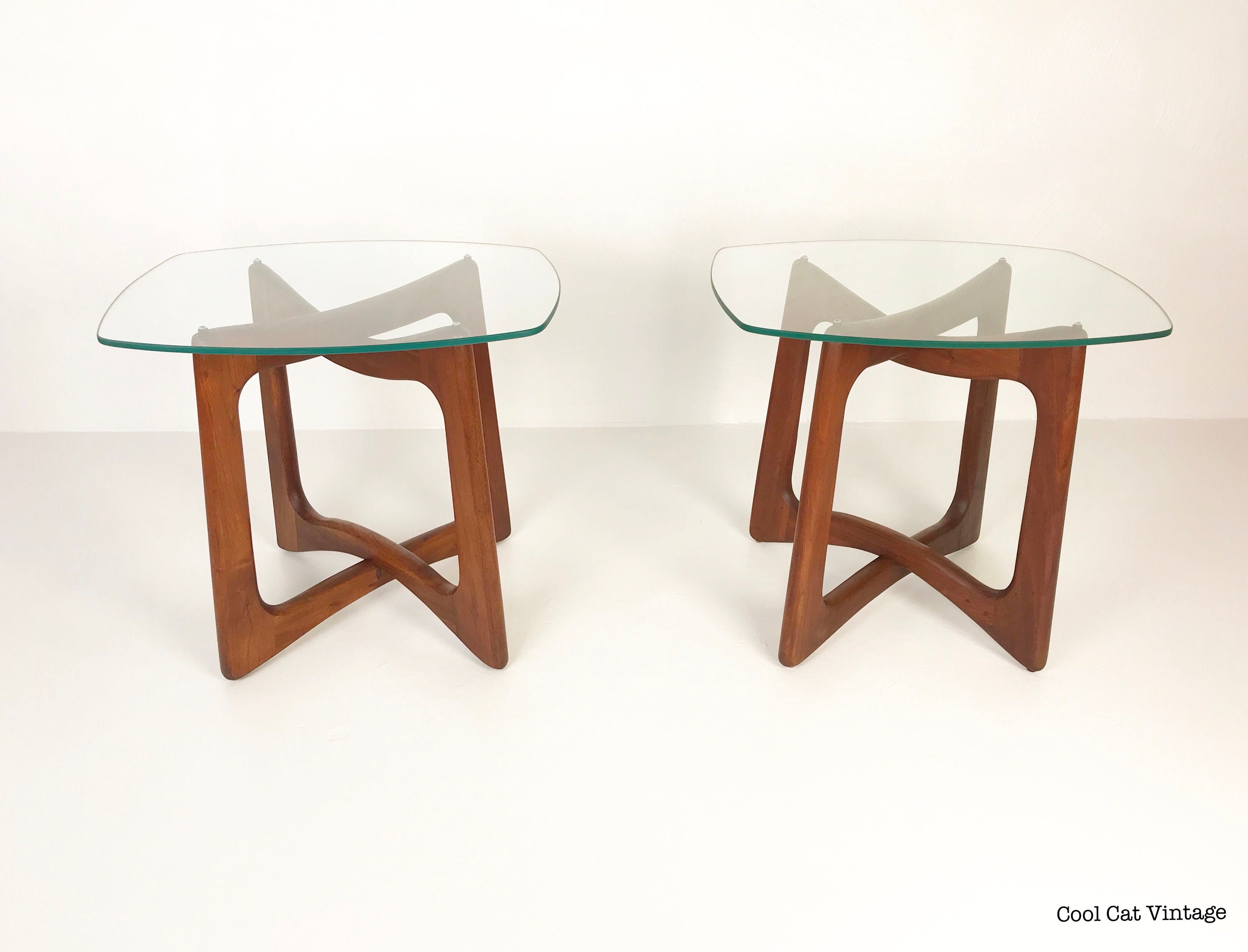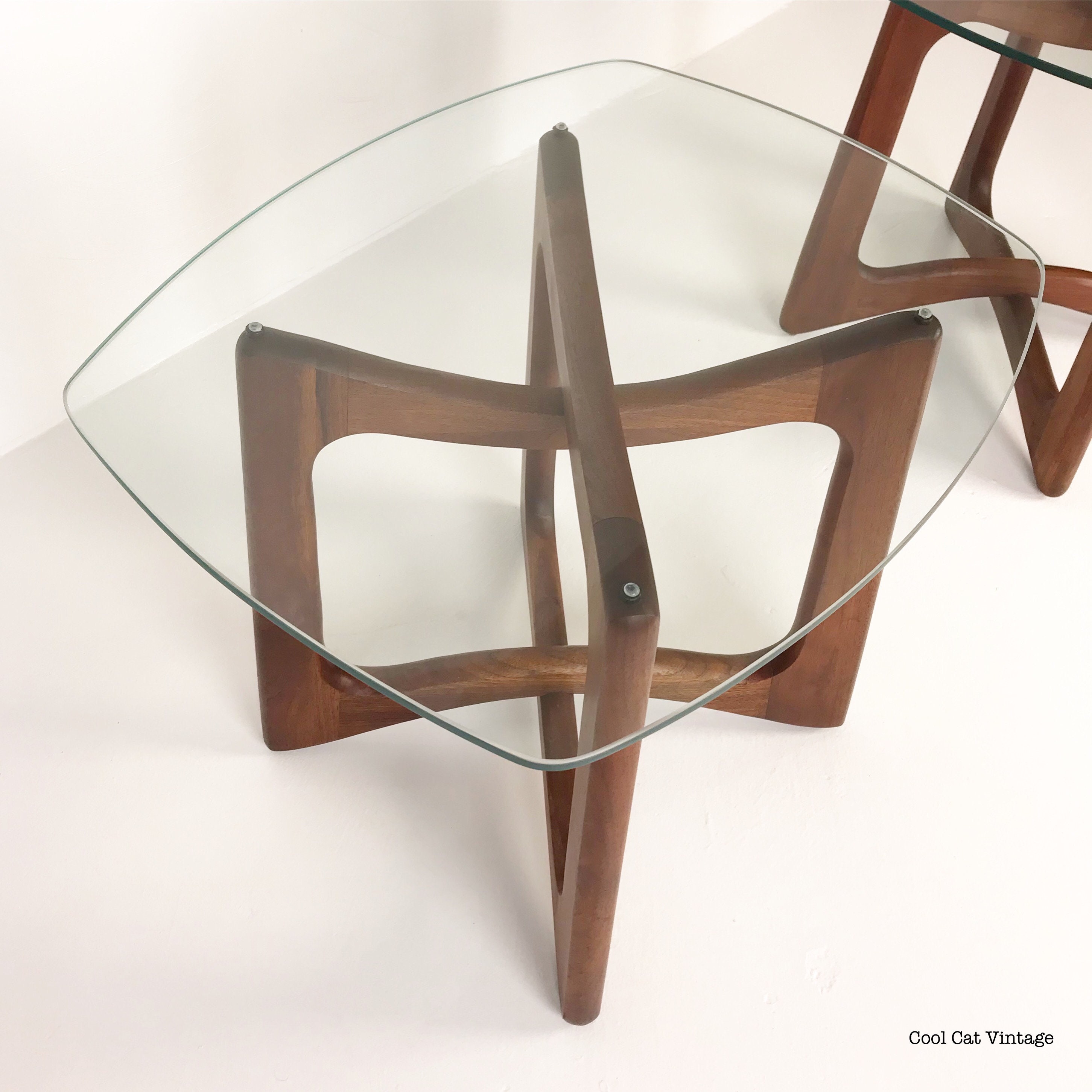 Here is a beautify restored pair of sculpted walnut end tables with glass tops by Adrian Pearsall for Craft Associates, circa 1950s. Each frame was cleaned and polished to bring back their original look and we had our local glass professional cut new glass to match the table's original design specs. The black nubs on the top of each table are new and do have non-slip gel tops. Overall this pair of end tables are in good restored condition.