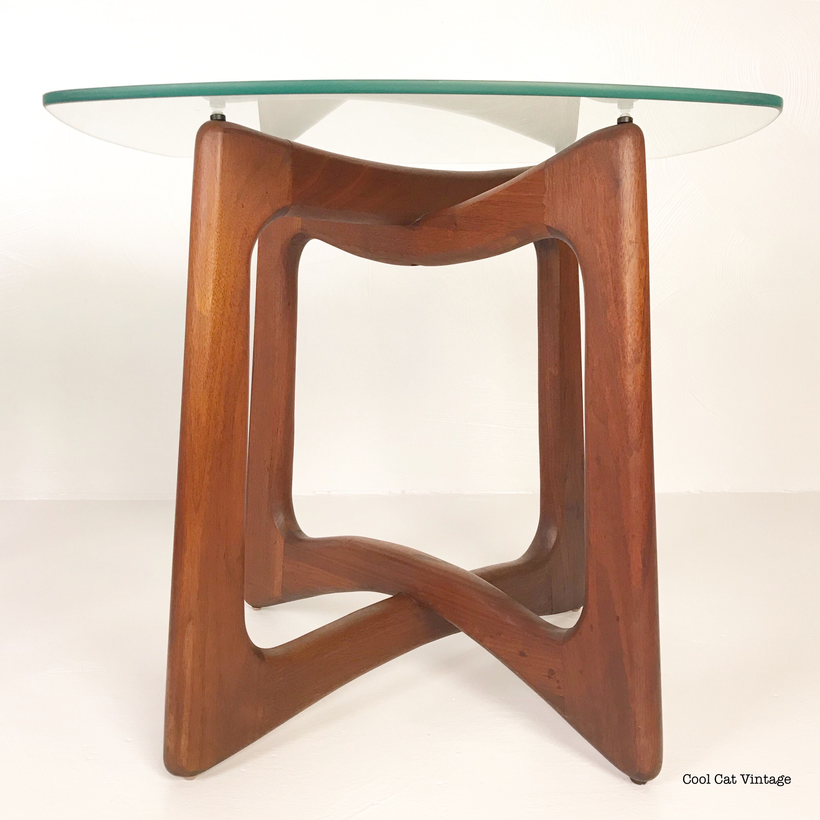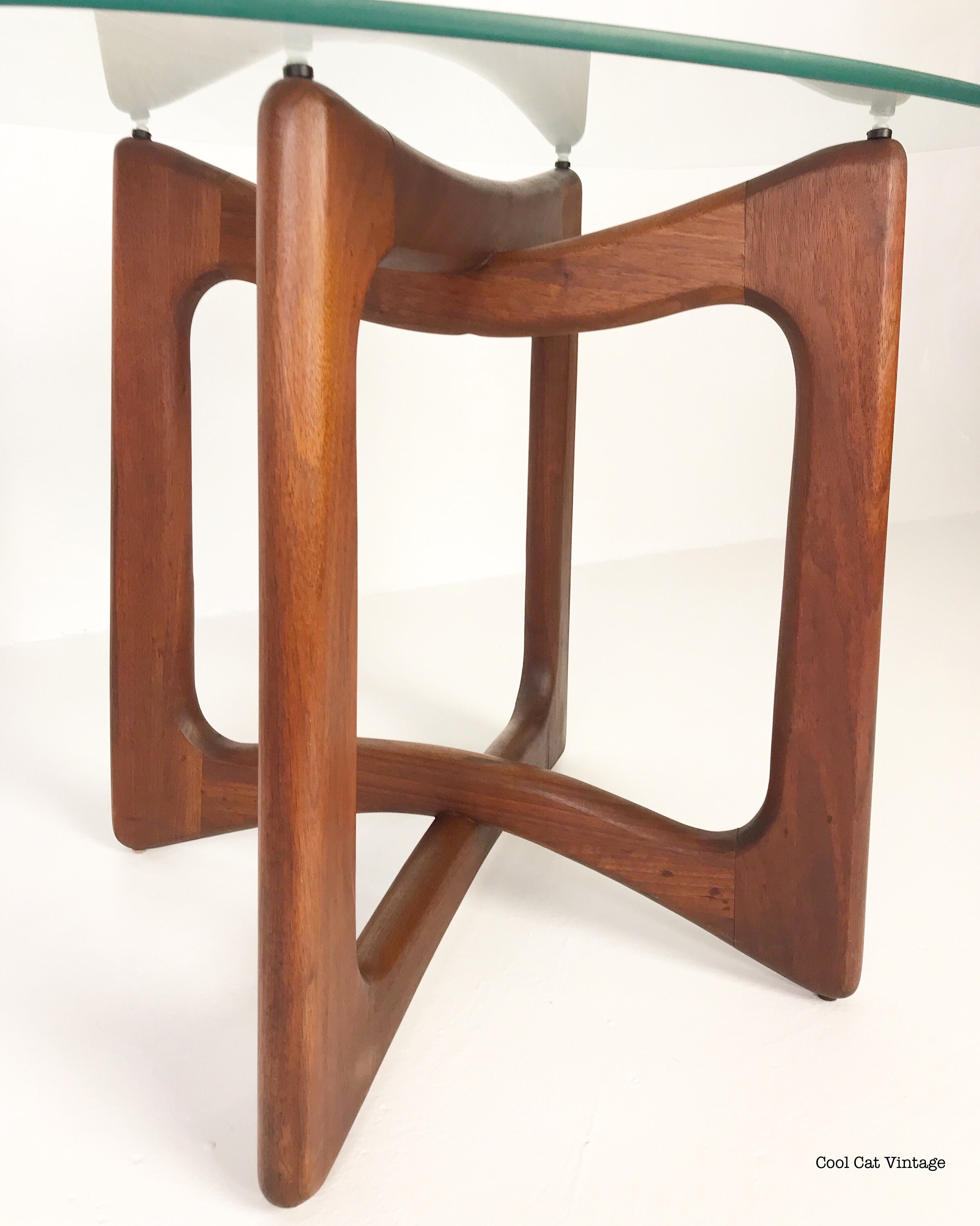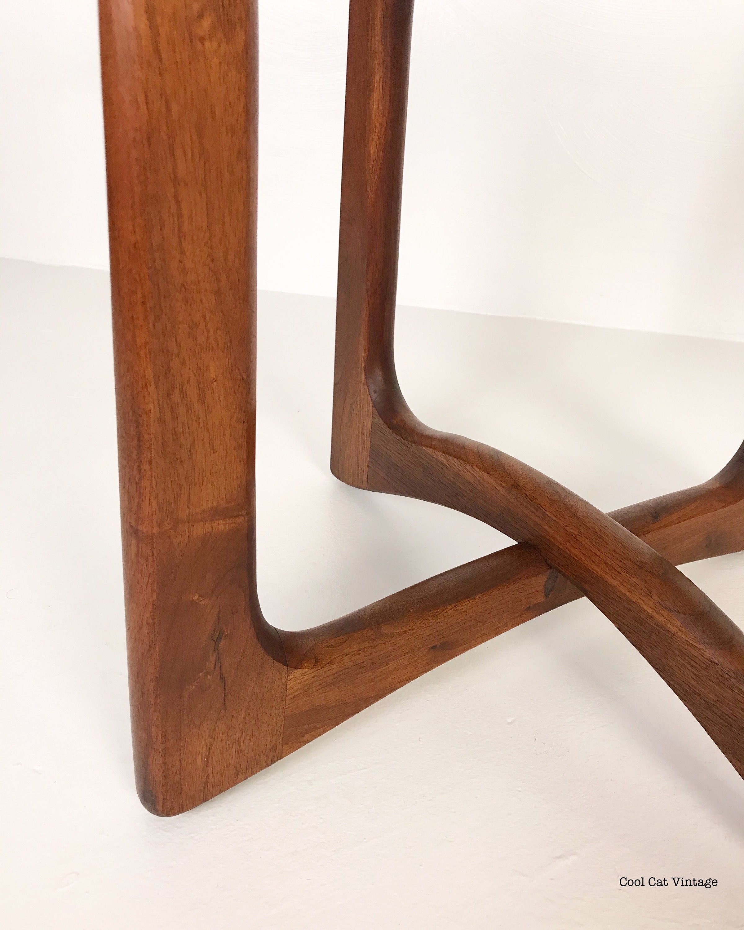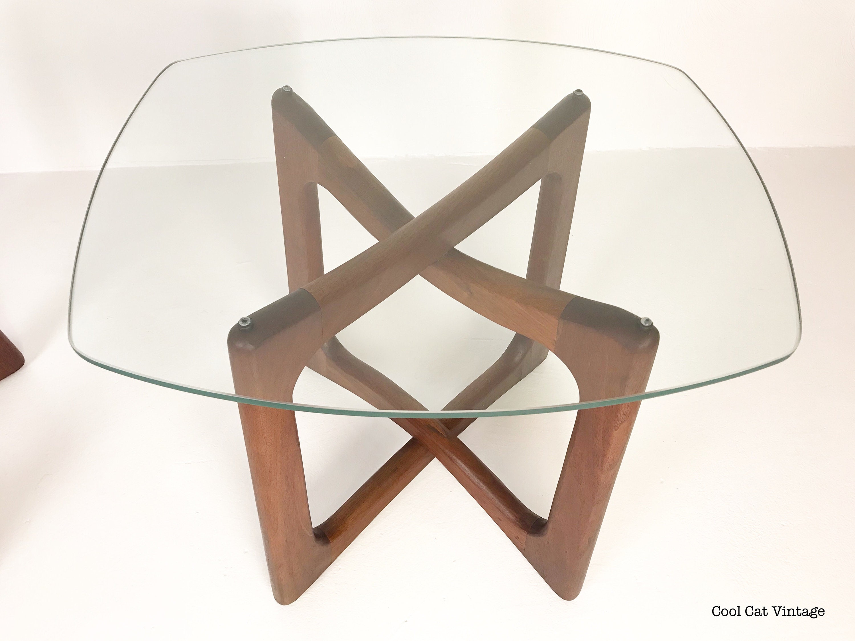 Here is a beautify restored pair of sculpted walnut end tables with glass tops by Adrian Pearsall for Craft Associates, circa 1950s. Each frame was cleaned and polished to bring back their original look and we had our local glass professional cut new glass to match the table's original design specs. The black nubs on the top of each table are new and do have non-slip gel tops. Overall this pair of end tables are in good restored condition.