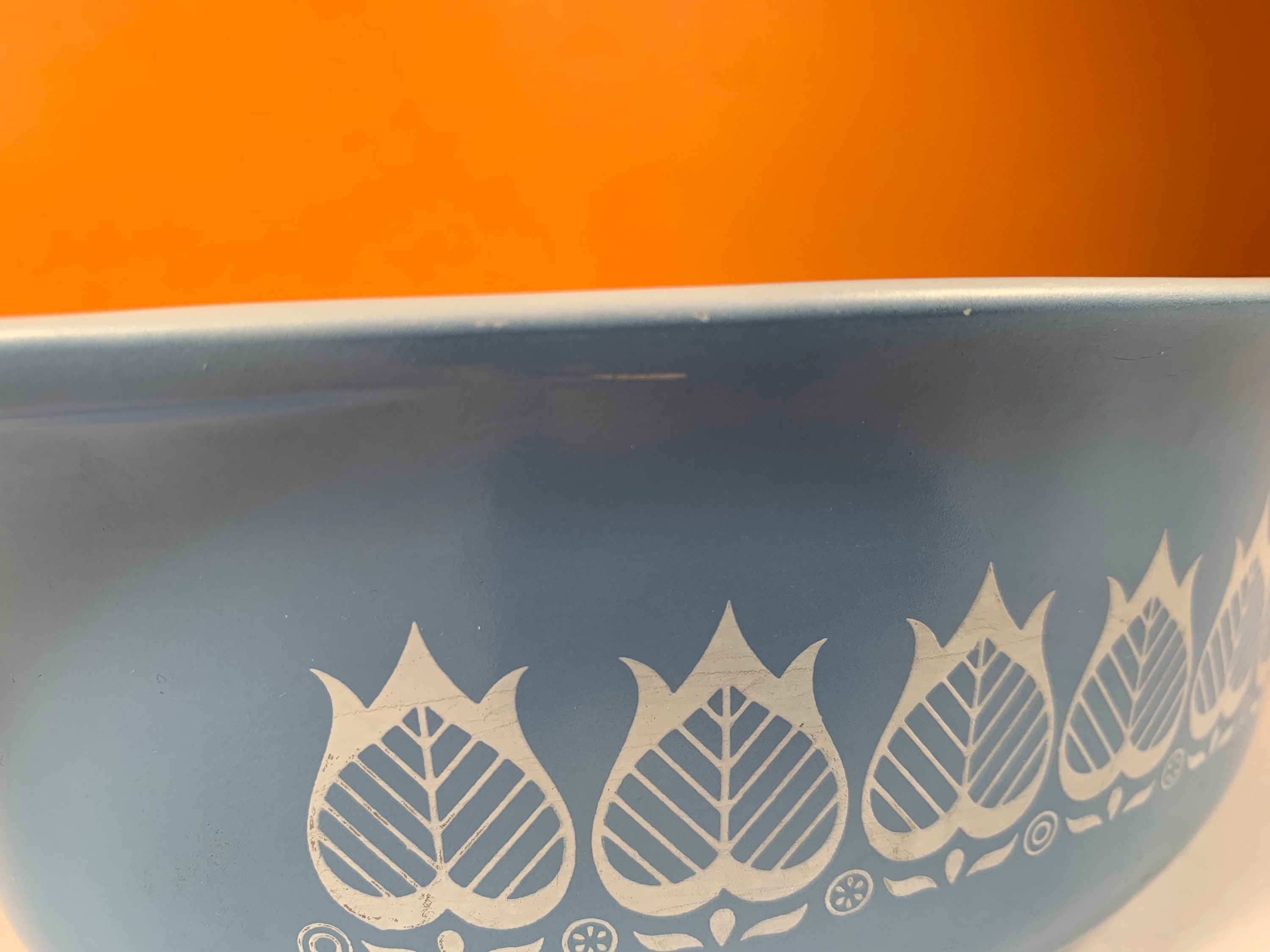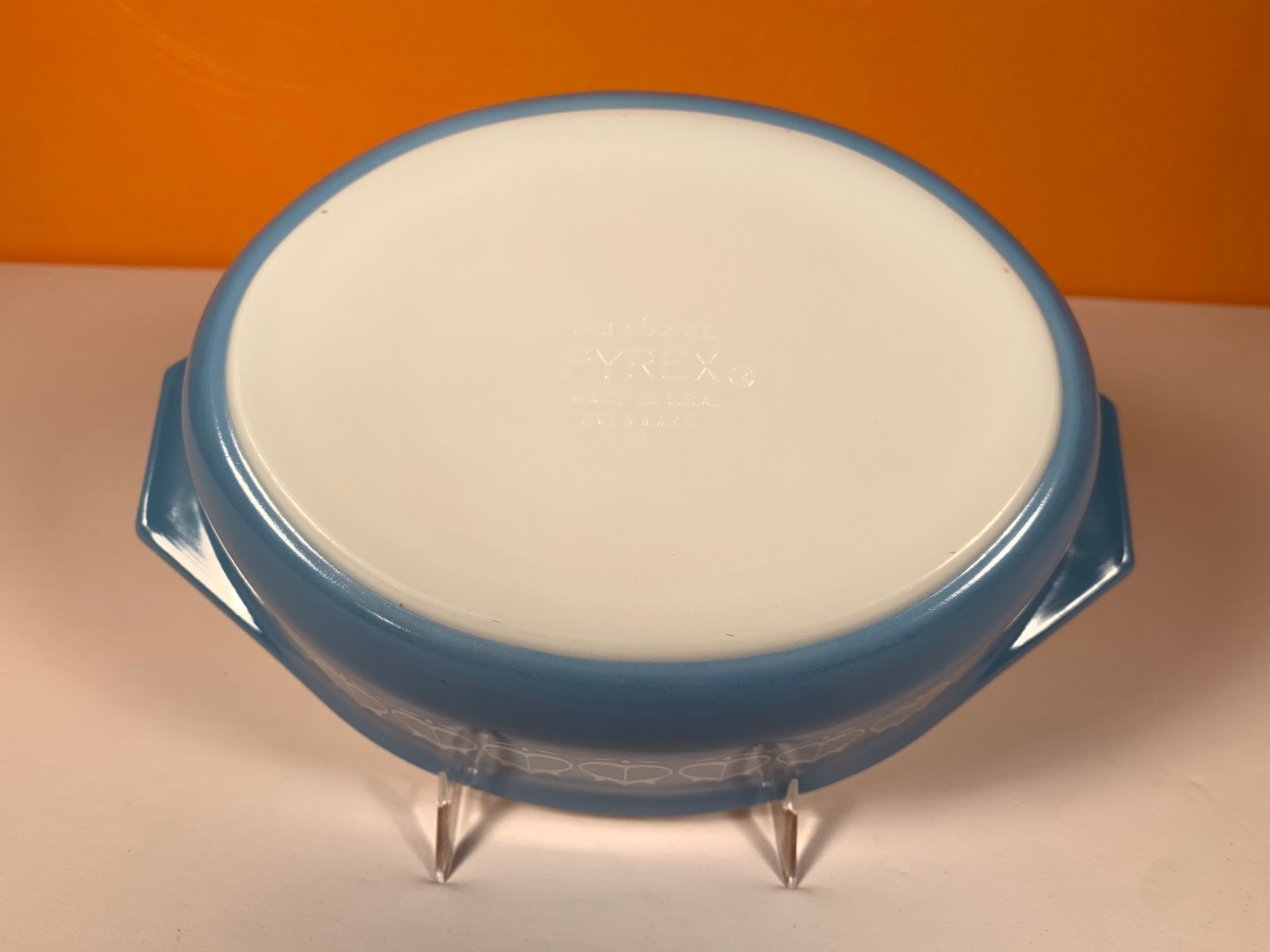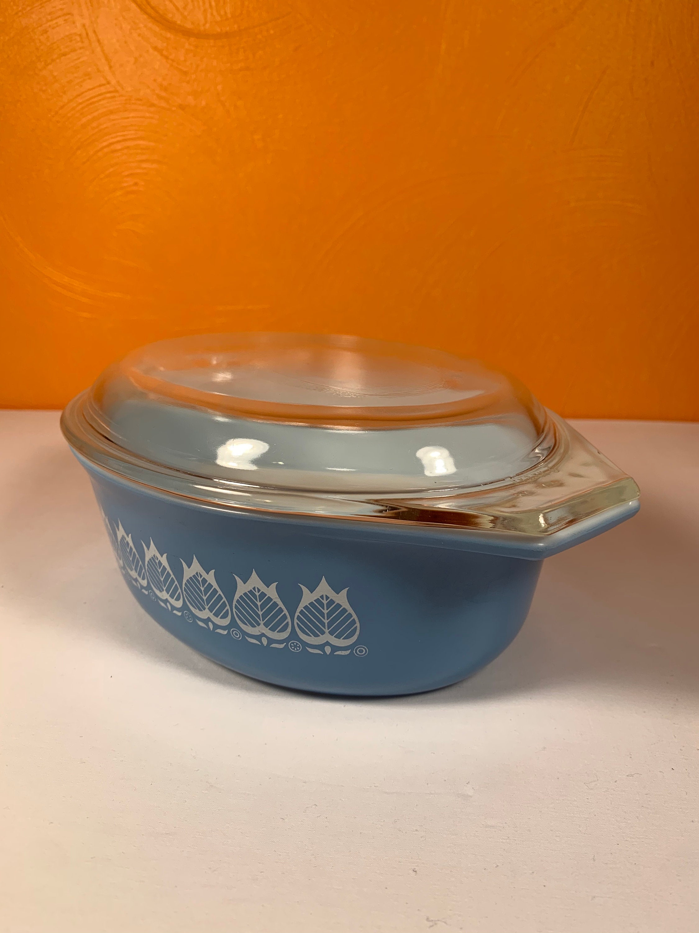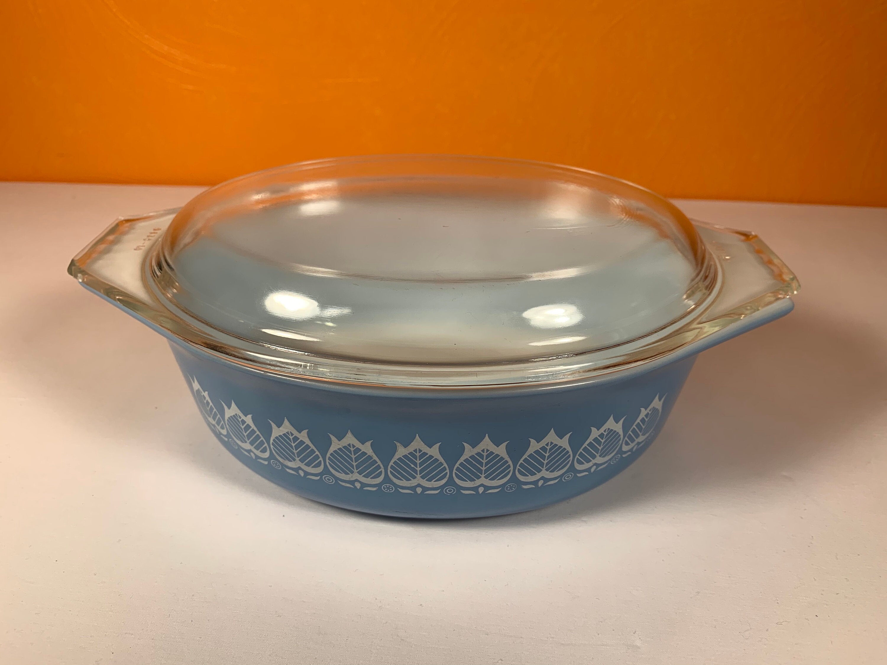 Exact production date unknown, collector books estimate this promotional was made in the very early 1970's. This Blue Tulip Promo Casserole is in good used condition with some light to medium scuffs on the blue on the outside. Please see close up pics for reference and decide for yourself. This piece would still display nicely or be great for everyday or special occasion use.