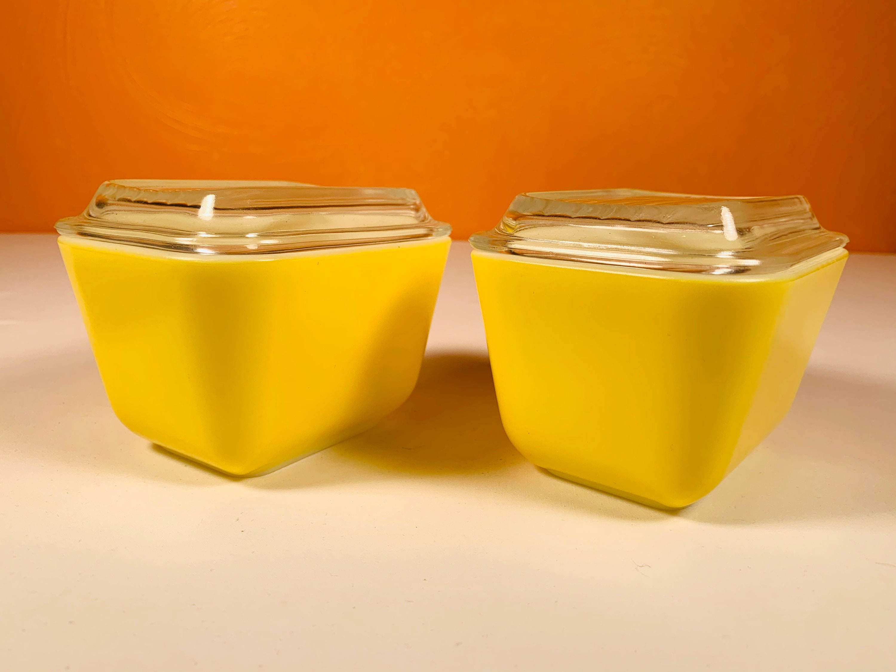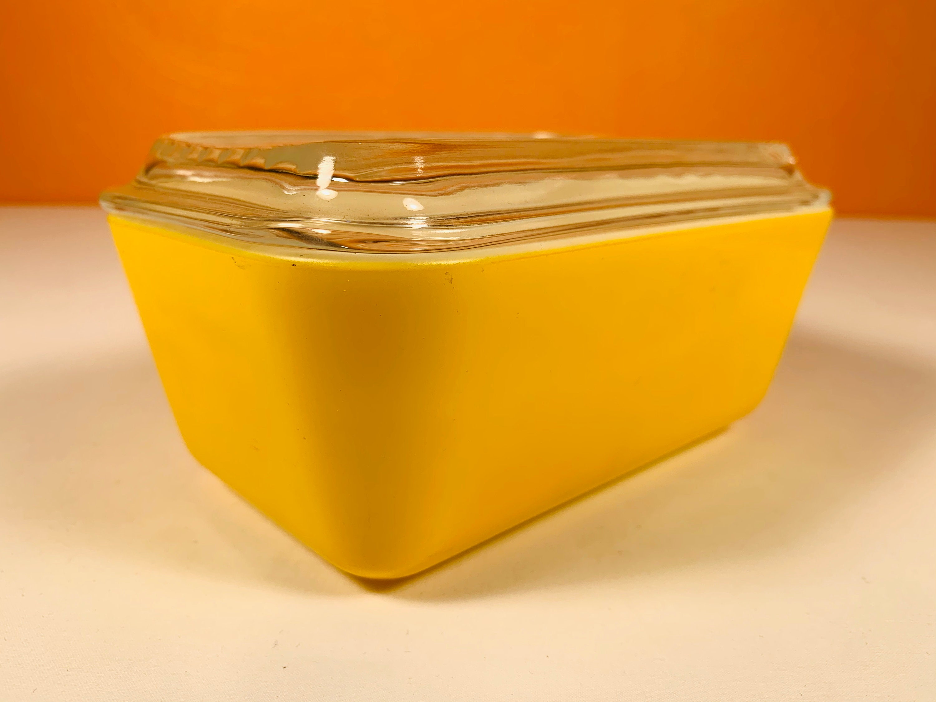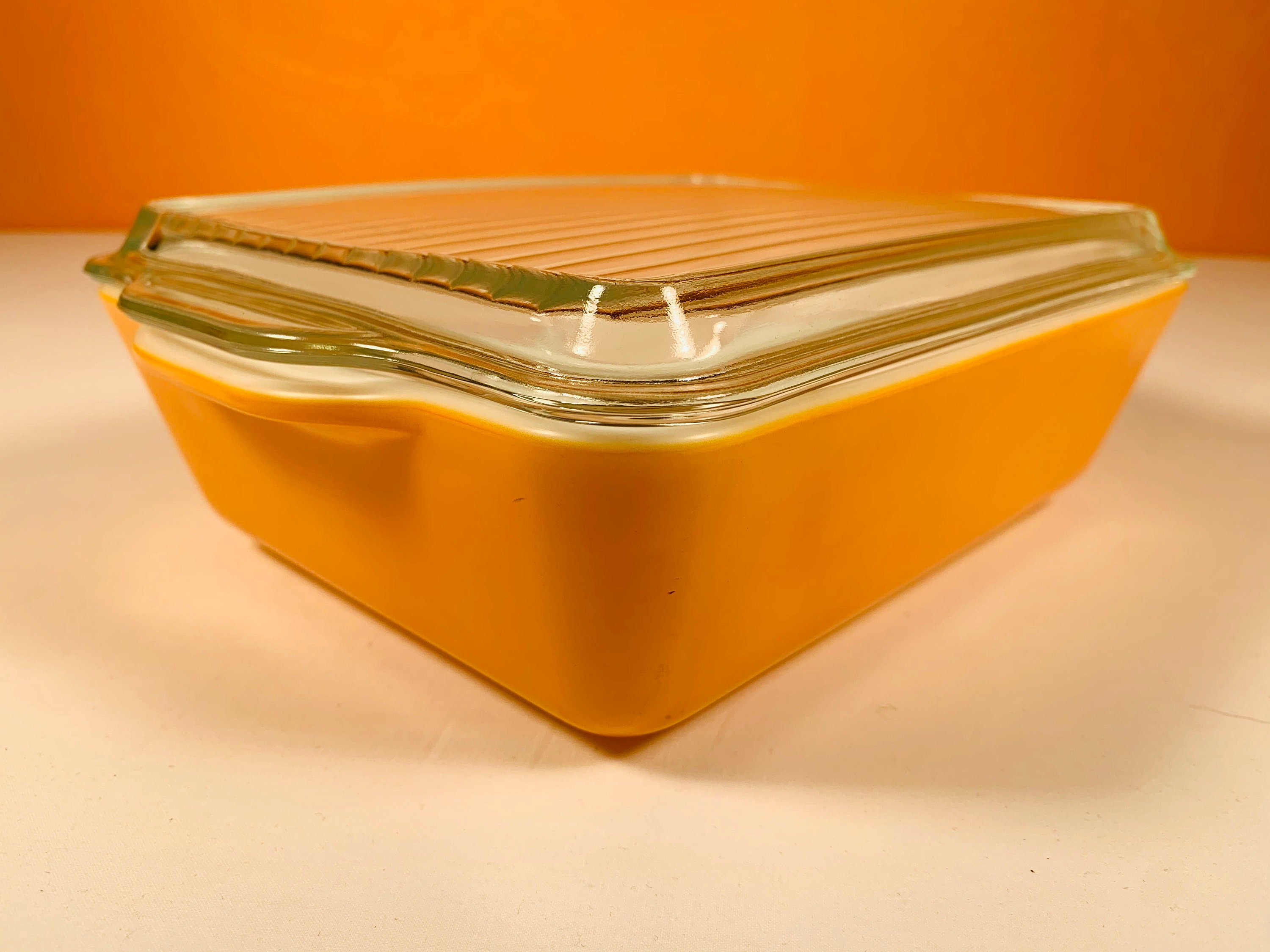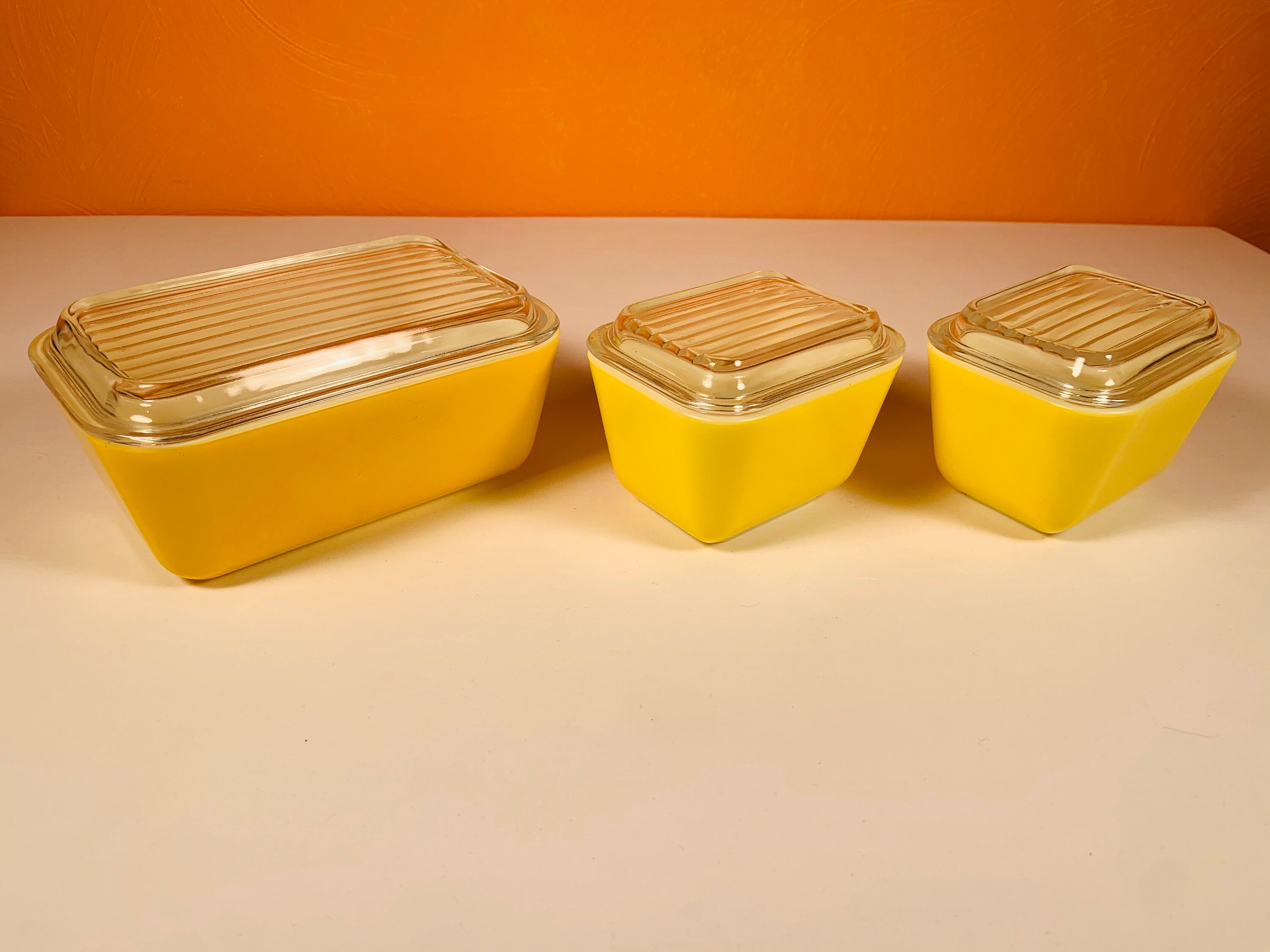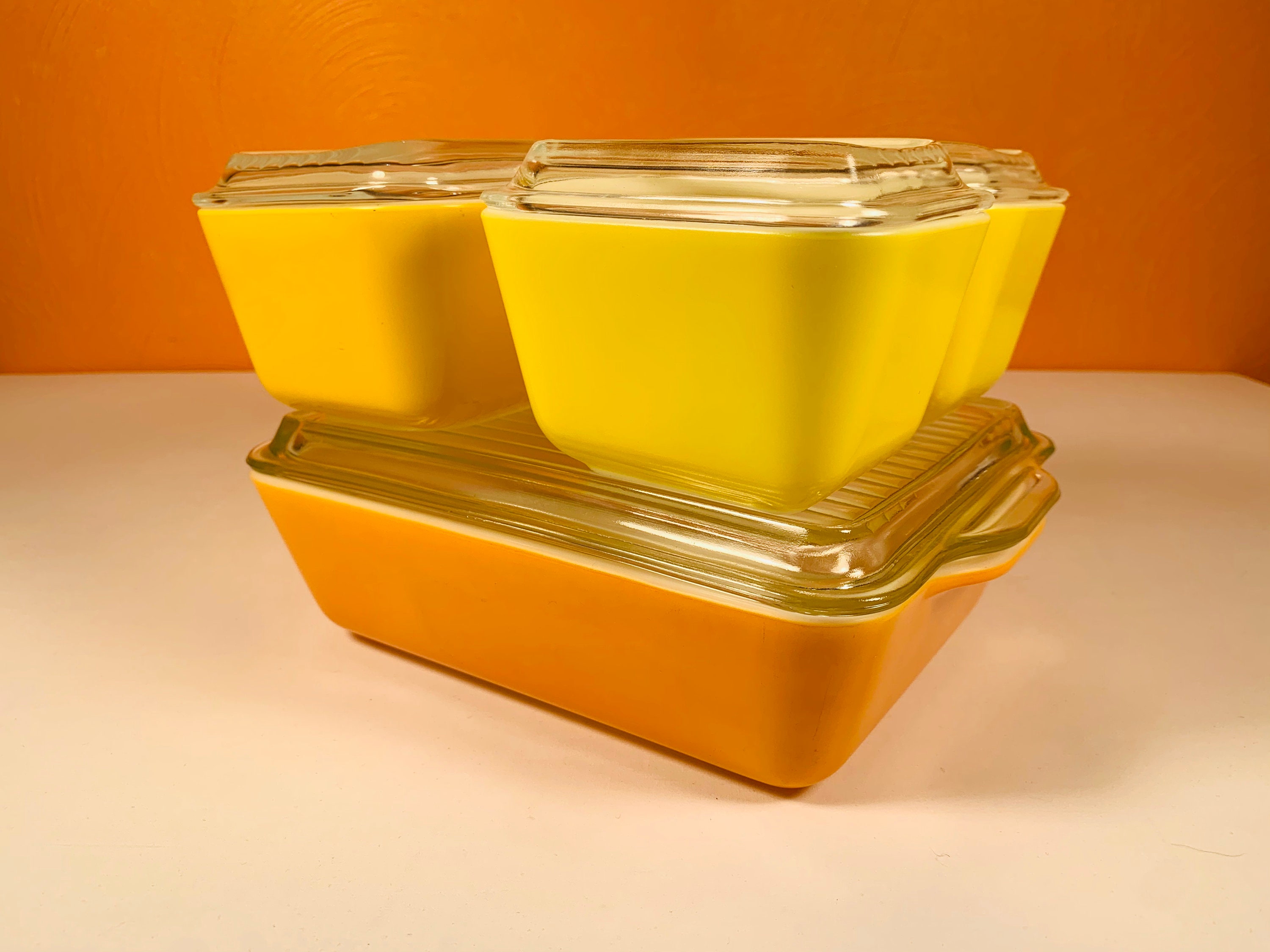 Circa 1968-1973: This complete Daisy refrigerator dish set is in very good condition with no cracks, chips, signs of wear, or dishwasher fading. The color is vibrant and this would display beautifully or be great for special occasion use. Set includes 4 bottom pieces and 4 lids all in great shape. It has become increasingly difficult for us to find a complete set all at one time and in such good condition. This is only the second time in 10 years that we've had the full set in this Daisy pattern.