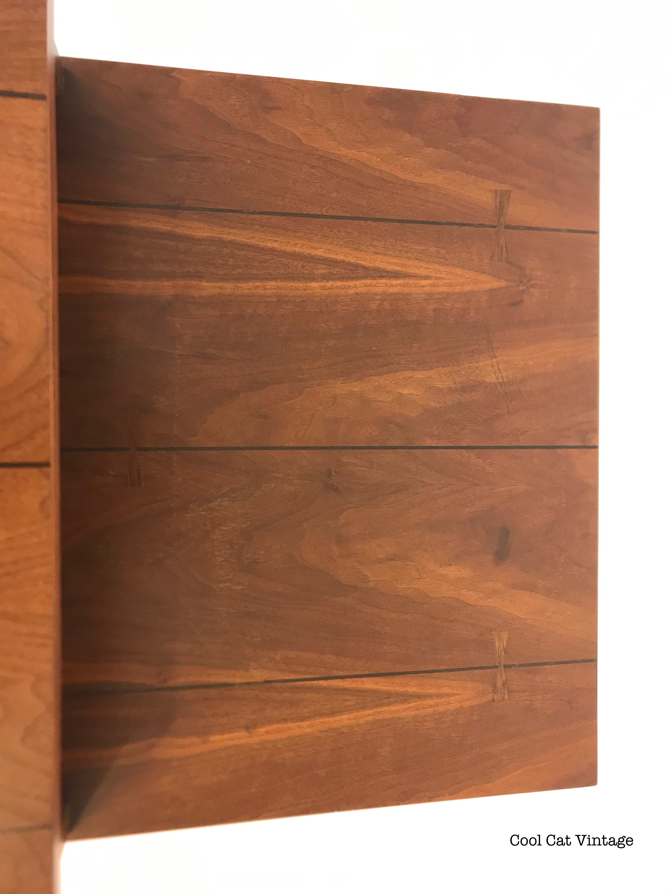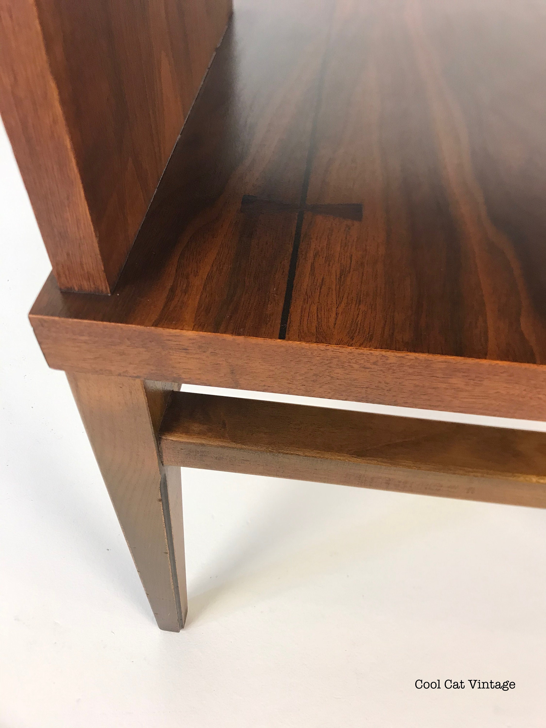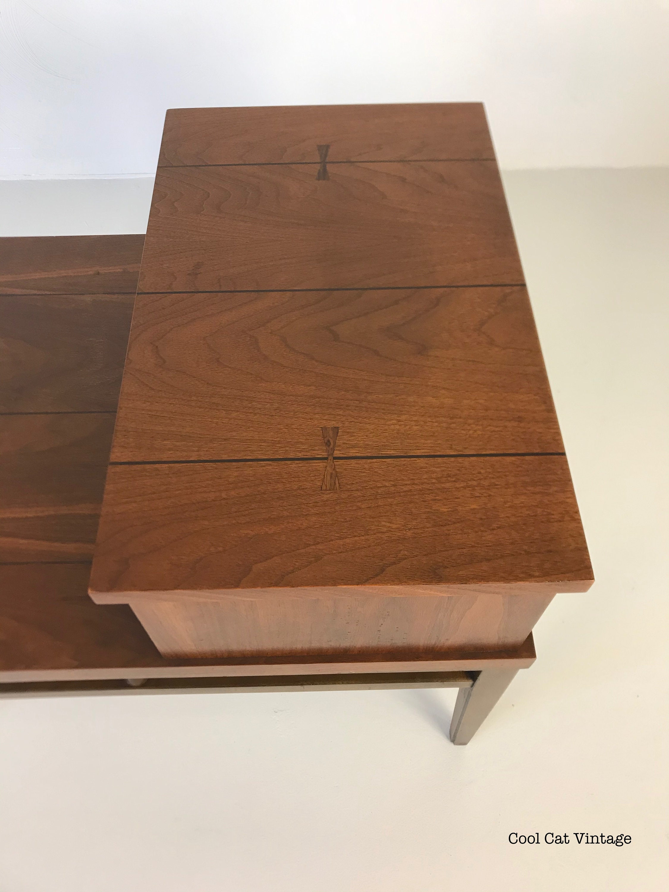 Here is a beautiful walnut two-tiered step end table with a bowtie shaped veneer inlays throughout by Lane Furniture Co. for their Tuxedo line, circa 1960. We did clean up the original finish on this table to bring back its original shine and there is some small wear that can be seen in our last photo but overall this table is in good condition.