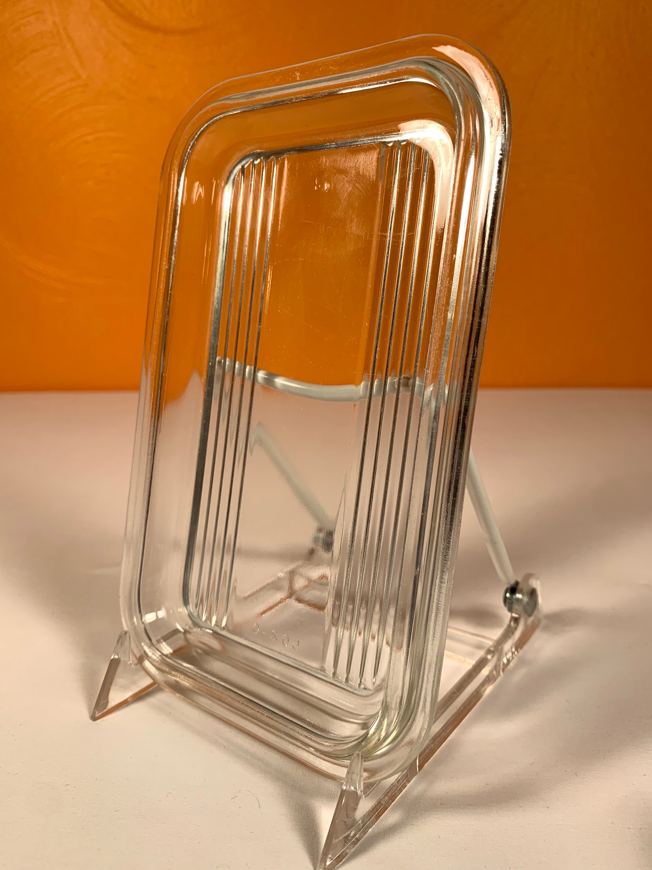 Circa 1959-1968: This Pyrex Butterprint #502 Refrigerator / Baking Dish and Lid is in very good condition with no chips, cracks, or damage. This was the middle size in what was originally sold as a 4 piece refrigerator dish set. This would also serve as a great individual loaf pan or use for baking smaller portion recipes with a 1.5 pint capacity. People love to use this size to make Banana or Zucchini Bread.