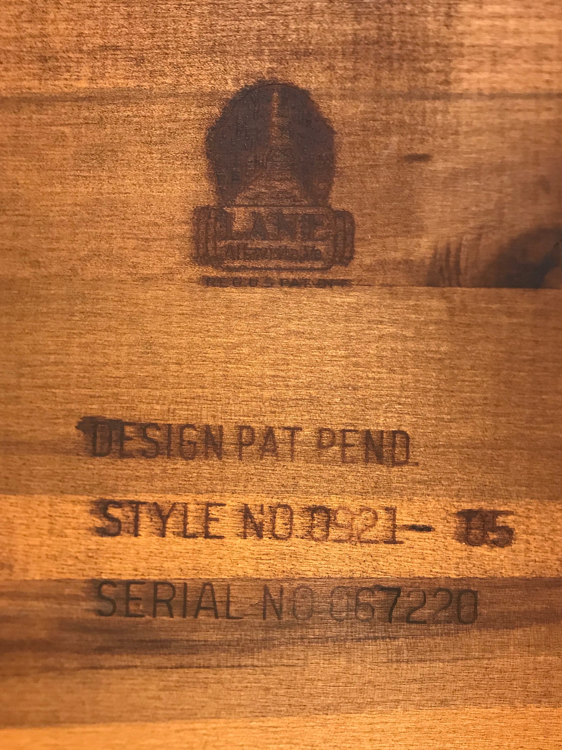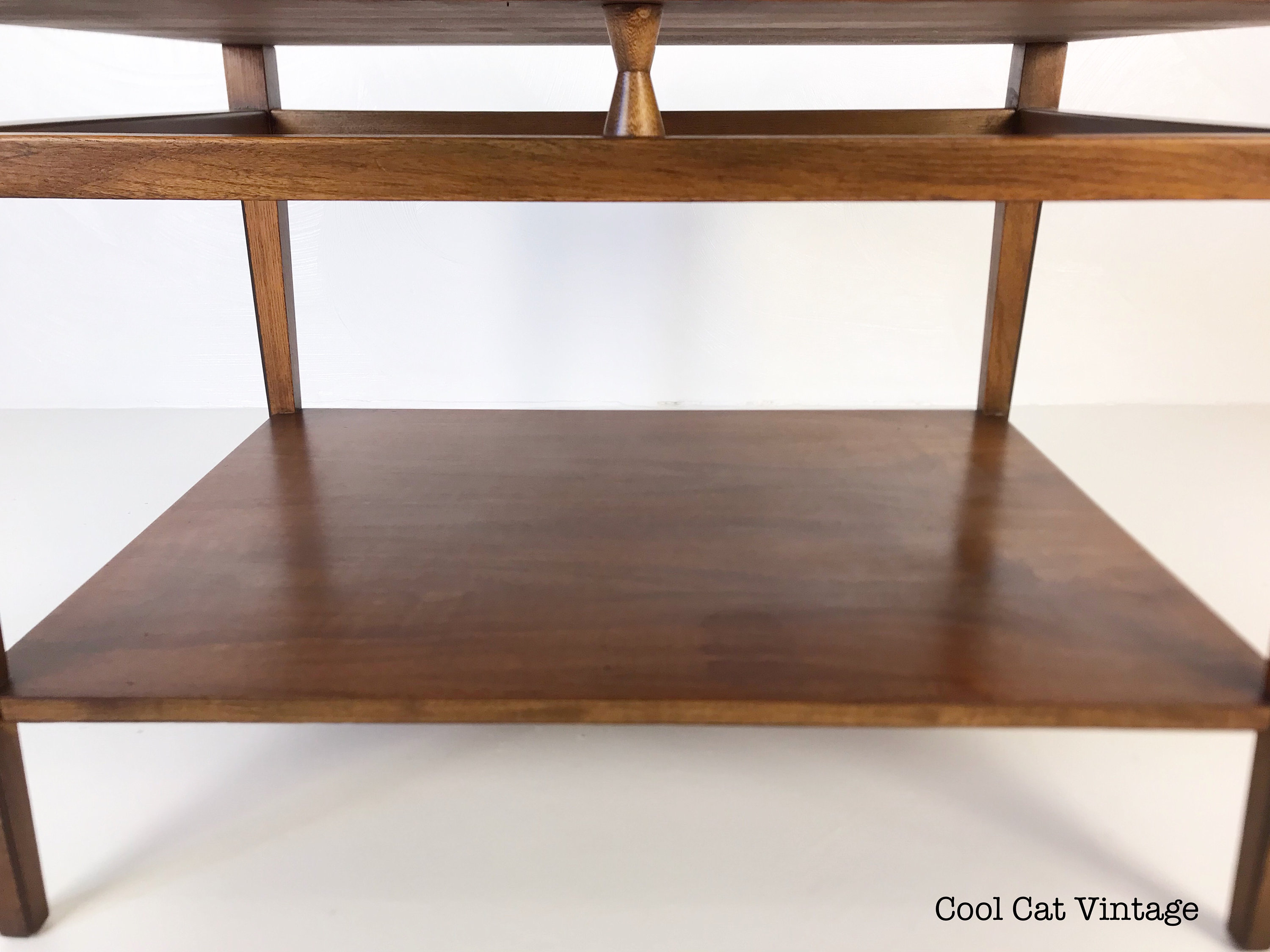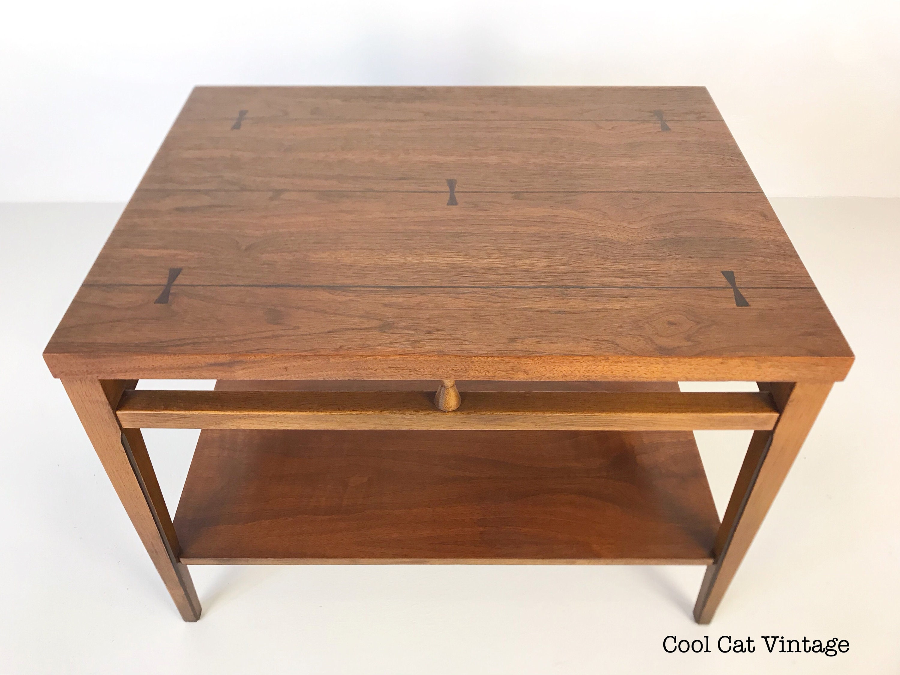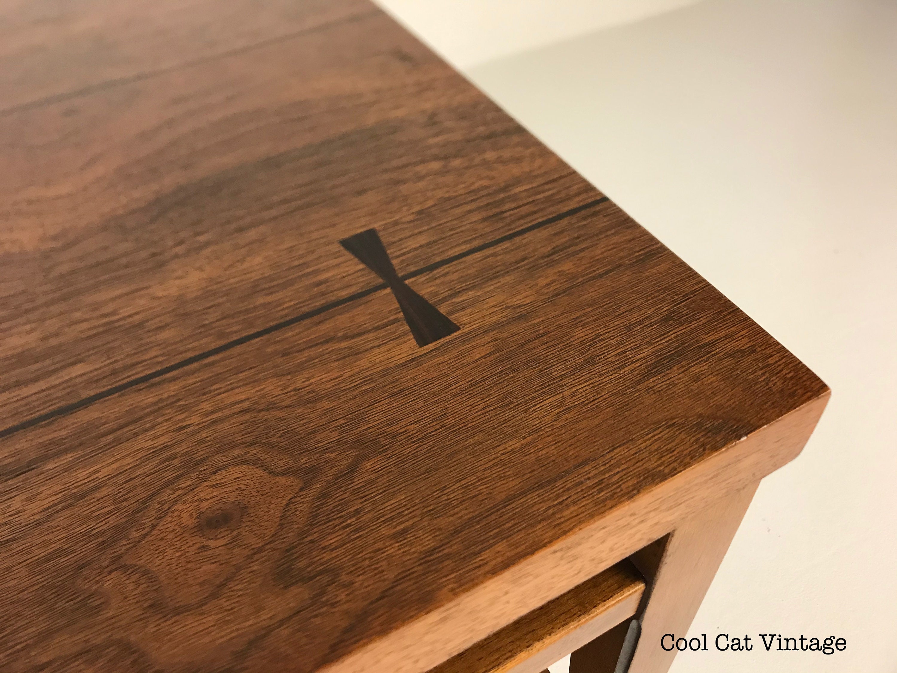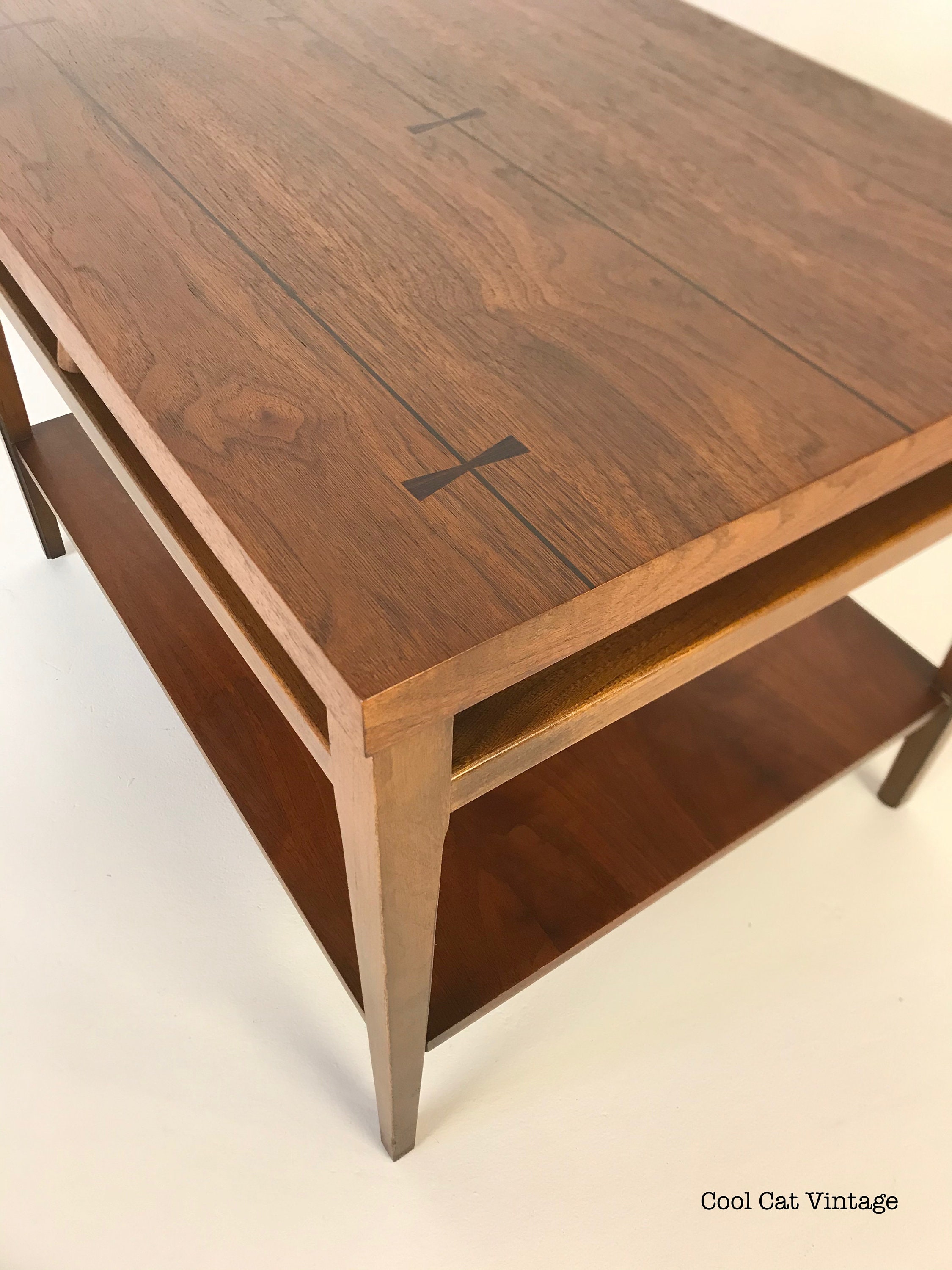 Here is a beautiful walnut rectangular two-level end table with bowtie shaped veneer inlays throughout by Lane Furniture Co. for their Tuxedo line, circa 1960. We did give both levels of this table a full restoration to bring back its original look. Overall this table is in good restored condition.