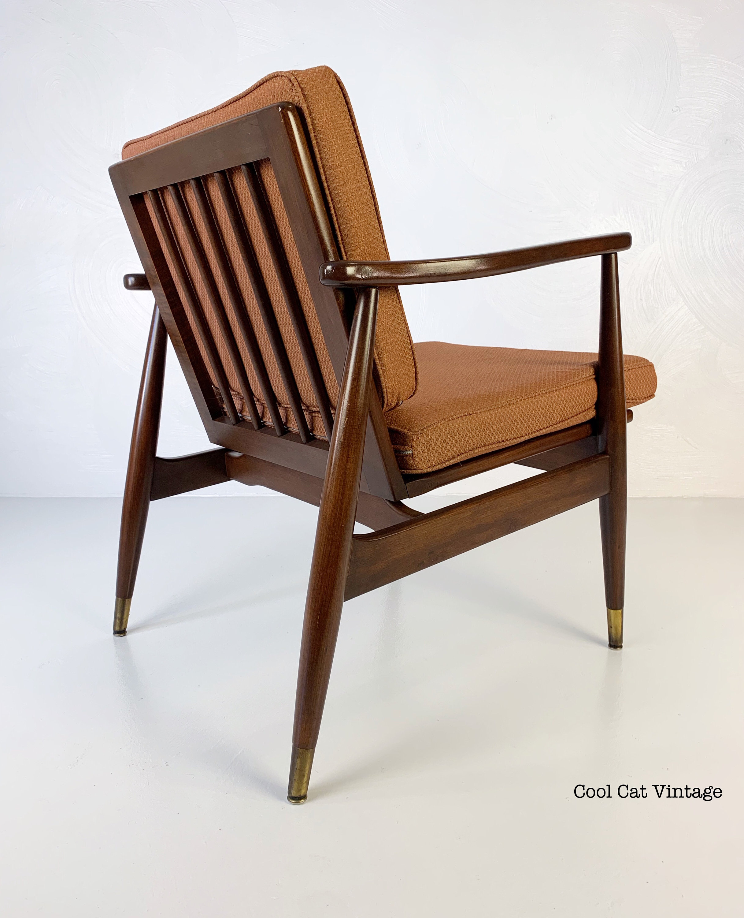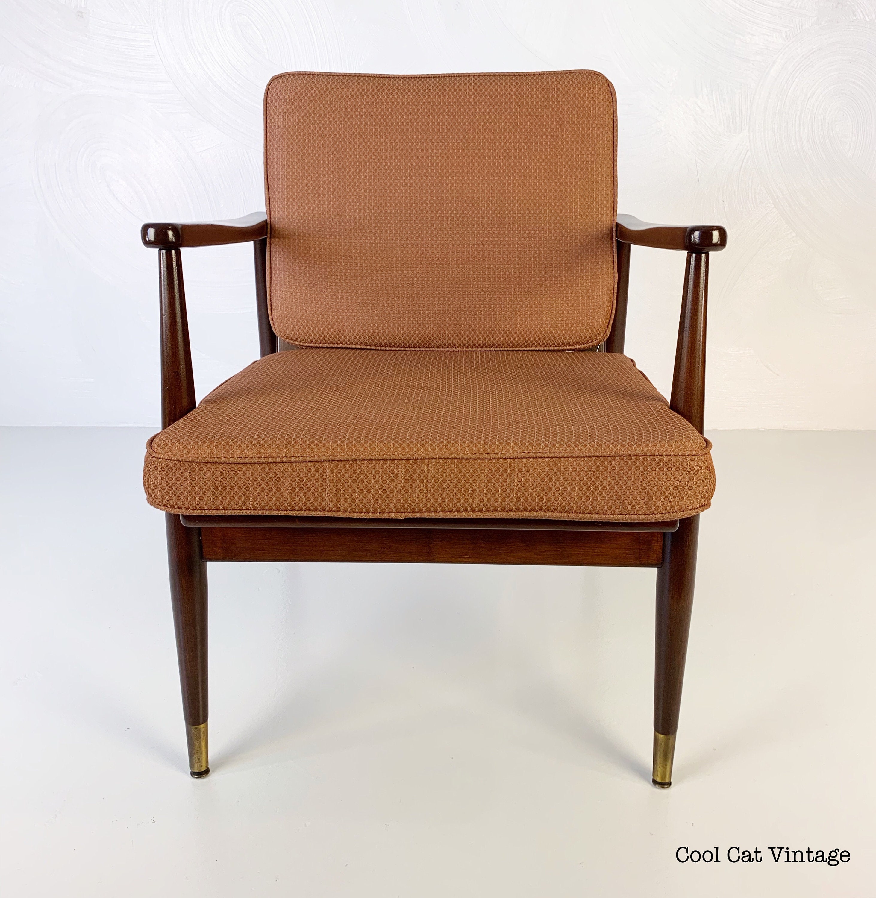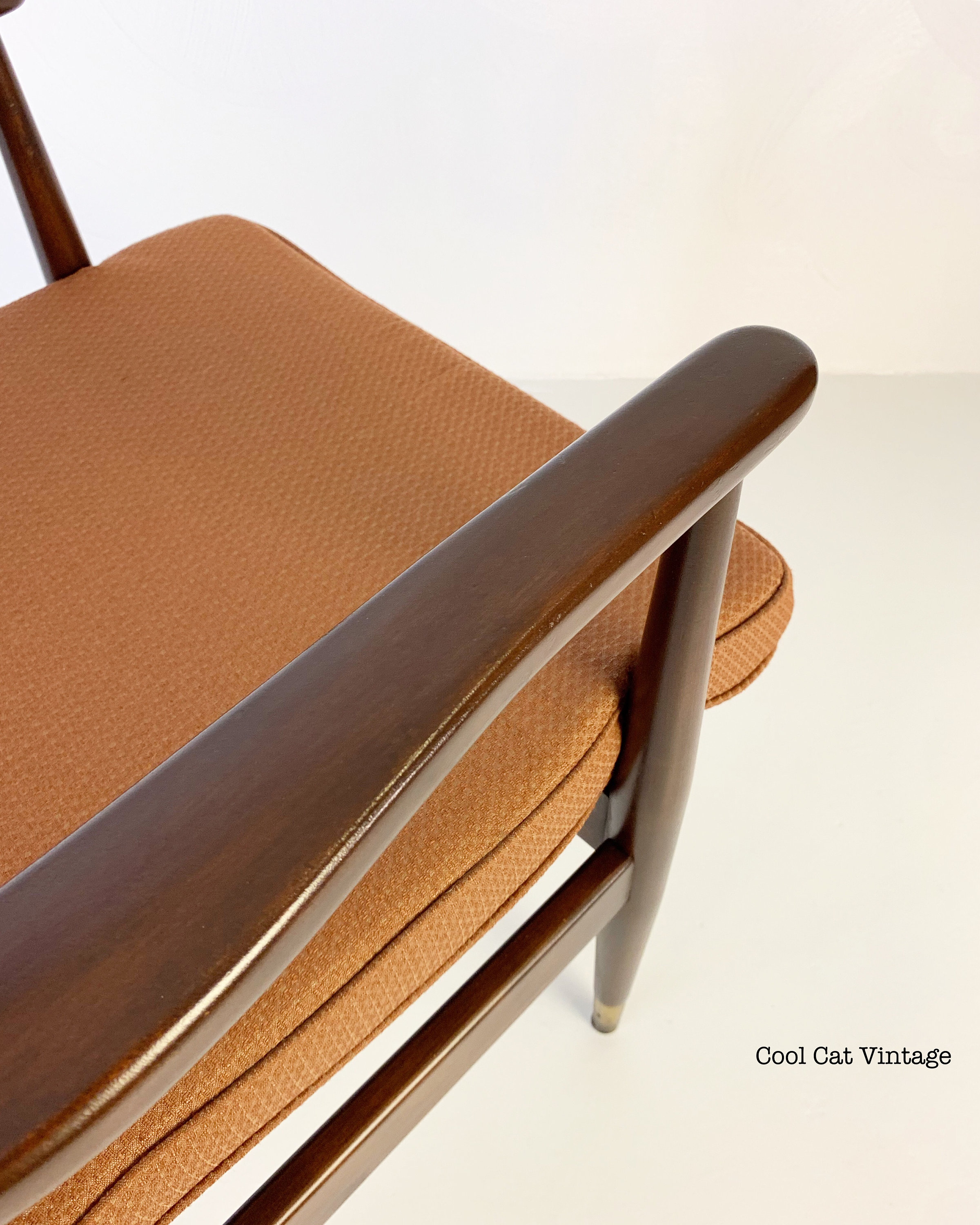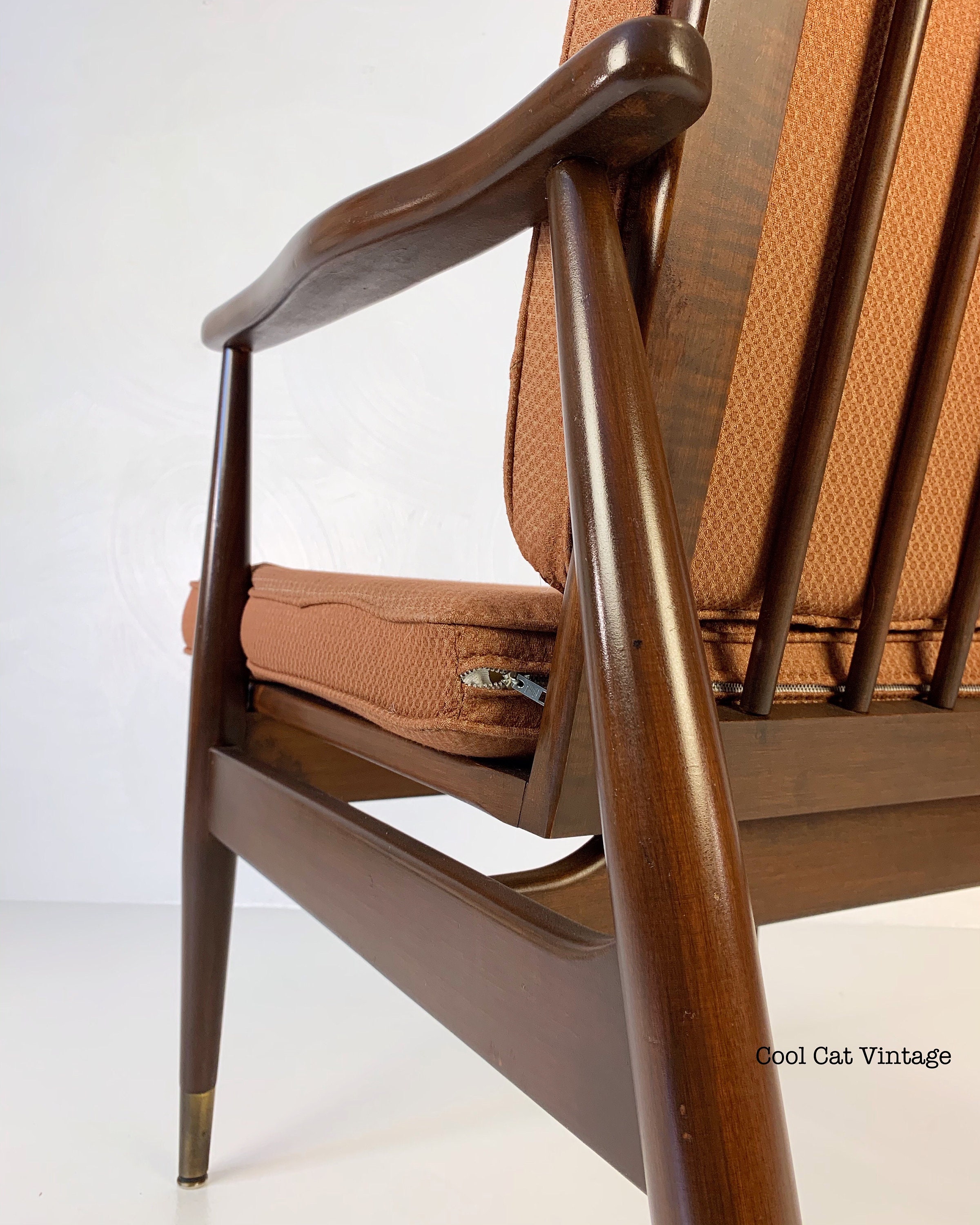 Here is a beautifully restored solid walnut armchair manufactured by Thonet Industries INC. of NYC, circa 1960s. This armchair sits at 18" high, which is a few inches higher than most armchairs and it is very comfortable. The cushions were replaced by the original owner over the years, they are not the most exciting in color but are without any major flaws to point out. The new owner may opt for new cushions to match their home decor so we decided to leave them as-is on this piece. We did go over this chair in detail and restored the frame to keep its original look. The brass caps on each leg do show some patina as expected from age. Overall this chair is in good restored condition and retains the original manufacturers label underneath.