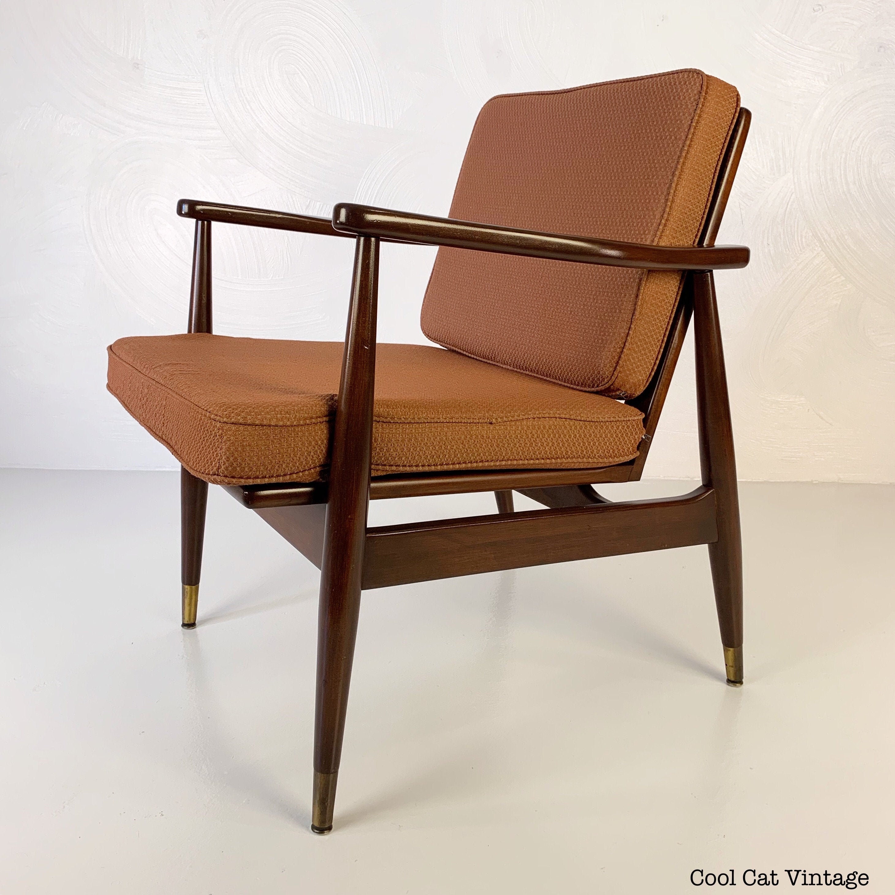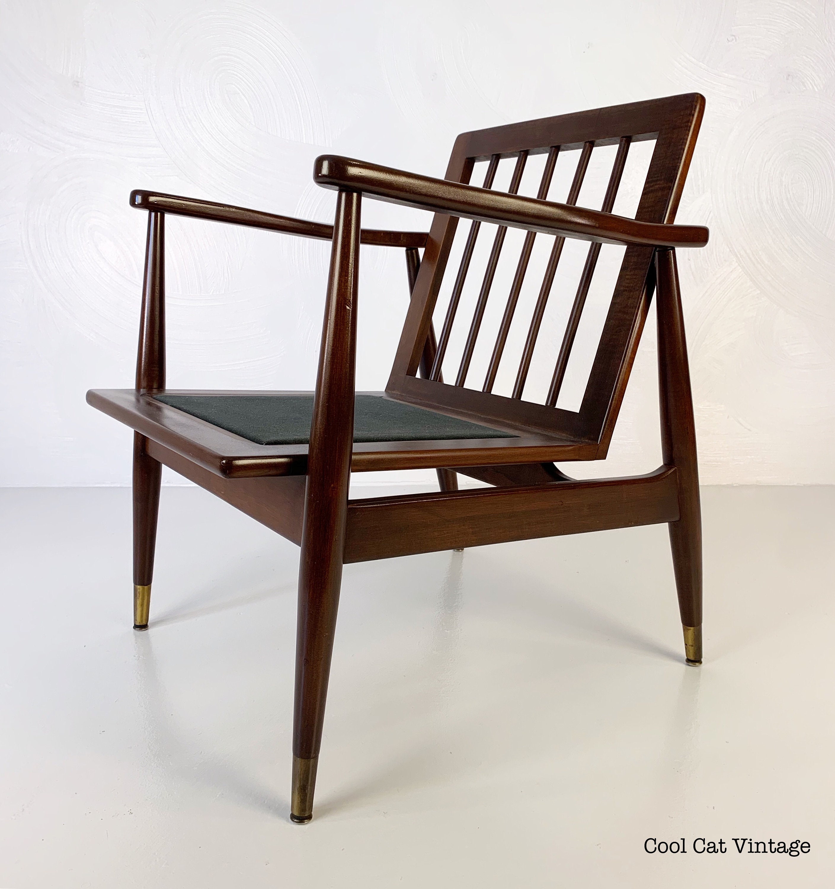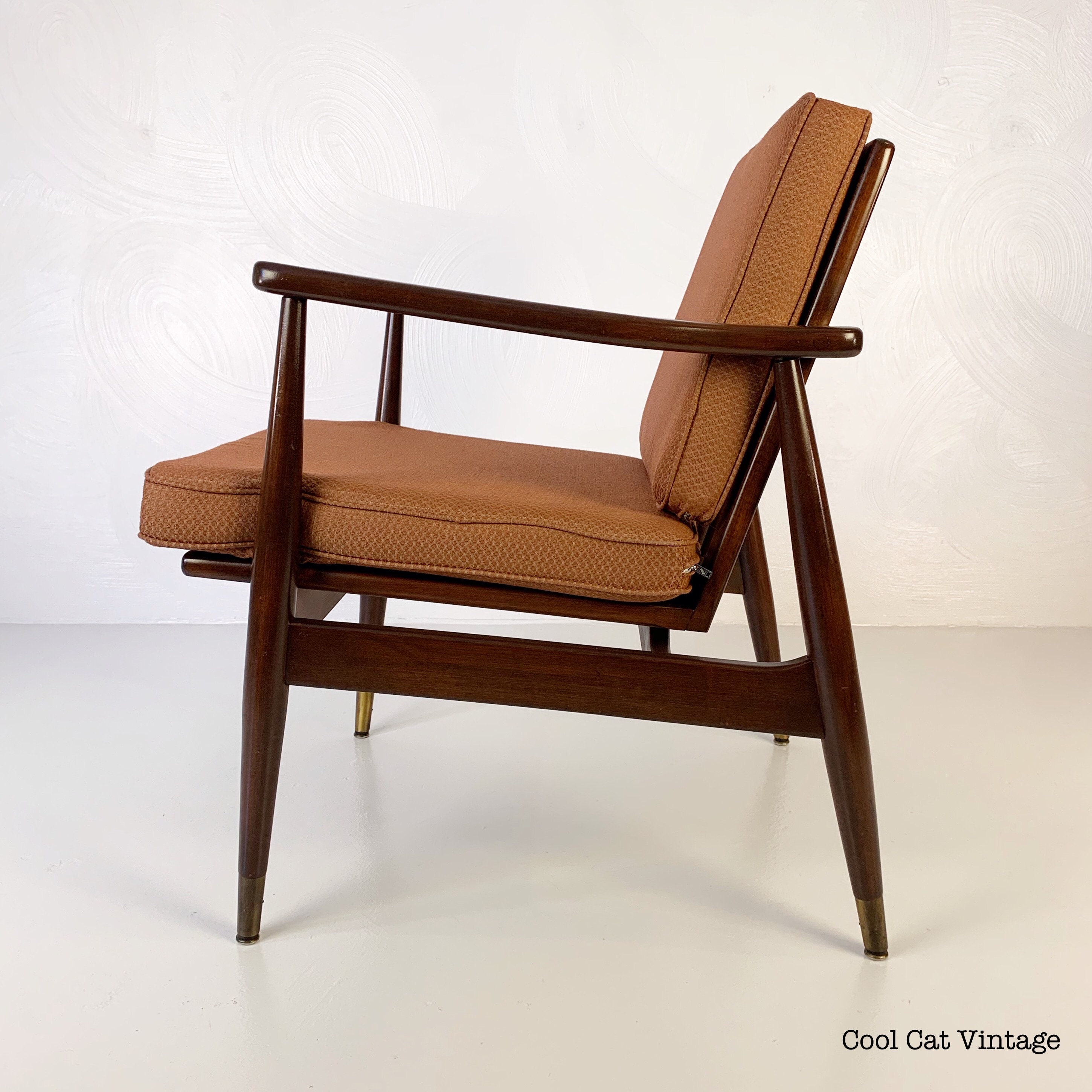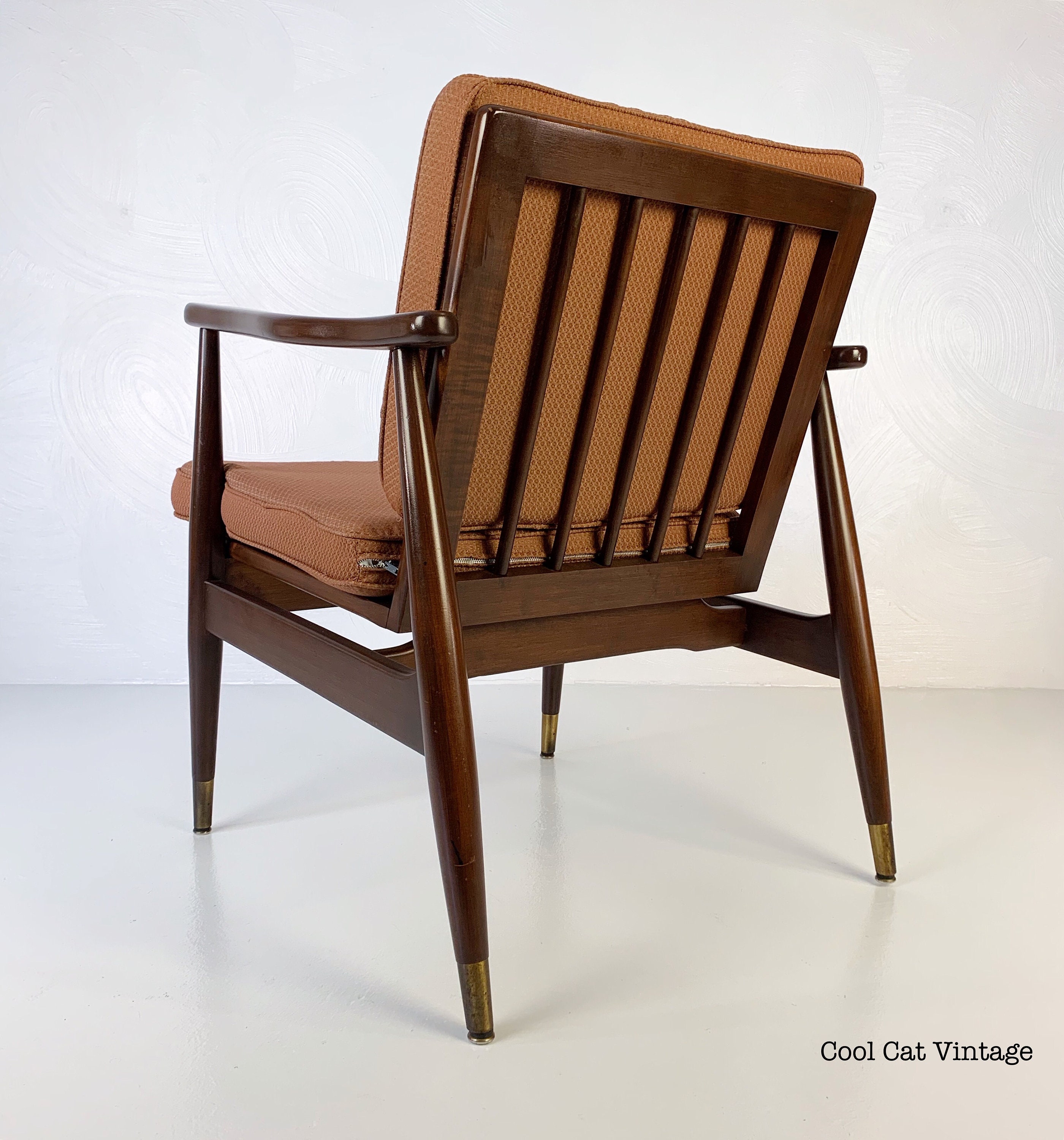 Here is a beautifully restored solid walnut armchair manufactured by Thonet Industries INC. of NYC, circa 1960s. This armchair sits at 18" high, which is a few inches higher than most armchairs and it is very comfortable. The cushions were replaced by the original owner over the years, they are not the most exciting in color but are without any major flaws to point out. The new owner may opt for new cushions to match their home decor so we decided to leave them as-is on this piece. We did go over this chair in detail and restored the frame to keep its original look. The brass caps on each leg do show some patina as expected from age. Overall this chair is in good restored condition and retains the original manufacturers label underneath.