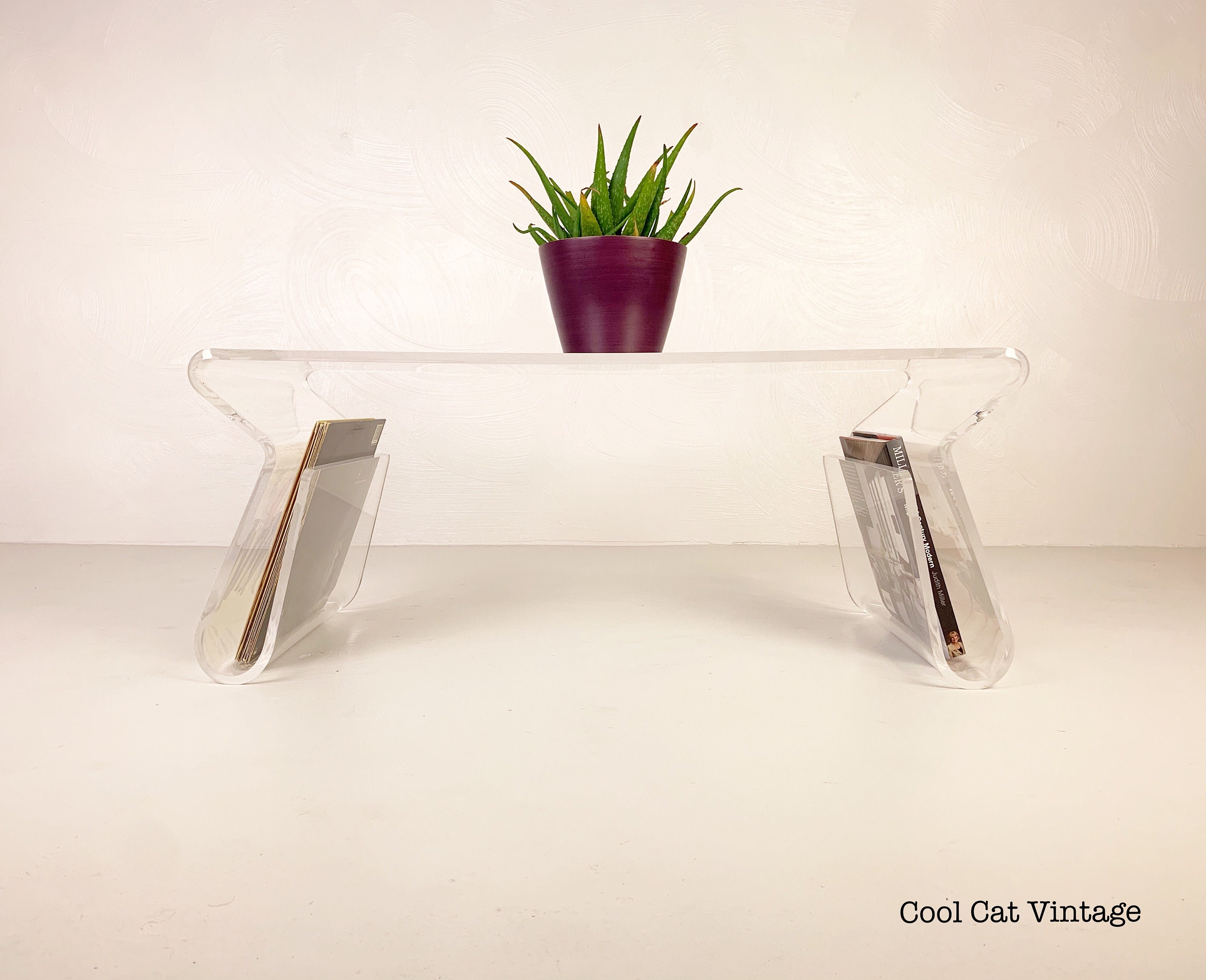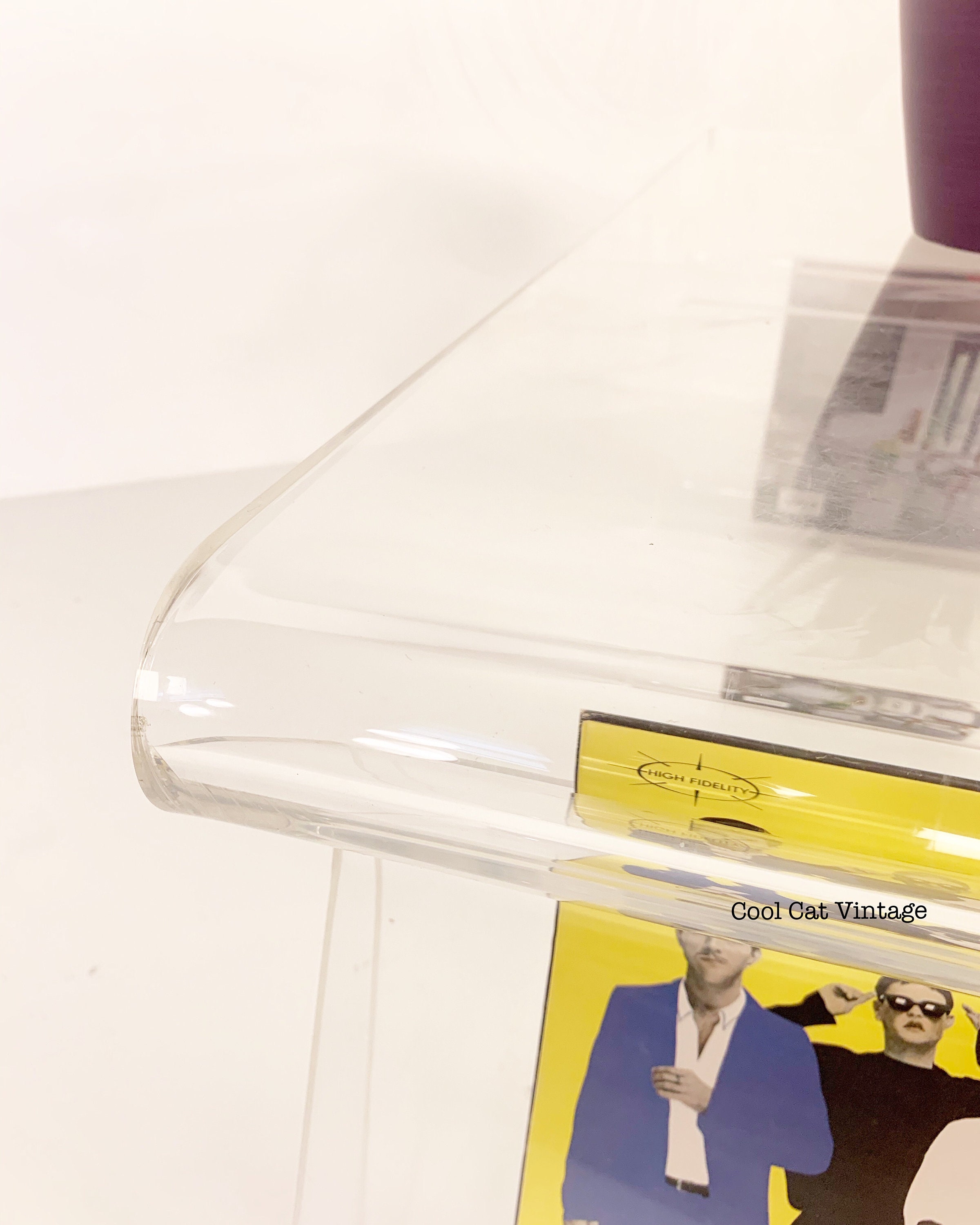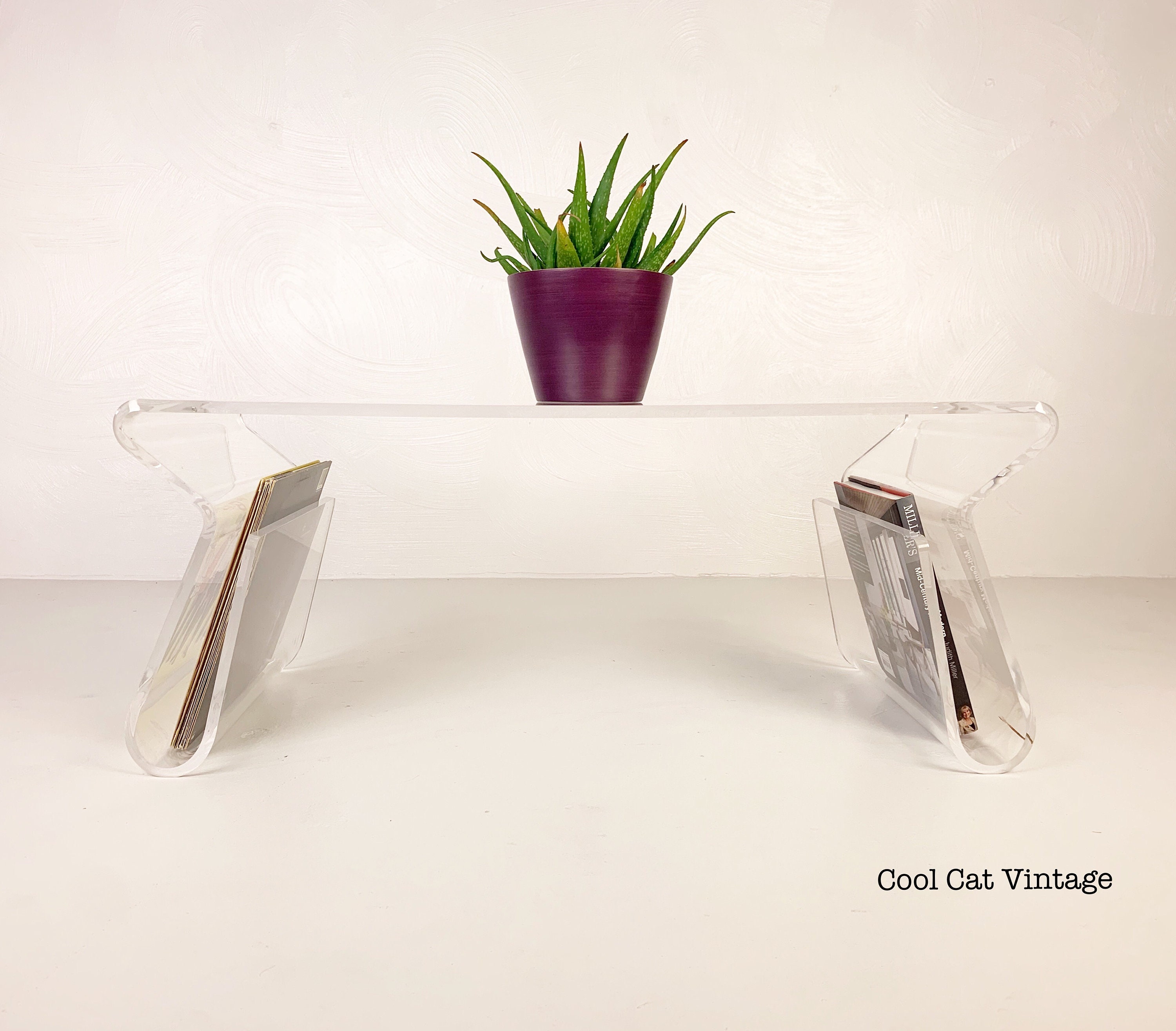 Here is a very nice modern curved design acrylic coffee table with storage. This table is the perfect size for any living room and as you can see from our photos it also offers storage for your favorite books, magazines, or records. This piece does show some very minimal scuffs from use but overall it is in great vintage condition.