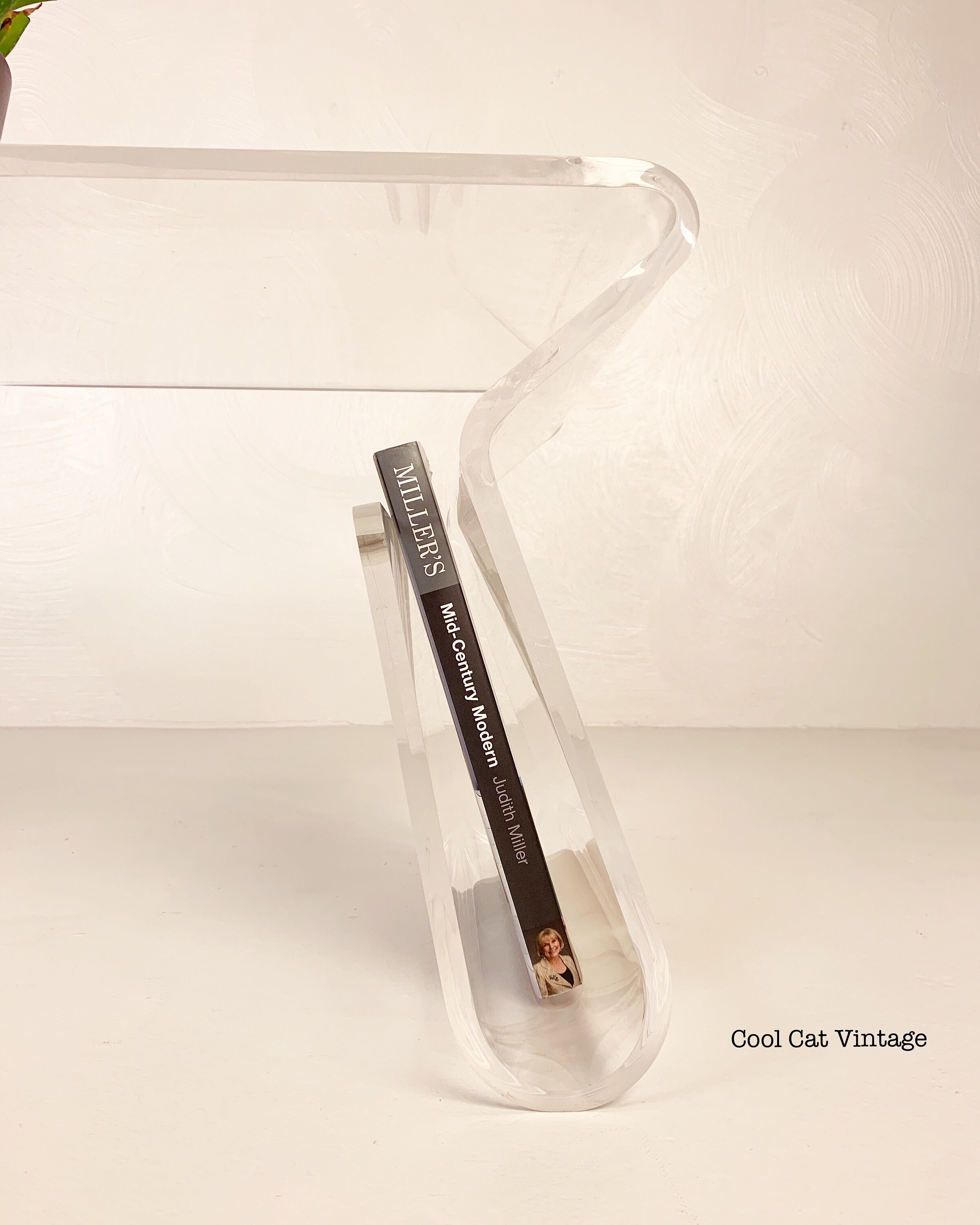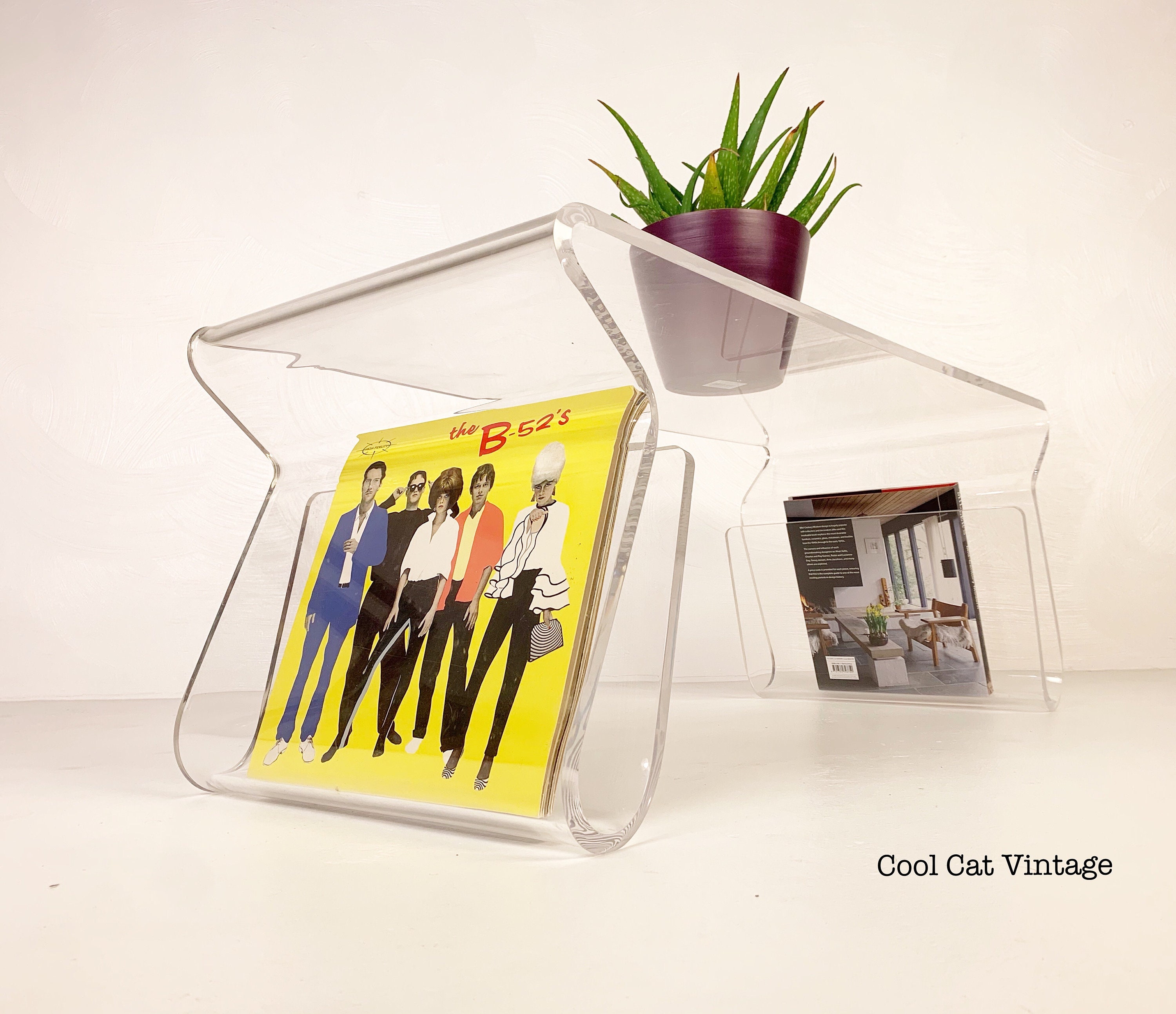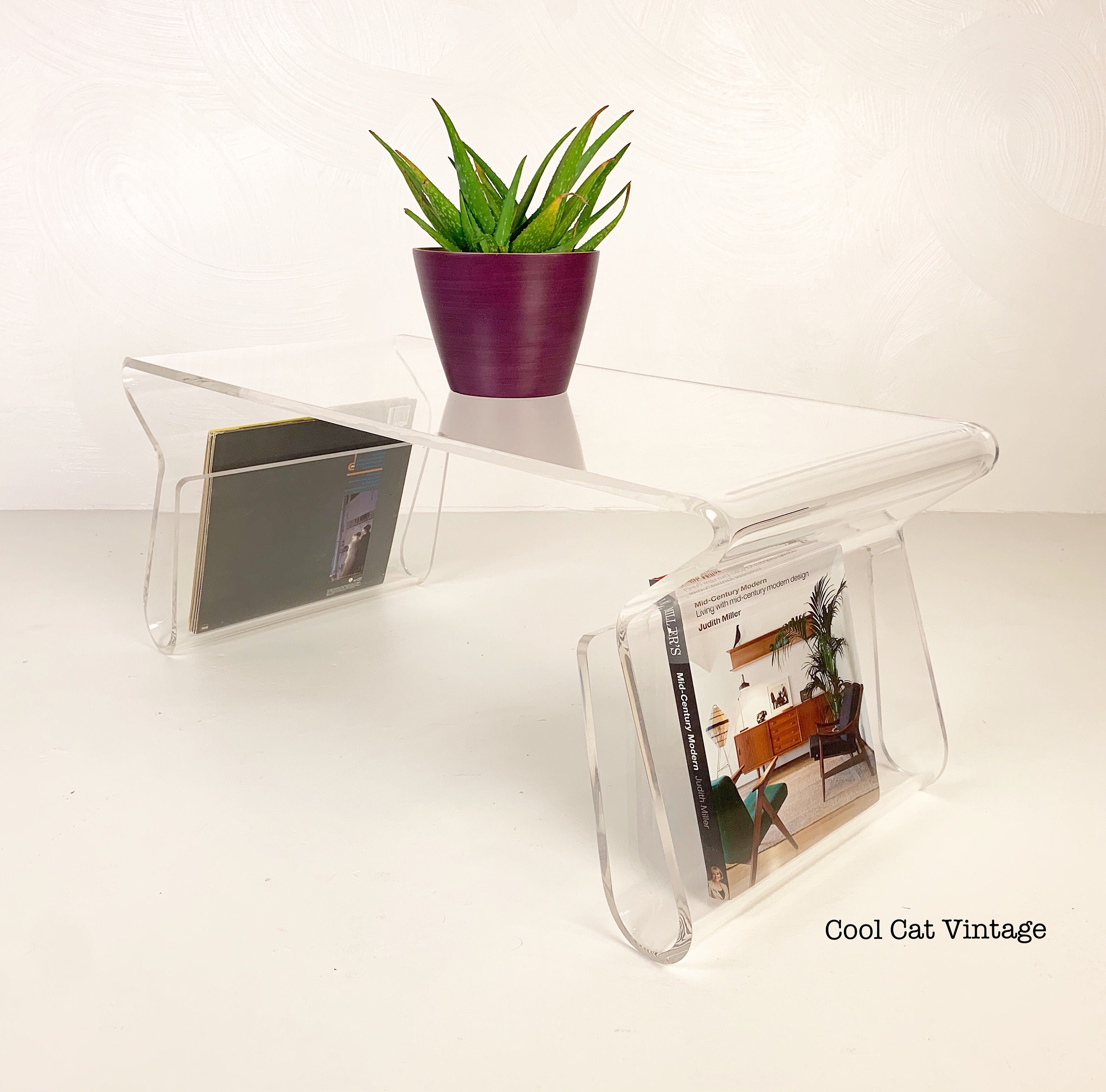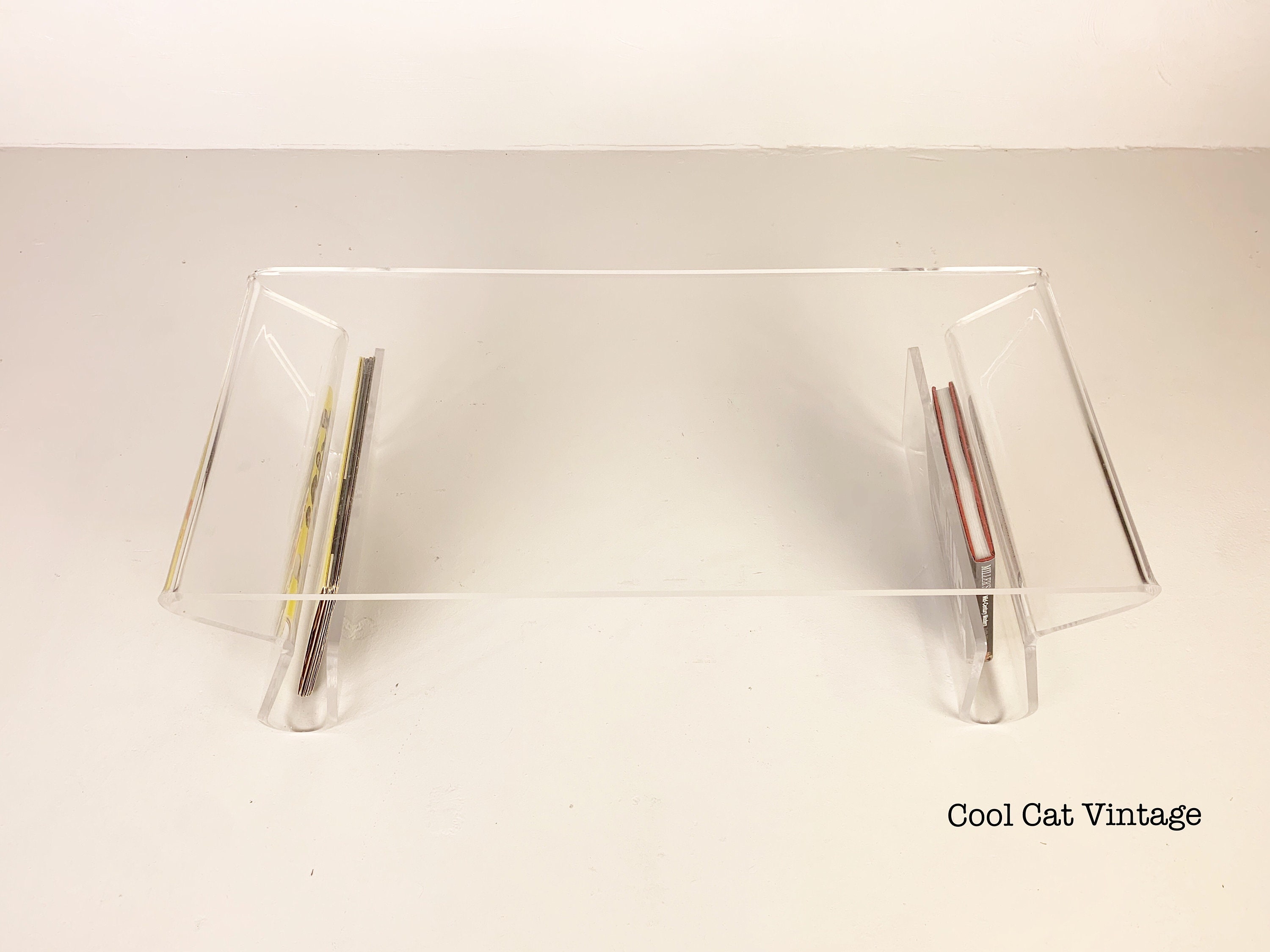 Here is a very nice modern curved design acrylic coffee table with storage. This table is the perfect size for any living room and as you can see from our photos it also offers storage for your favorite books, magazines, or records. This piece does show some very minimal scuffs from use but overall it is in great vintage condition.