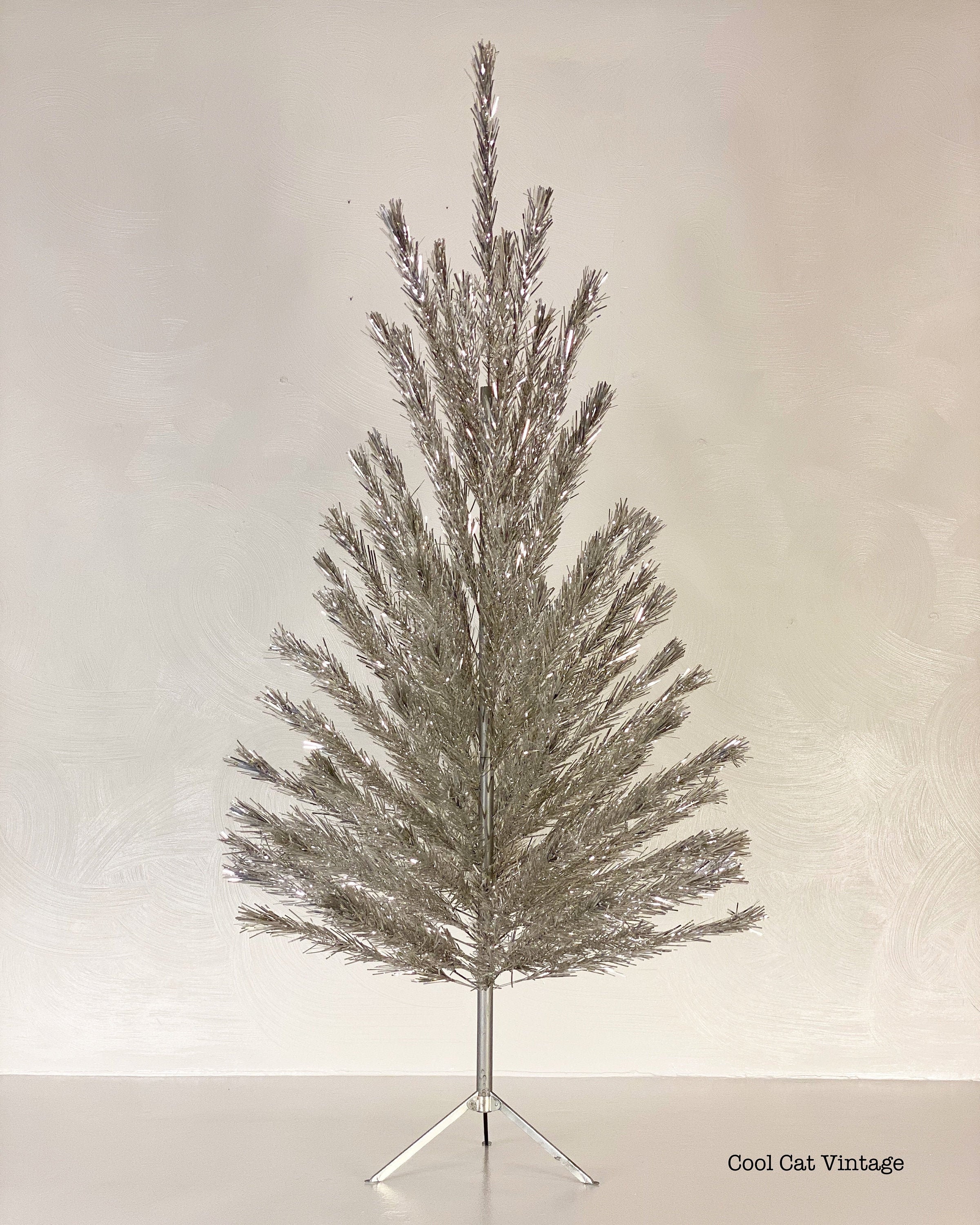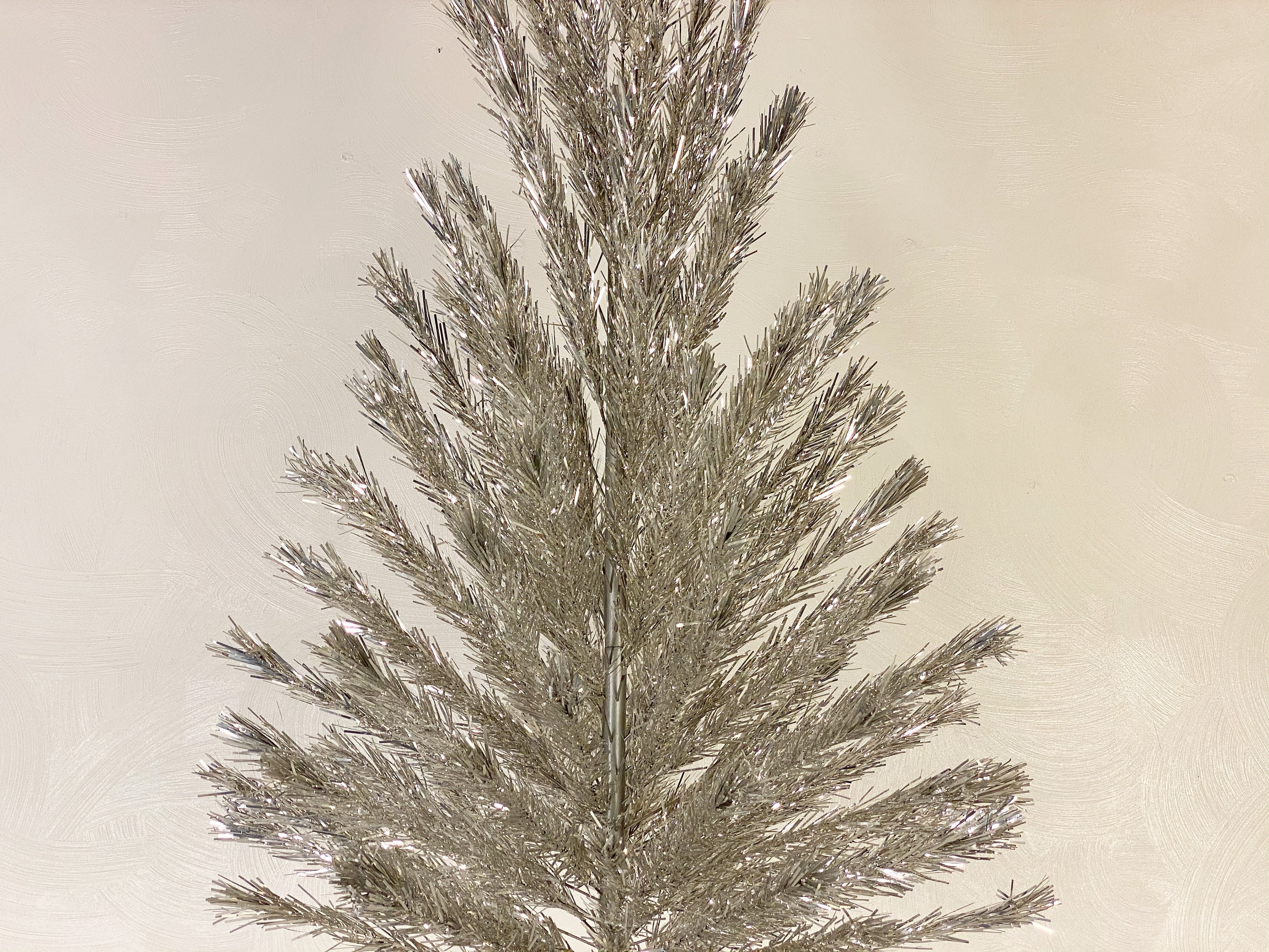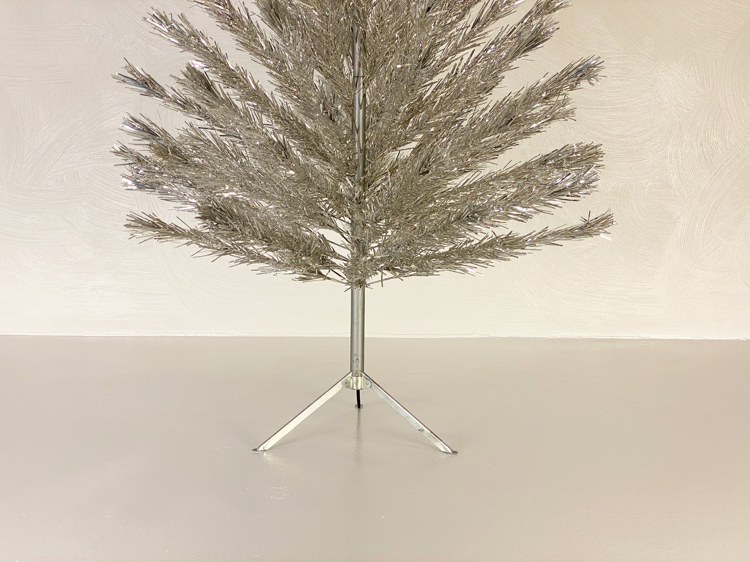 Here is a very nicely preserved aluminum Christmas Tree by United States Silver Tree Company, Scranton, Pa, circa 1950s. This tree has all its 100 branches and all branches are in good condition for their age. This tree was assembled in-house by us and thoroughly inspected for defects. The tree stand is present and it holds up well for its age. Although the tree sits in place well the tree pole does move slightly, we decided to leave this as is and let the new owner add something to strengthen this should they wish to do so. All branches are intact and were stored in their original paper sleeves so they keep their shape well when removed. This tree does not come with its original box and overall this tree is in good original condition.