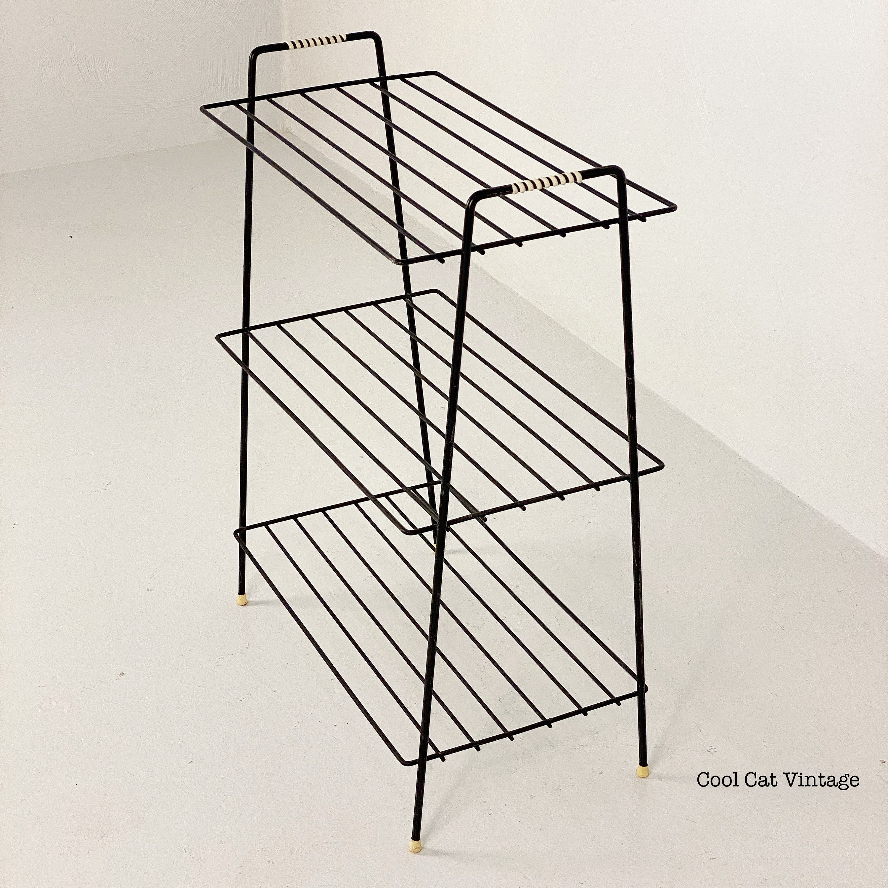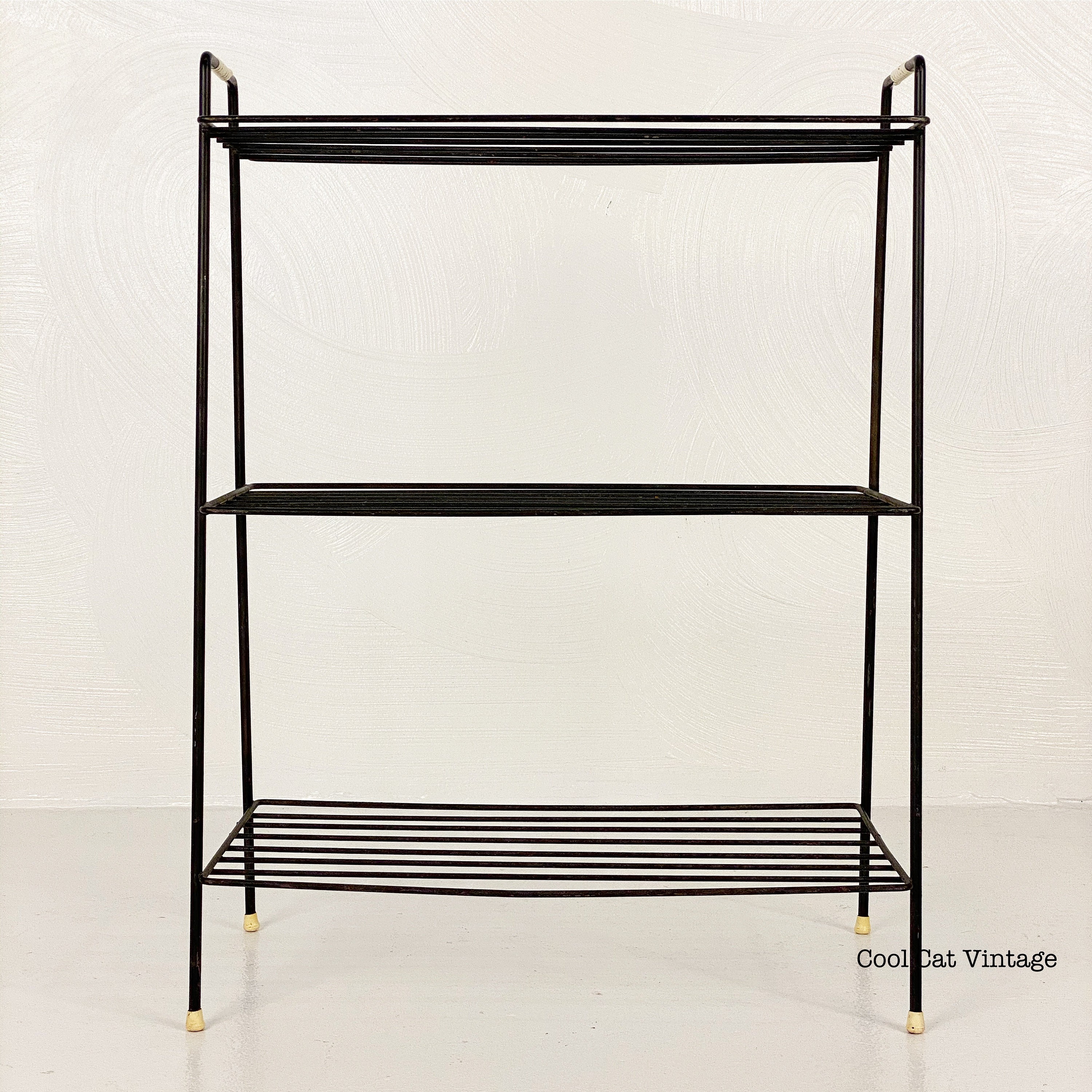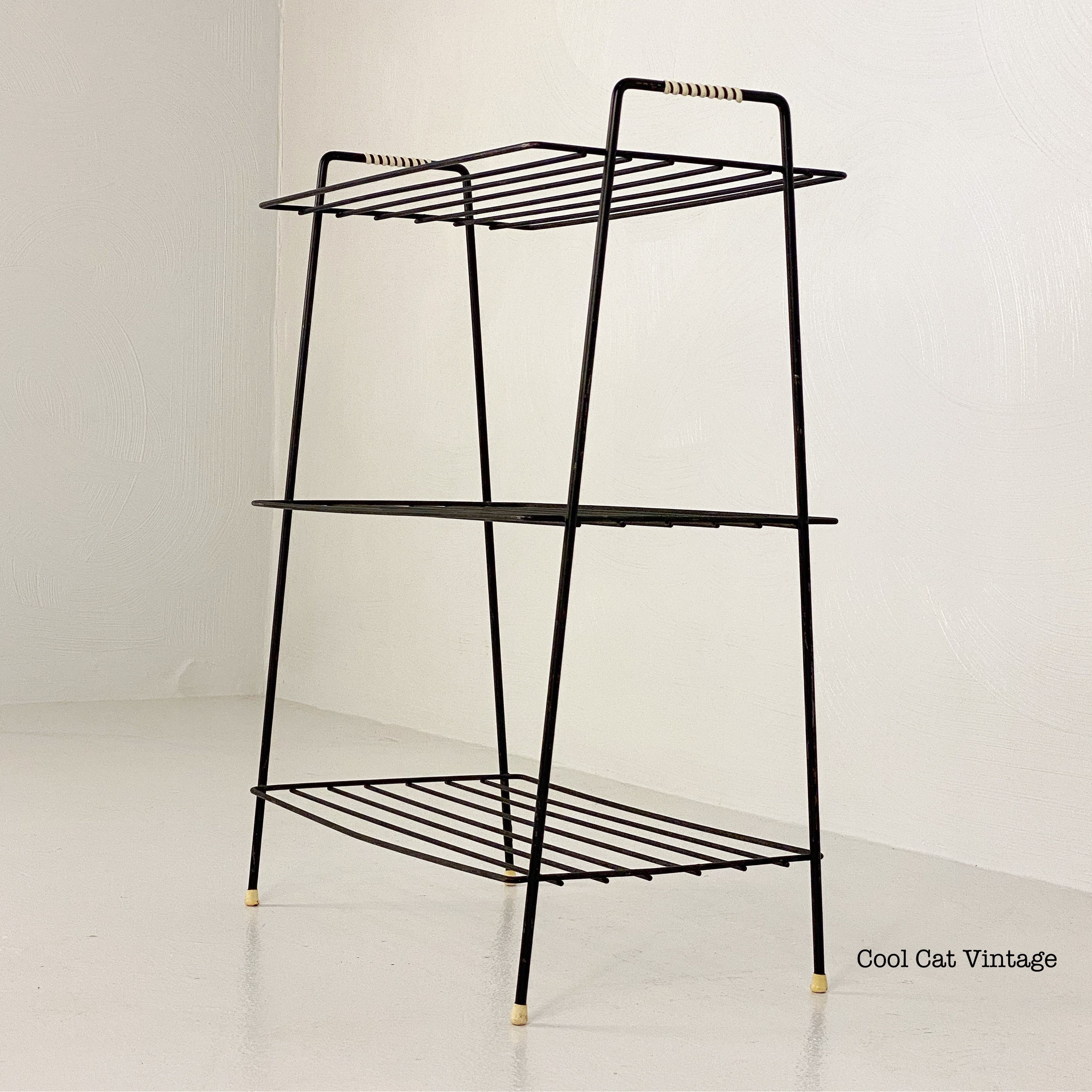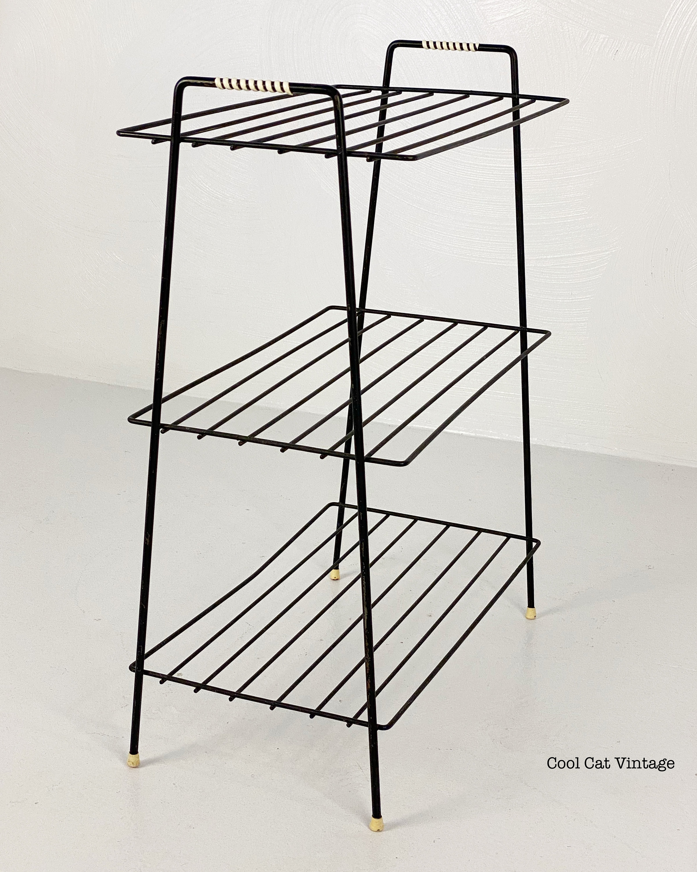 Here is a nicely preserved mid century modern black iron 3 level storage rack/plant stand from the 1960s. This piece has white leg tips and a serial wrap white plastic accent on both top handles. This piece is in good structural condition with minimal signs of wear from use.