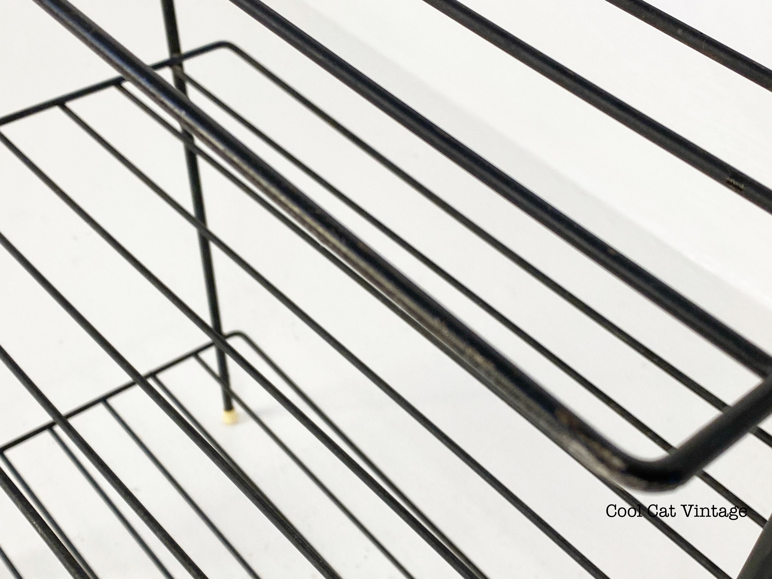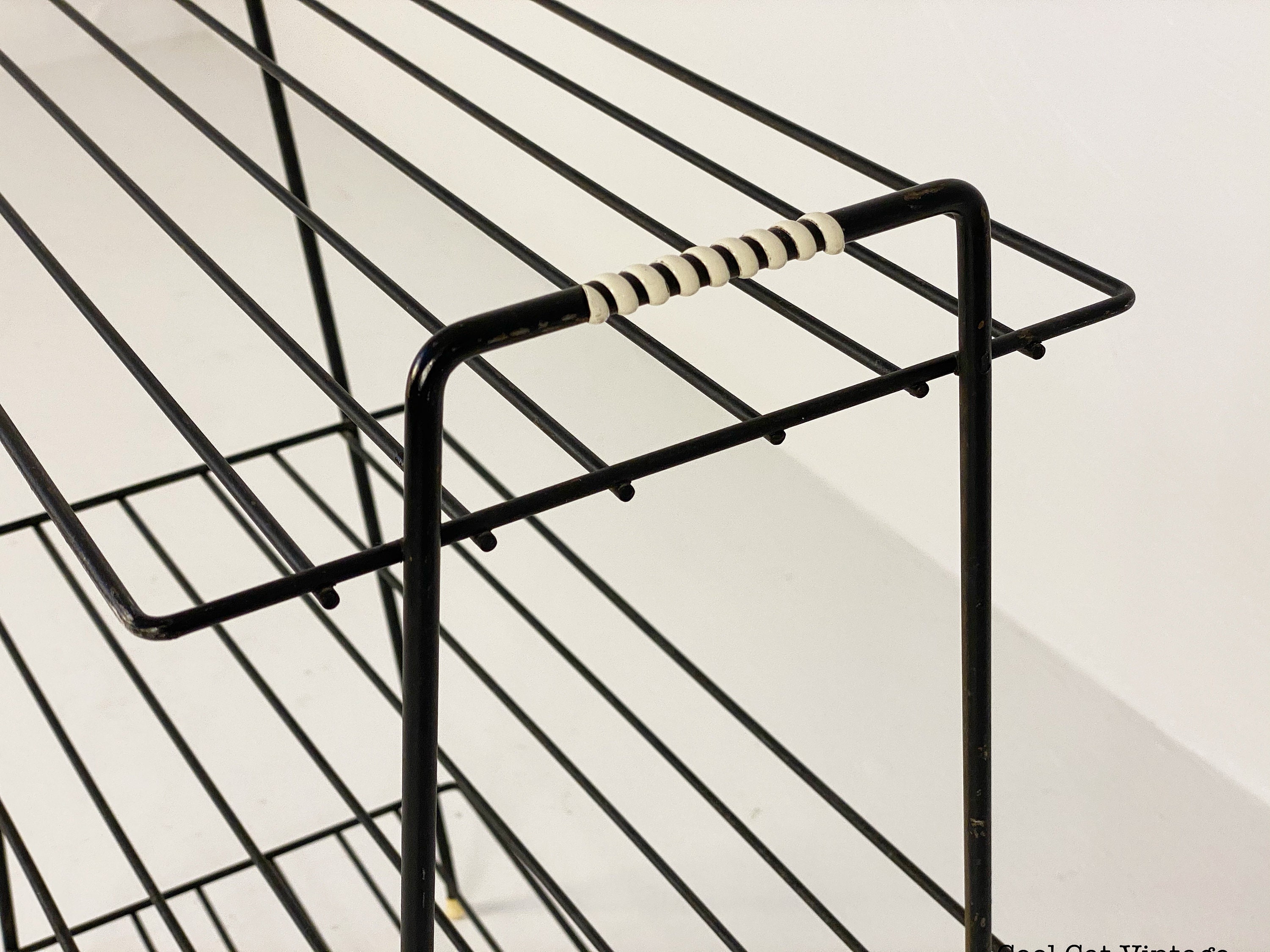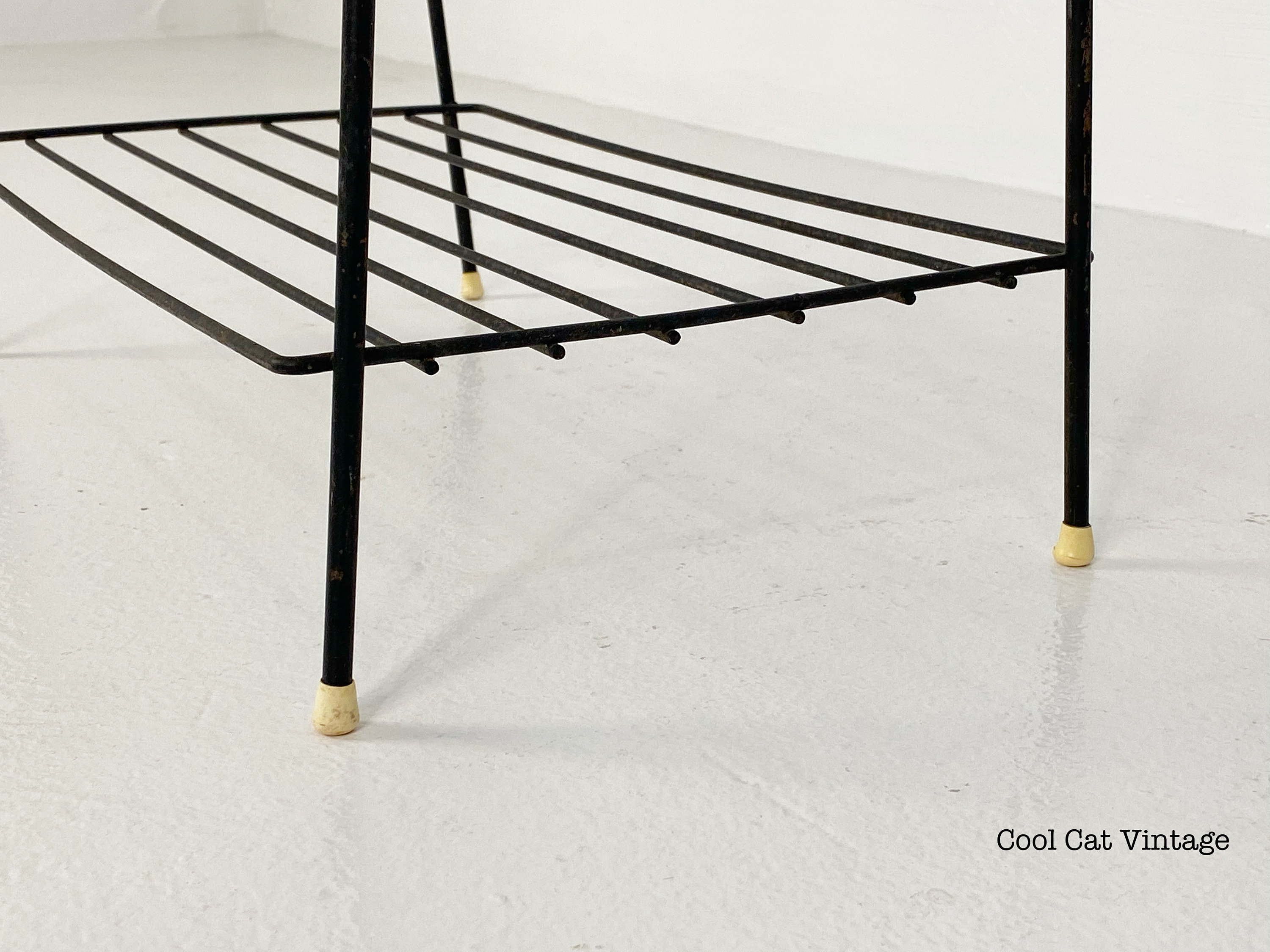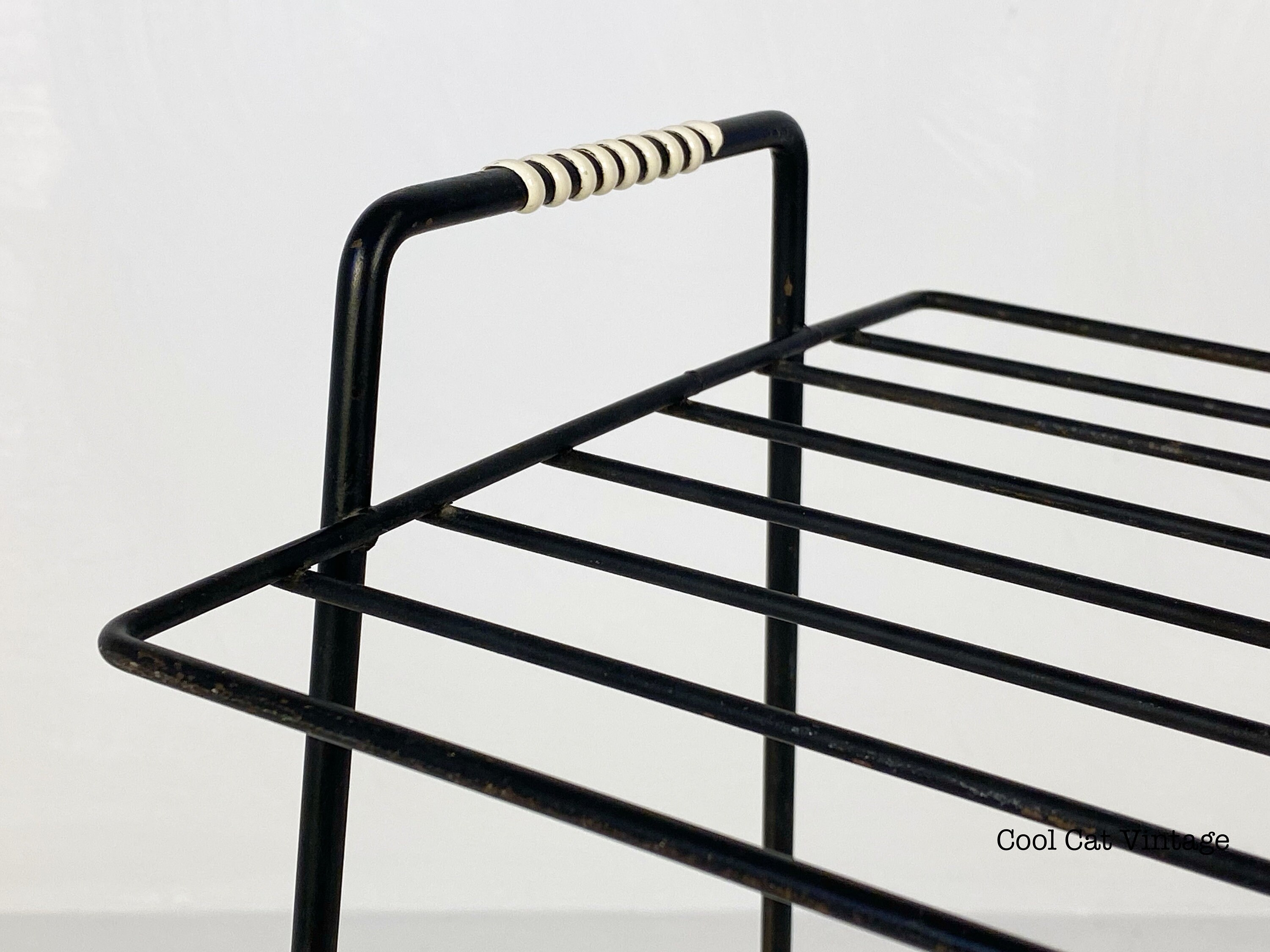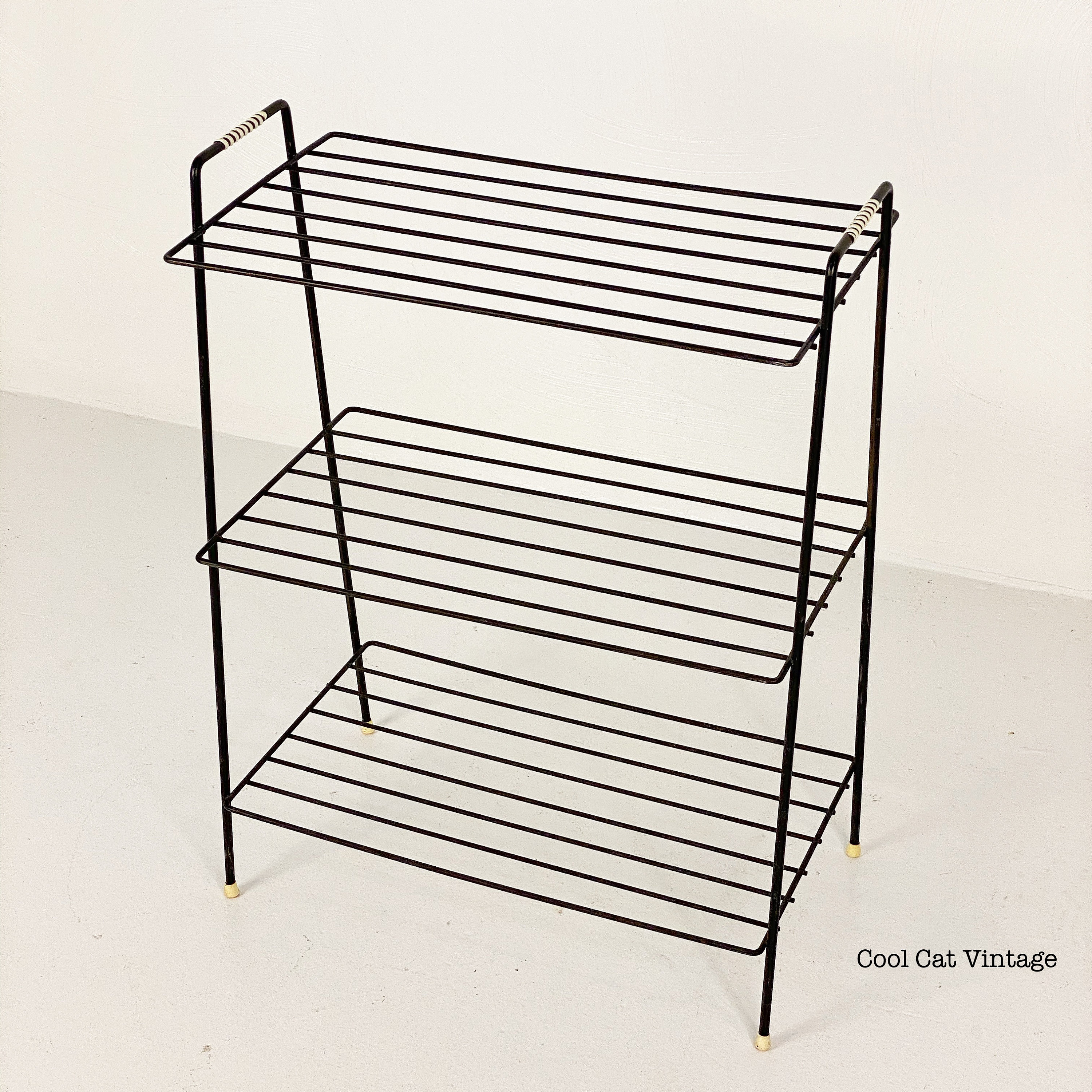 Here is a nicely preserved mid century modern black iron 3 level storage rack/plant stand from the 1960s. This piece has white leg tips and a serial wrap white plastic accent on both top handles. This piece is in good structural condition with minimal signs of wear from use.